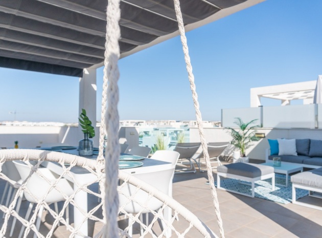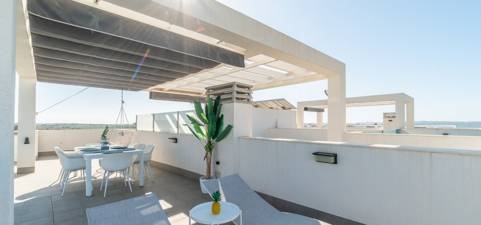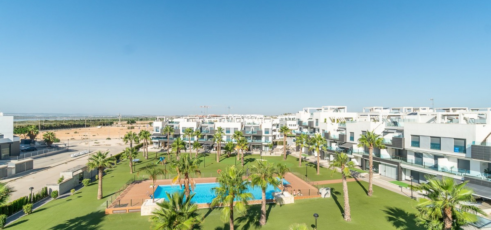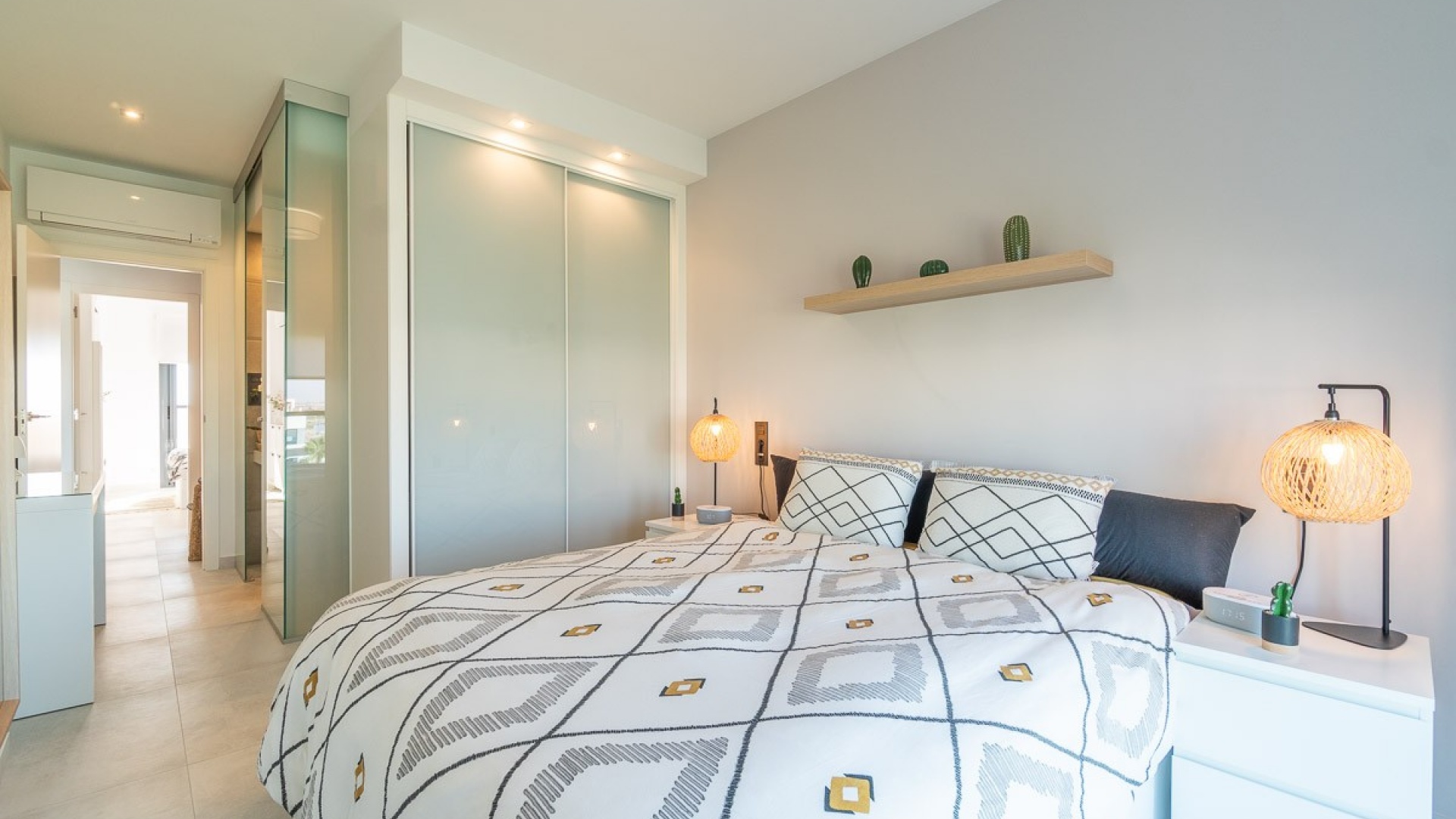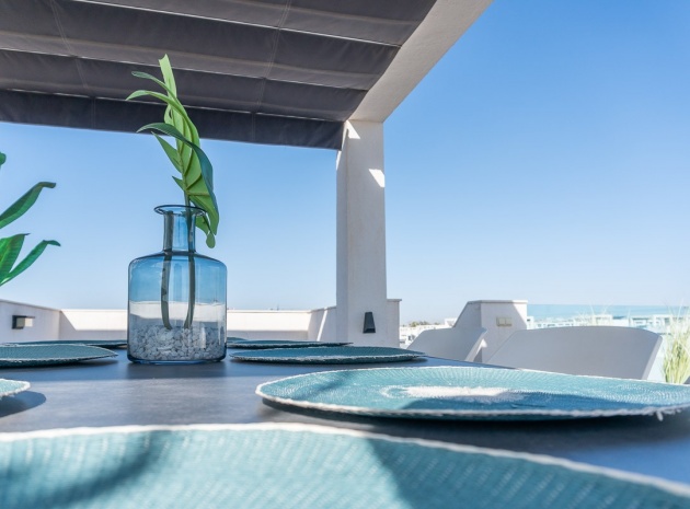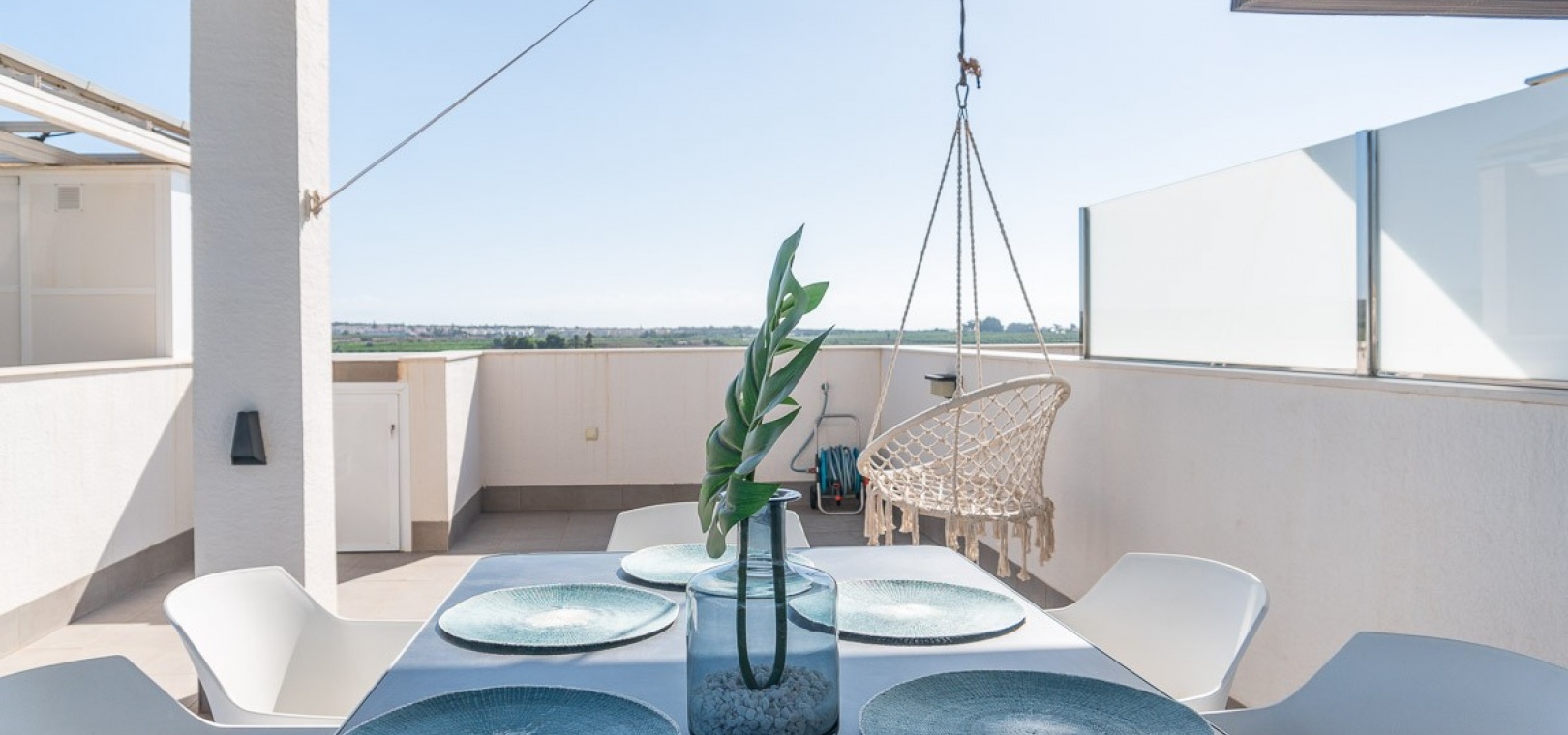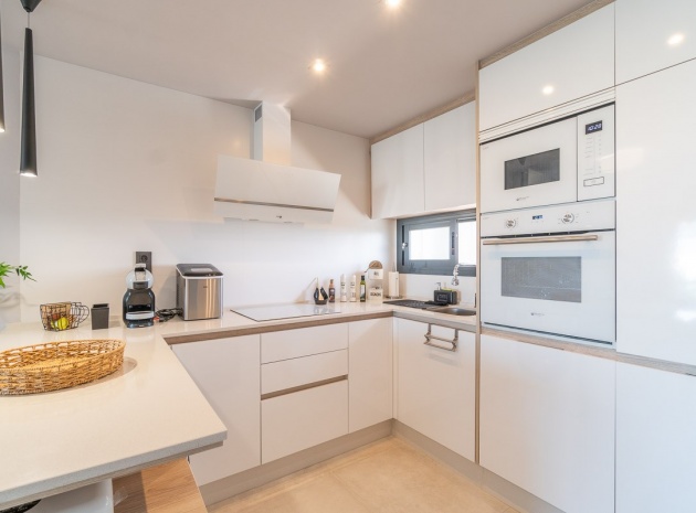 L'appartement est entièrement meublé dans un style contemporain, avec des meubles aux lignes épurées et des tons neutres qui apportent élégance et fonctionnalité. Depuis le salon, vous pouvez accéder à une terrasse privée, idéale pour profiter du climat méditerranéen et de la vue sur les espaces communs. De plus, la propriété dispose d'un solarium exclusif à l'étage supérieur, offrant un espace extérieur supplémentaire parfait pour se détendre, bronzer ou profiter de repas en plein air en toute intimité.