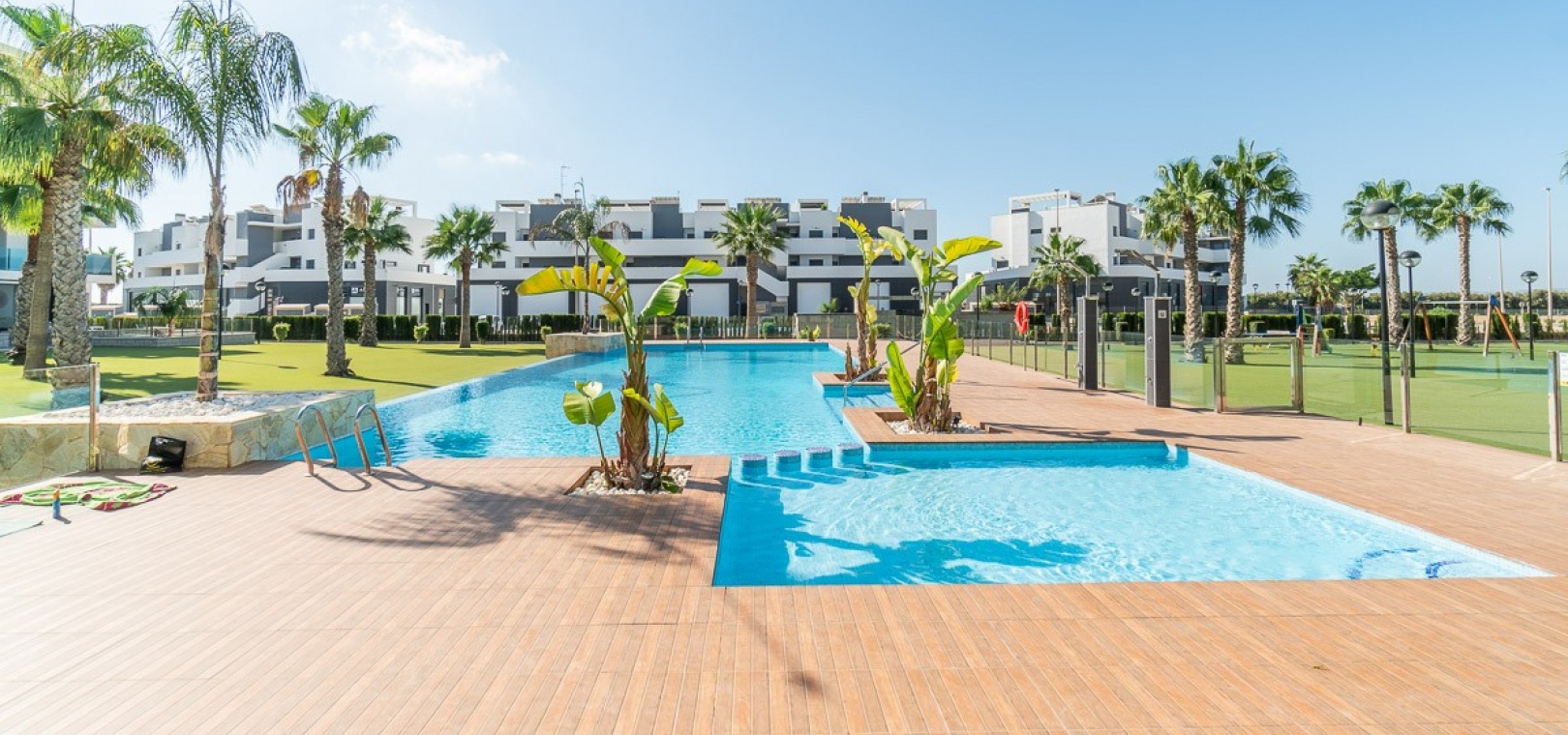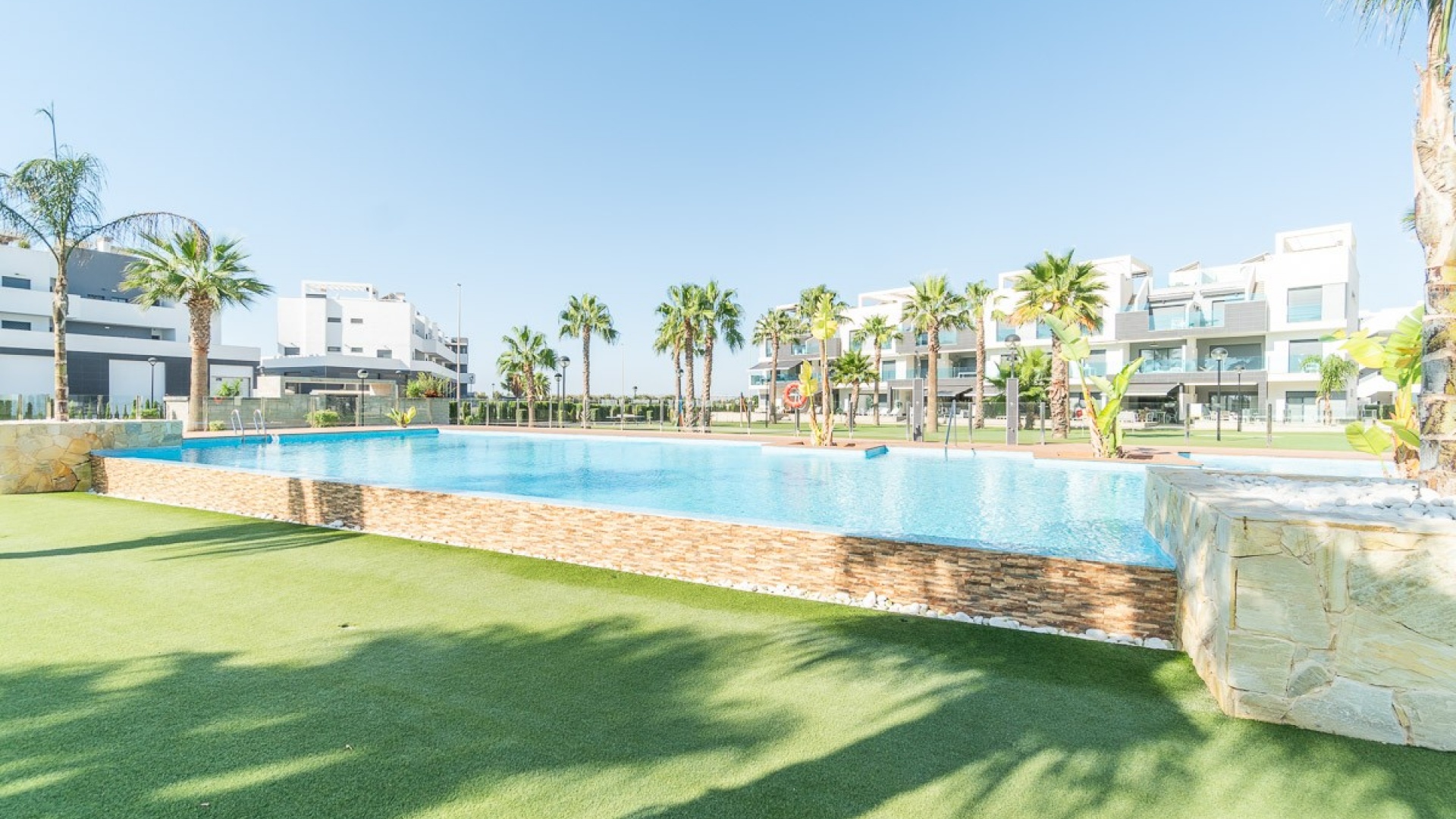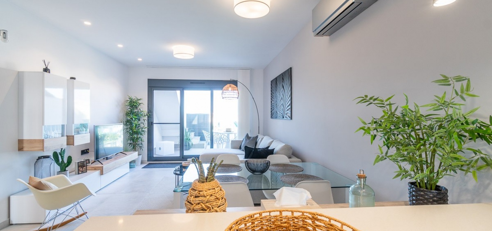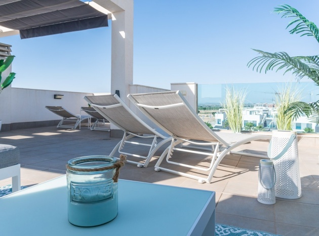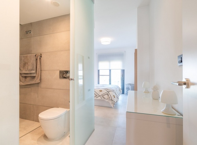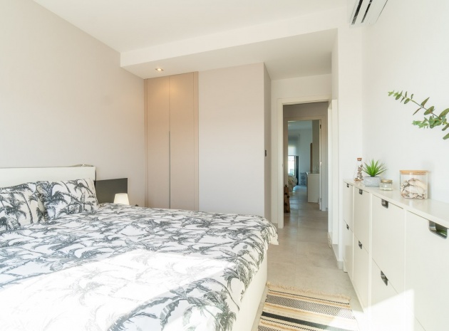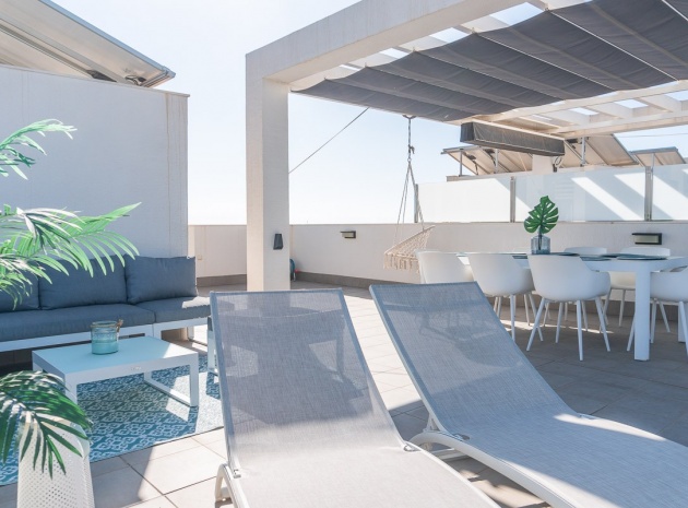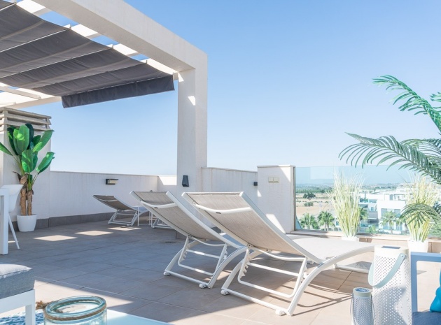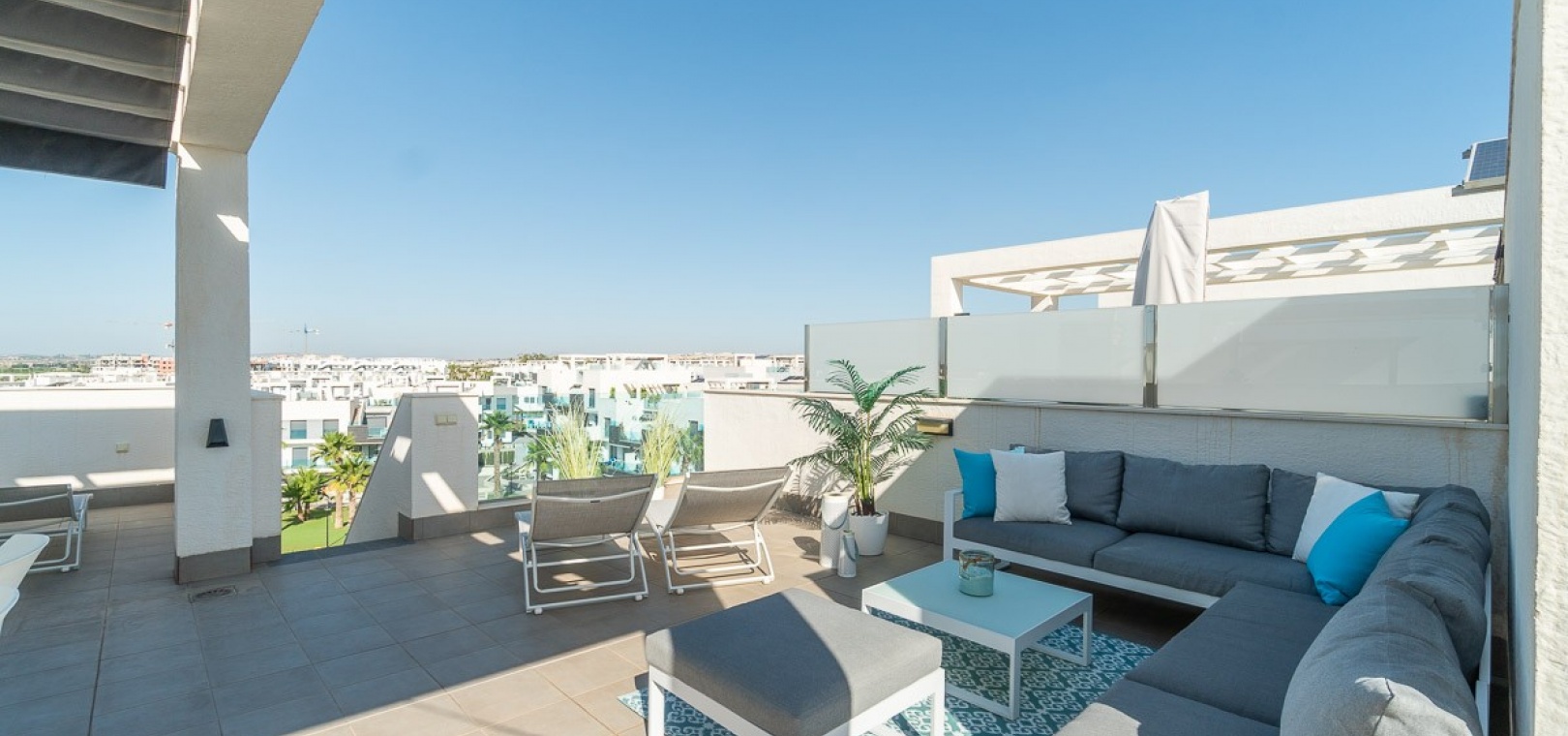 L'appartement est entièrement meublé dans un style contemporain, avec des meubles aux lignes épurées et des tons neutres qui apportent élégance et fonctionnalité. Depuis le salon, vous pouvez accéder à une terrasse privée, idéale pour profiter du climat méditerranéen et de la vue sur les espaces communs. De plus, la propriété dispose d'un solarium exclusif à l'étage supérieur, offrant un espace extérieur supplémentaire parfait pour se détendre, bronzer ou profiter de repas en plein air en toute intimité.