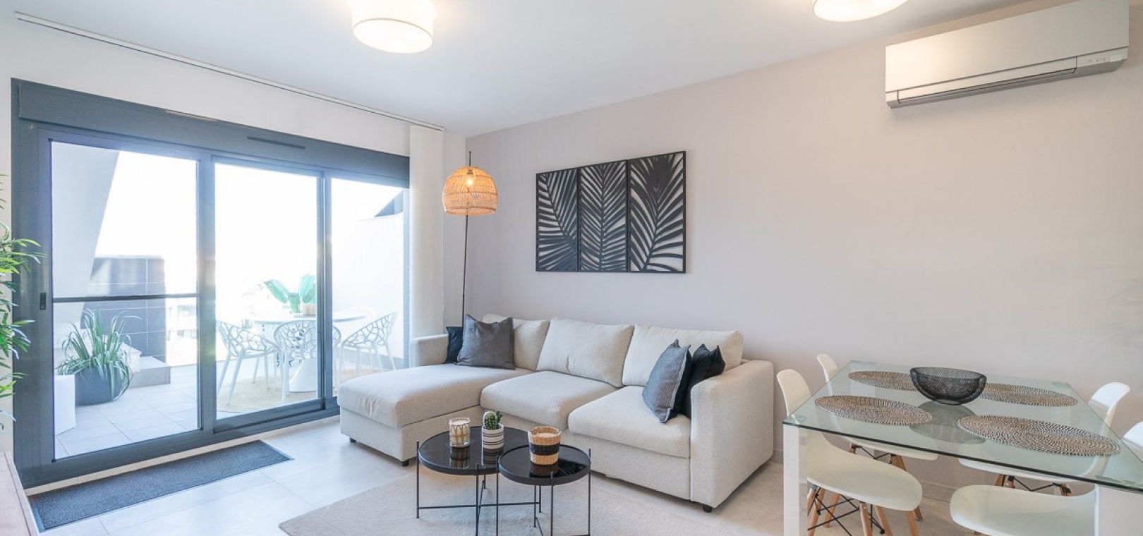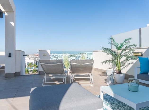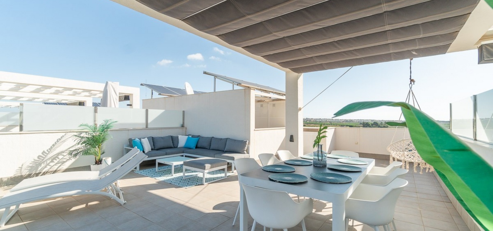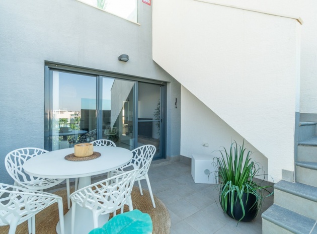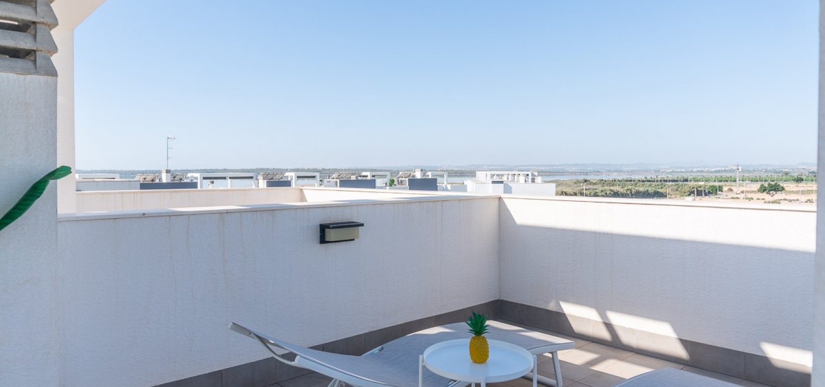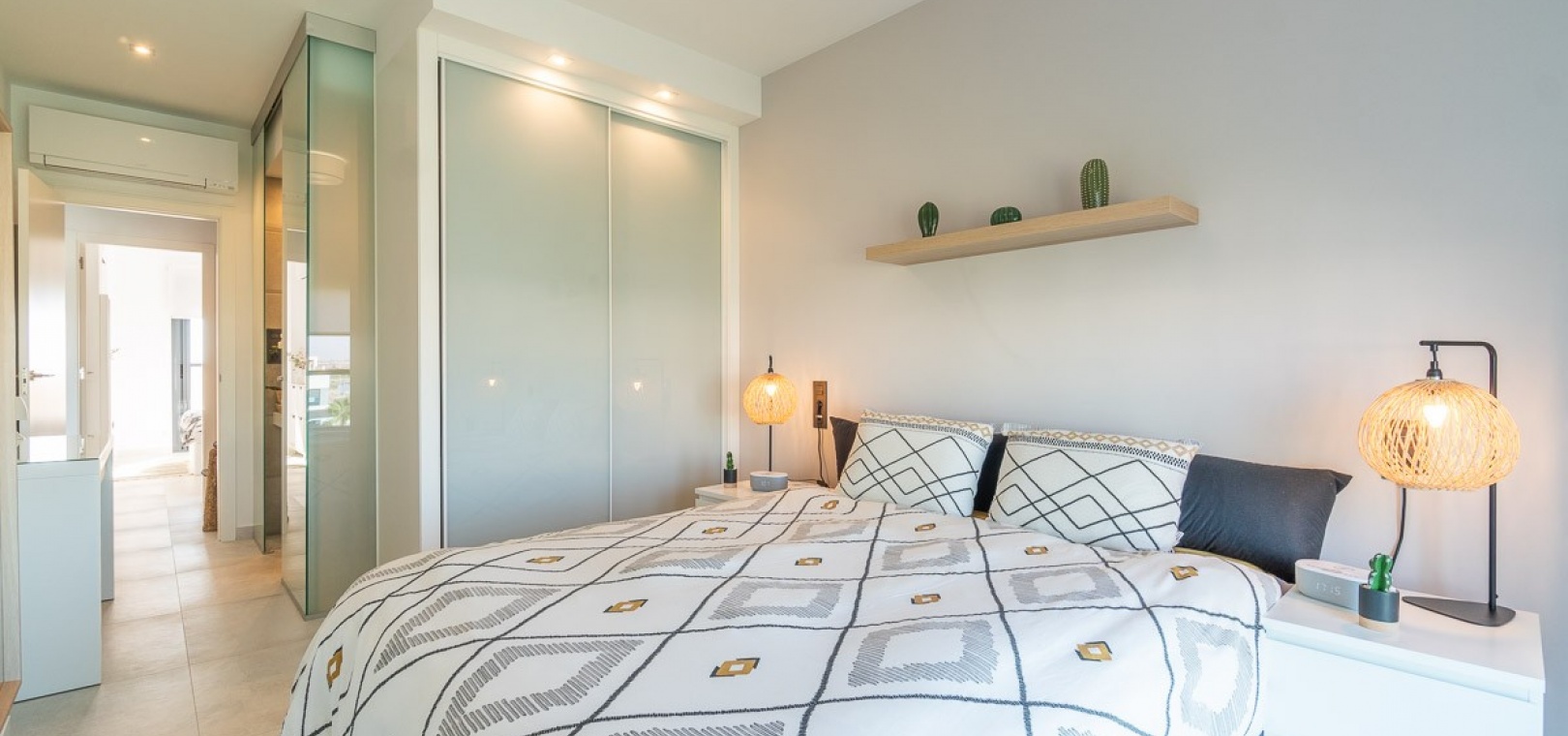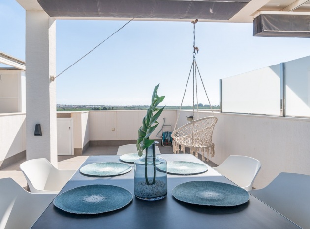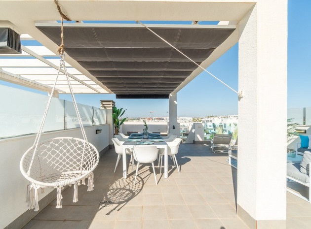 L'appartement est entièrement meublé dans un style contemporain, avec des meubles aux lignes épurées et des tons neutres qui apportent élégance et fonctionnalité. Depuis le salon, vous pouvez accéder à une terrasse privée, idéale pour profiter du climat méditerranéen et de la vue sur les espaces communs. De plus, la propriété dispose d'un solarium exclusif à l'étage supérieur, offrant un espace extérieur supplémentaire parfait pour se détendre, bronzer ou profiter de repas en plein air en toute intimité.