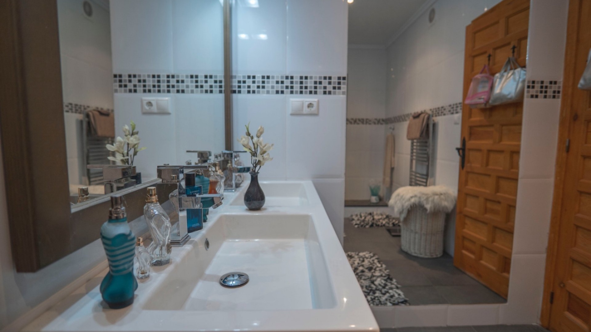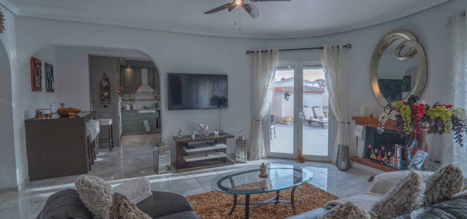 Grand salon/salle à manger avec cheminée, cuisine ouverte, 3 chambres doubles toutes avec placards intégrés, la chambre principale dispose d'une salle de douche attenante et 1 salle de douche invités.