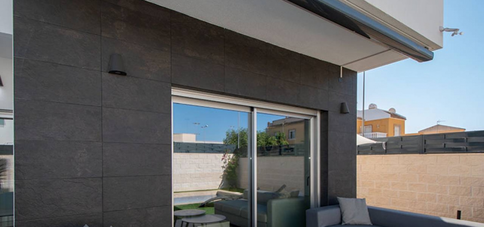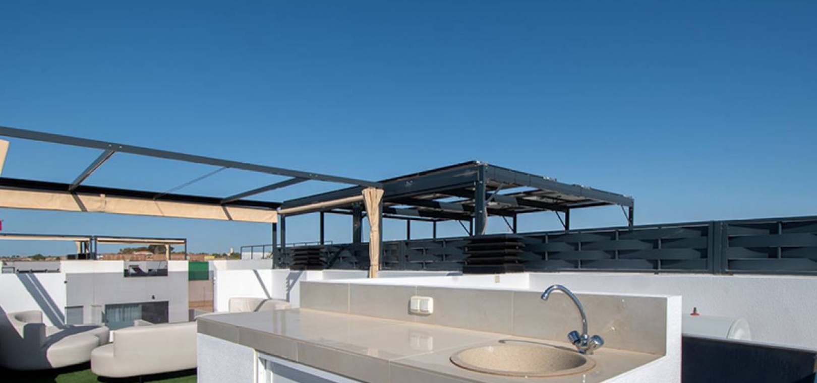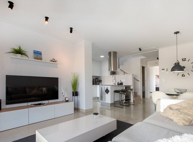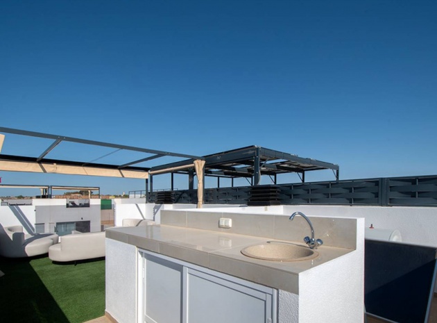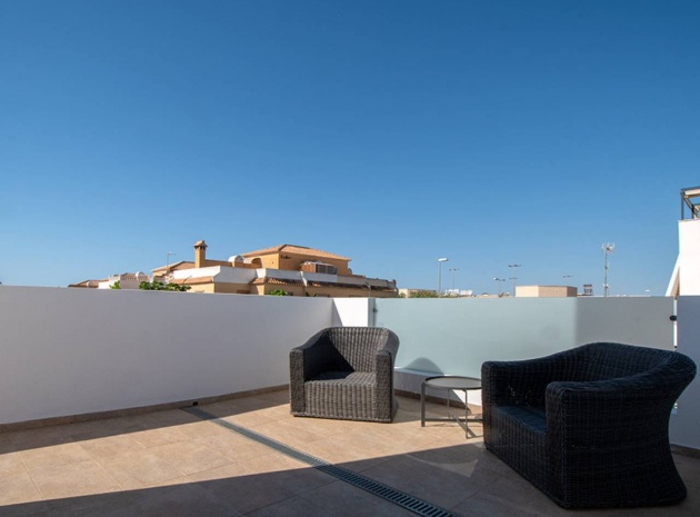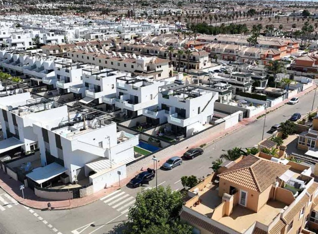 Villa mitoyenne prête à emménager dans le quartier résidentiel prisé de Ciudad Quesada à Rojales. À seulement 10 minutes en voiture des plages spectaculaires de Guardamar et Torrevieja, et à proximité du magnifique parc naturel des Lagunes de La Mata, elle offre tous les services essentiels du quotidien, tels que supermarchés, banques, pharmacies, bars et restaurants. L'aéroport d'Alicante est à seulement 45 minutes en voiture. Magnifiquement présentée, cette maison est répartie sur deux étages avec solarium. Elle comprend 3 chambres, 2 salles de bains (dont une attenante) et des toilettes invités. Spacieuse et lumineuse, la pièce à vivre réunit cuisine, salle à manger et salon en un seul espace, donnant sur une terrasse exposée sud-ouest avec piscine privée et coin repas extérieur. La chambre principale avec salle de bains privative se trouve au rez-de-chaussée, tandis que les deux autres chambres et la salle de bains commune se trouvent au premier étage. La spacieuse terrasse du premier étage mène au solarium, l'endroit idéal pour profiter du climat de la Costa Blanca, avec son espace salon couvert d'une pergola et de gazon artificiel, ainsi que sa cuisine d'été. La maison comprend la climatisation réversible (chaud/froid), des appareils électroménagers, une piscine privée et un parking sur place. CARACTÉRISTIQUES : piscine privée, terrasse, jardin privé, parking découvert, solarium.