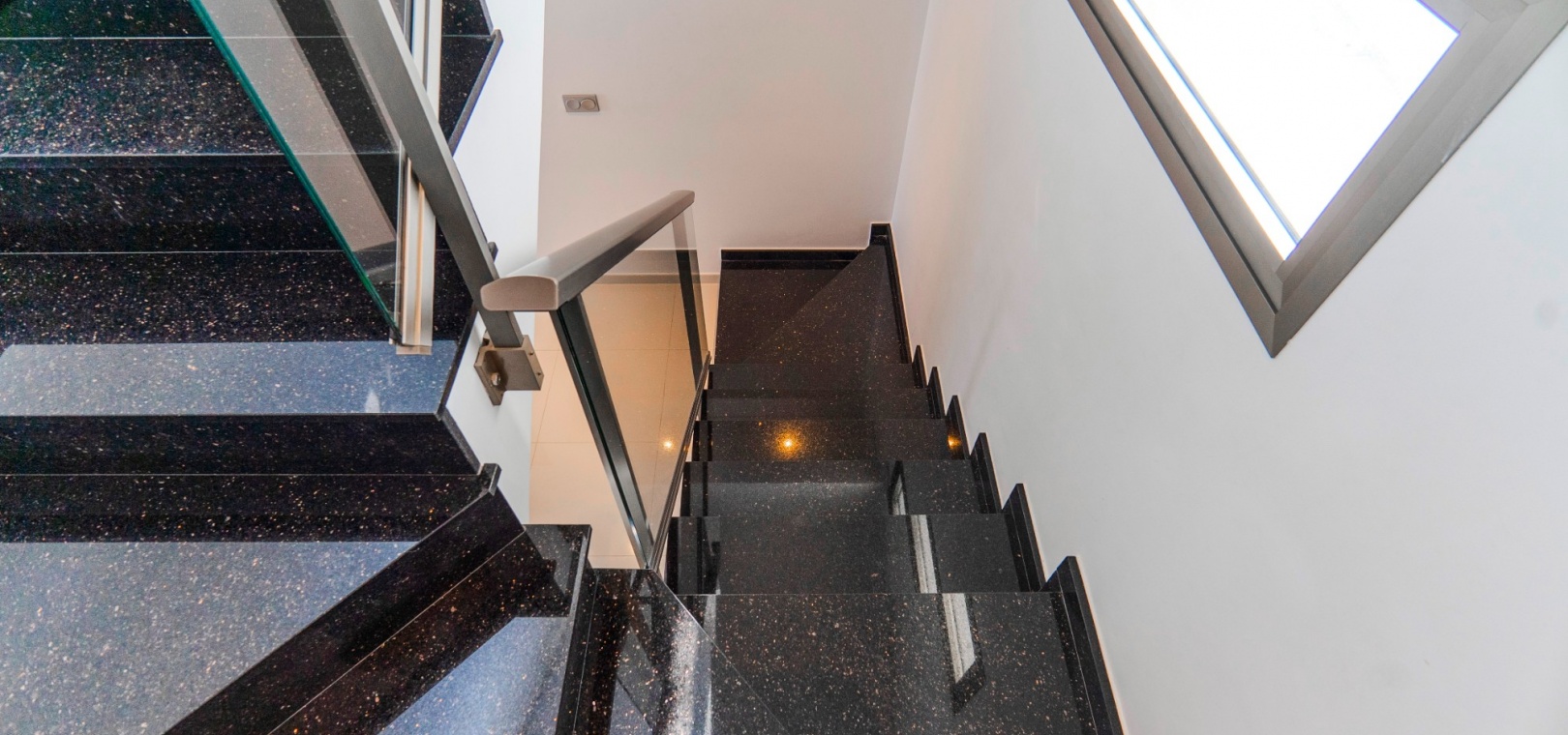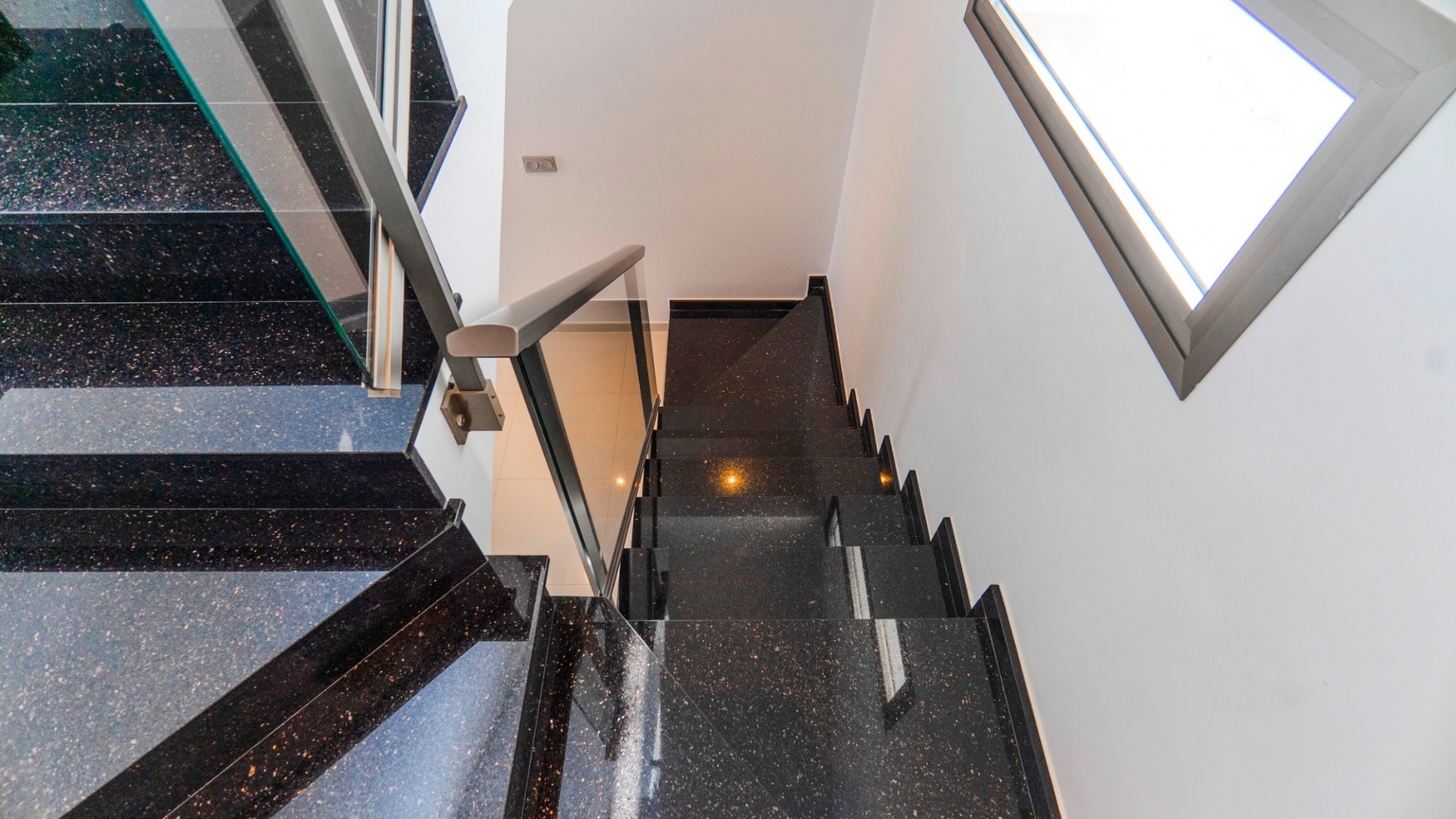 Piscine privée et espaces de divertissement – La villa comprend une piscine privée qui se connecte parfaitement à une salle de jeux et à une buanderie, assurant à la fois détente et commodité. Chambres et salle de bain au rez-de-chaussée – Deux chambres bien proportionnées, dont une exceptionnellement grande, sont situées au rez-de-chaussée, ainsi qu'une salle de bain moderne. Escalier élégant en marbre noir – Un escalier en marbre noir sophistiqué et bien conçu mène au deuxième étage, ajoutant une touche luxueuse à la propriété. Salon et cuisine ouverts – Le deuxième étage comprend un salon et une cuisine spacieux et ouverts, conçus avec des baies vitrées qui maximisent la lumière naturelle et offrent des vues ininterrompues. Un coin salon sur le balcon prolonge l'espace de vie extérieur.Chambre avec balcon privé - À ce niveau se trouve également une chambre double avec son propre balcon privé, accompagnée d'une salle de bains contemporaine.Suite principale au dernier étage - Le dernier étage abrite une grande chambre double avec une salle de bains privative, dotée de portes-fenêtres en verre qui s'ouvrent sur un autre coin salon sur la terrasse privée.Solarium avec des vues spectaculaires - La terrasse mène à un solarium, offrant l'endroit idéal pour profiter d'une vue imprenable sur le parcours de golf, les montagnes et les environs.