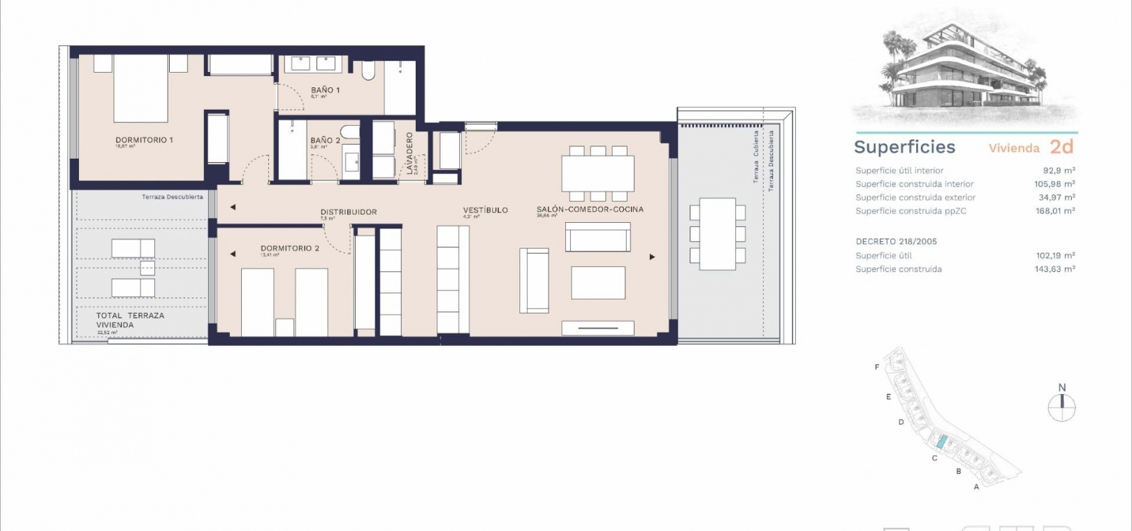 Le complexe résidentiel est conçu avec des lignes douces et élégantes et s'intègre harmonieusement dans son environnement naturel. Il offre un total de 60 appartements dans la phase 1, disponibles avec 2 et 3 chambres à coucher. La distribution comprend
