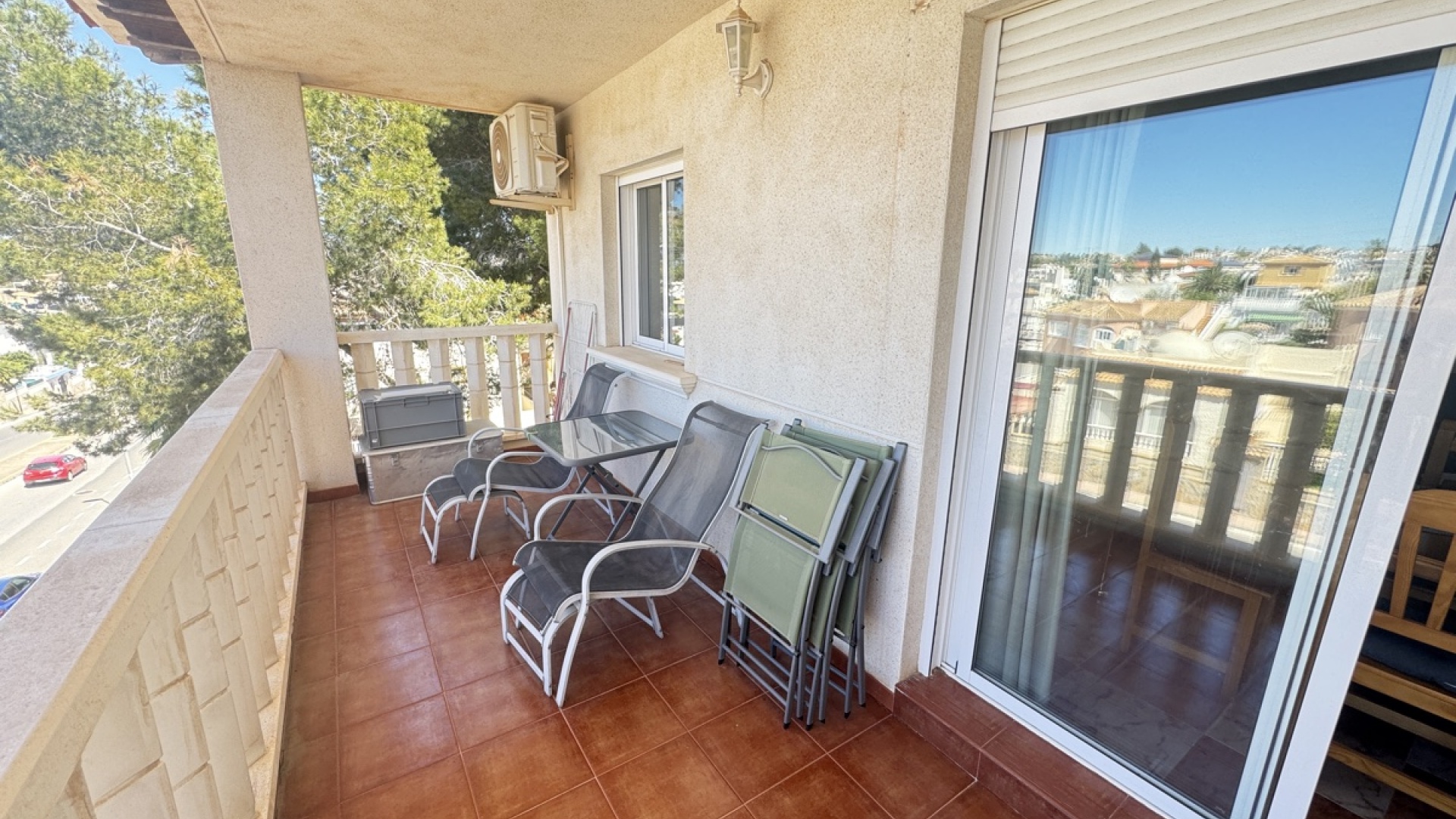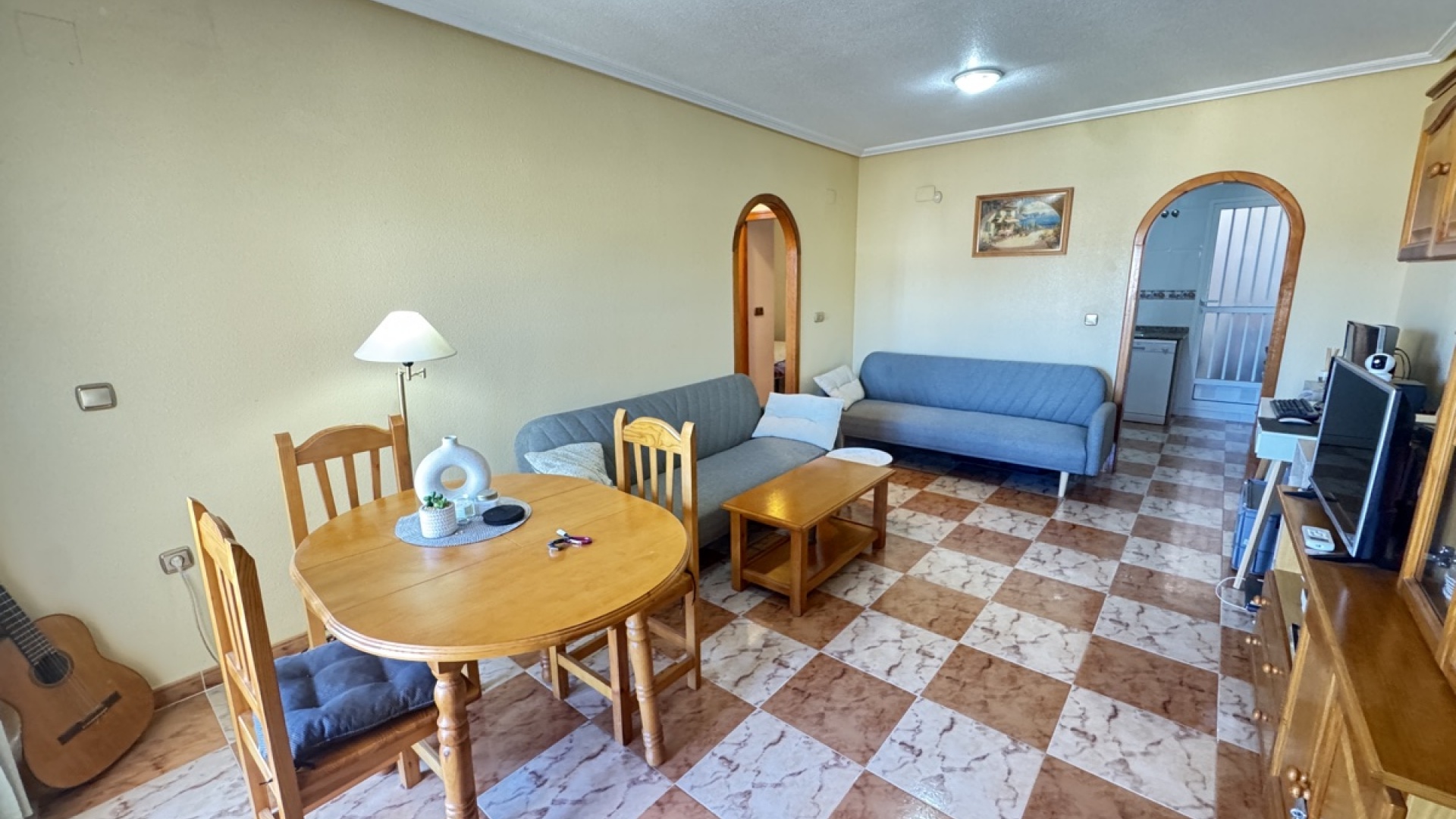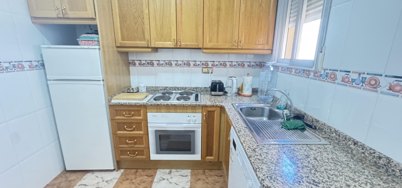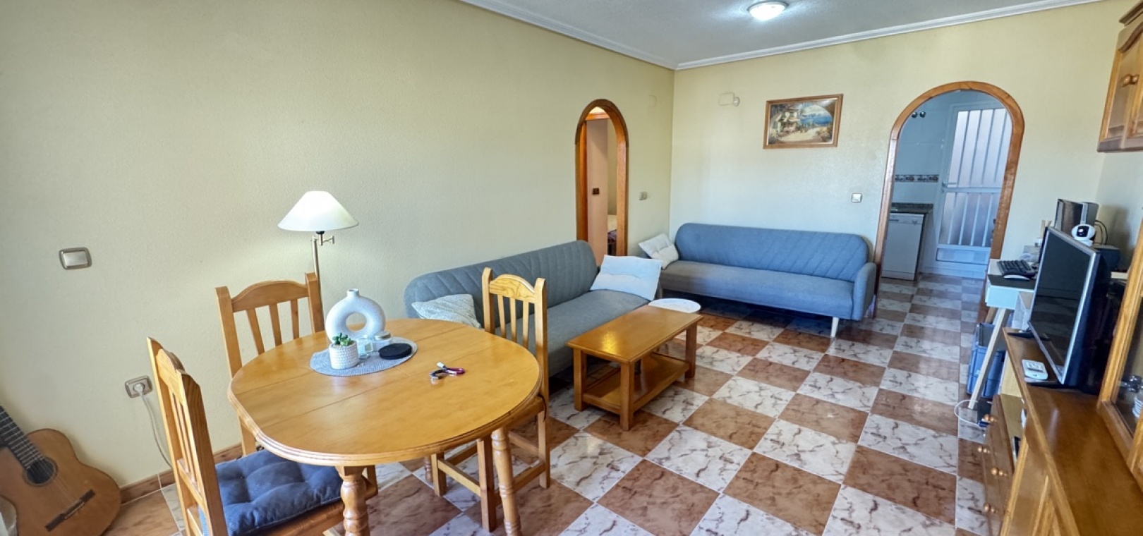 Salon/salle à manger avec climatisation chaude et froide, cuisine séparée entièrement équipée, buanderie vitrée, 2 chambres doubles, 1 salle de bain, balcon, solarium privé sur le toit, piscine commune et bien plus encore.