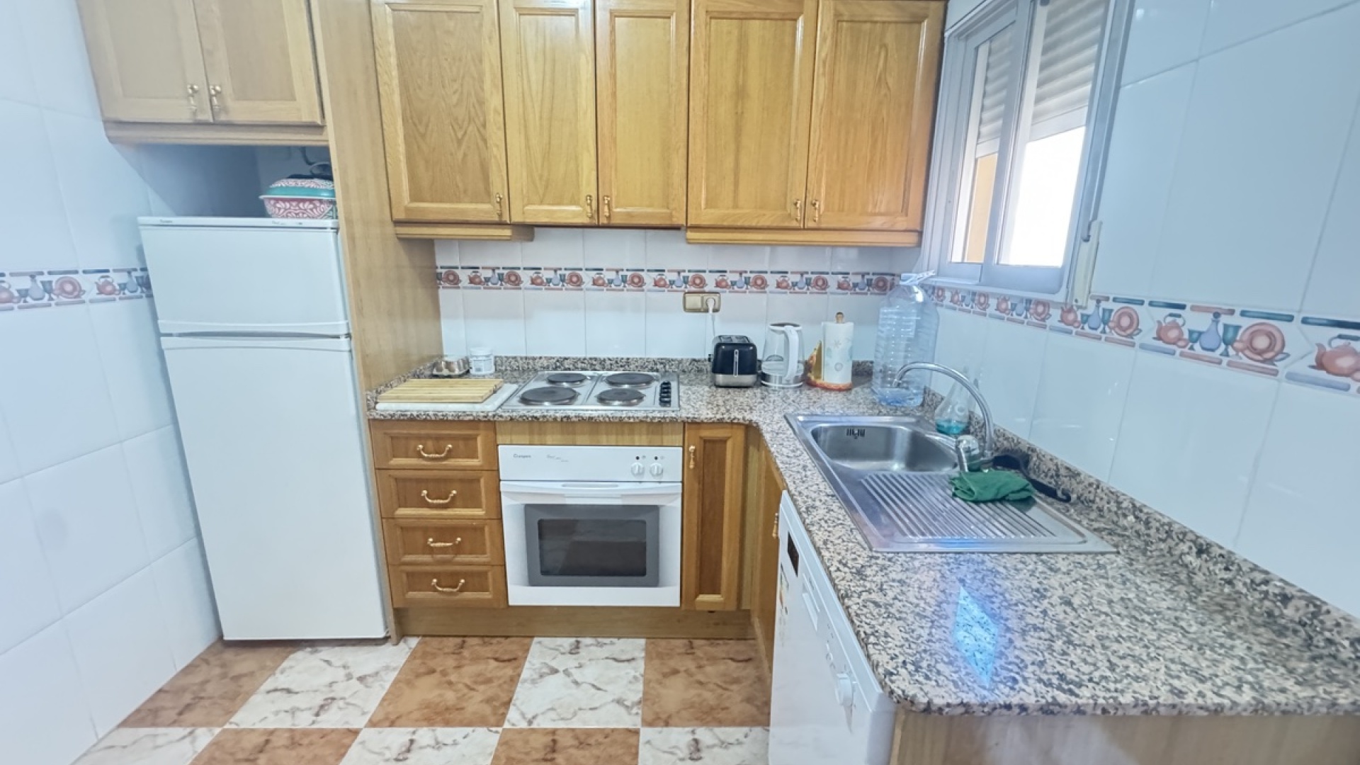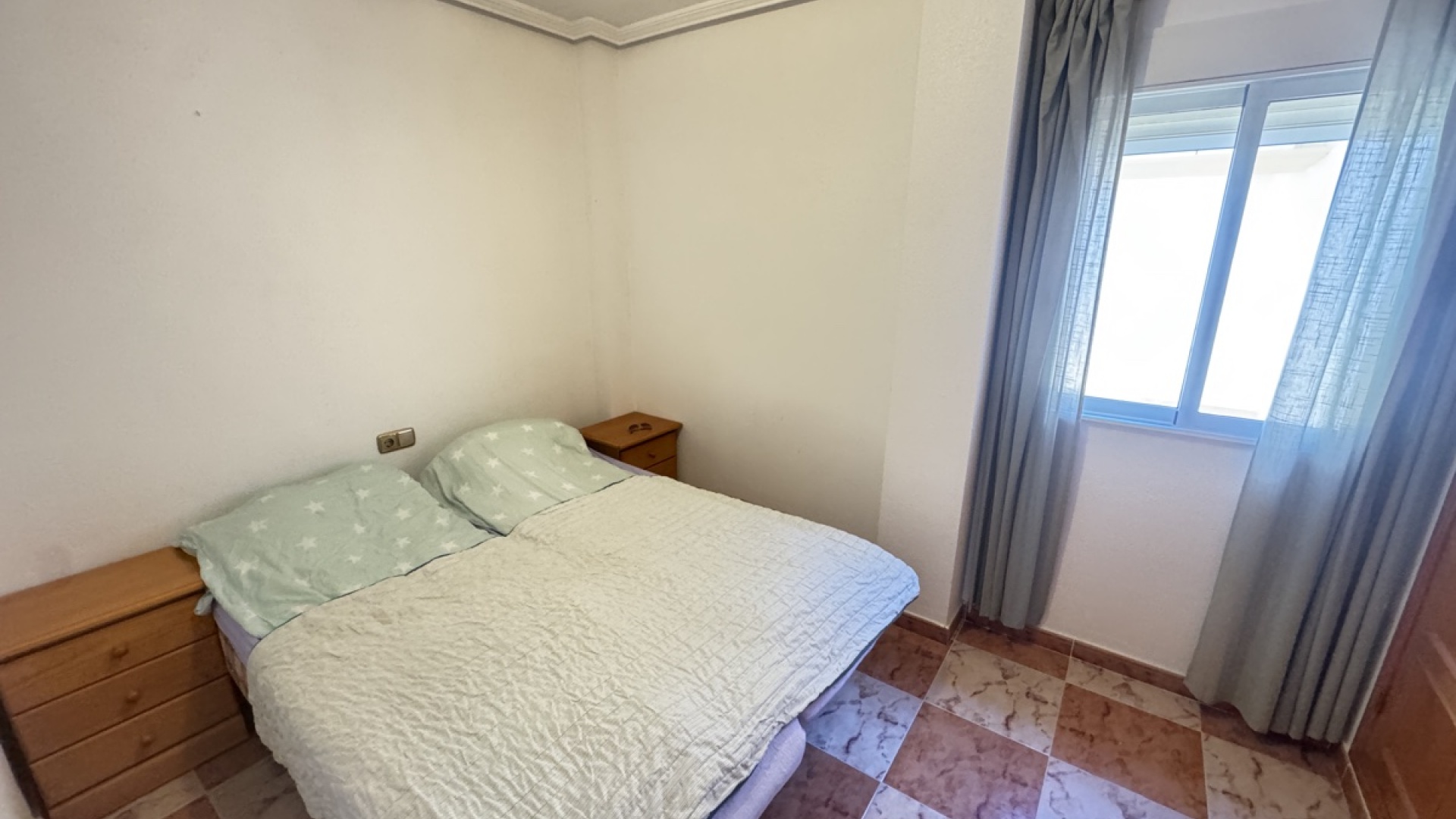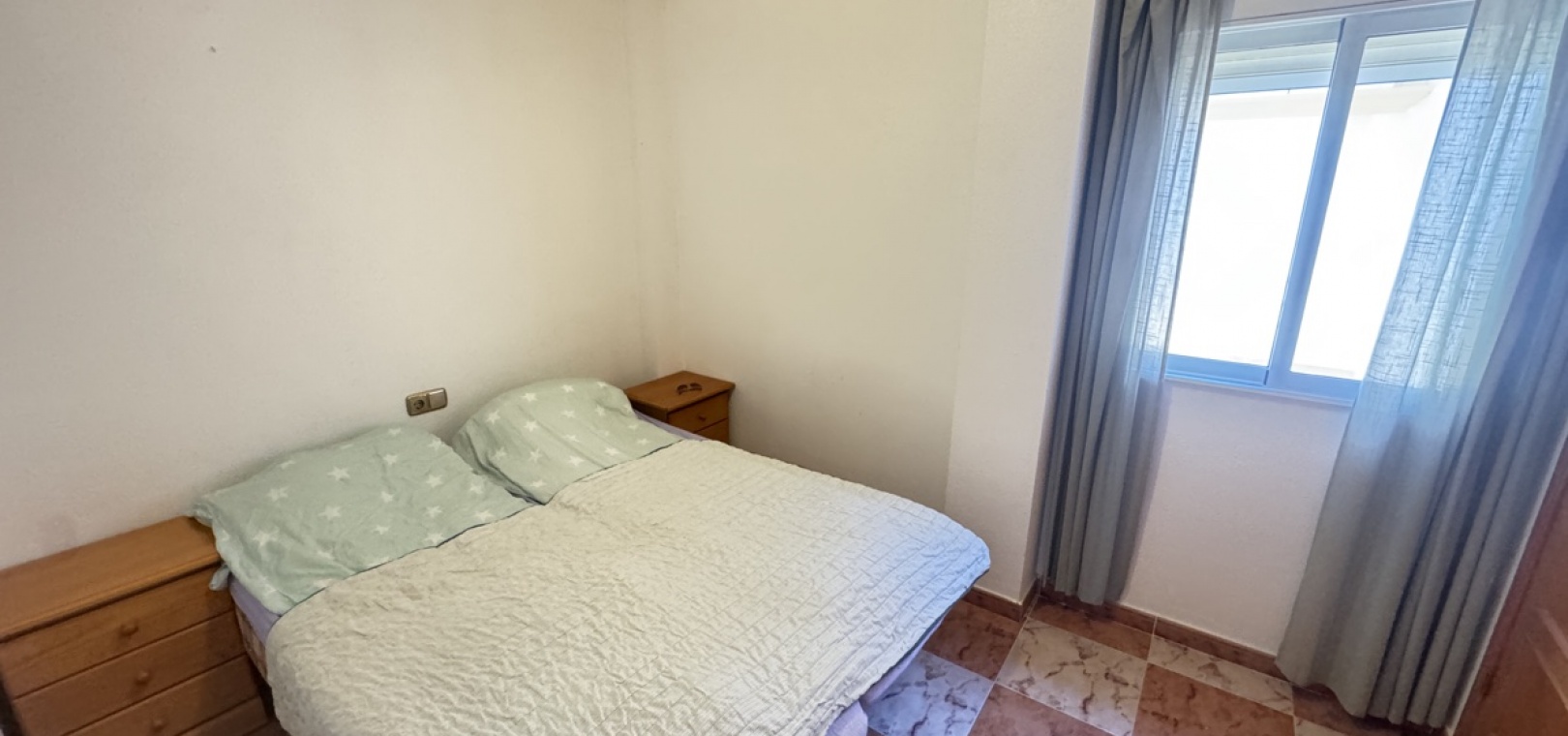 Salon/salle à manger avec climatisation chaude et froide, cuisine séparée entièrement équipée, buanderie vitrée, 2 chambres doubles, 1 salle de bain, balcon, solarium privé sur le toit, piscine commune et bien plus encore.