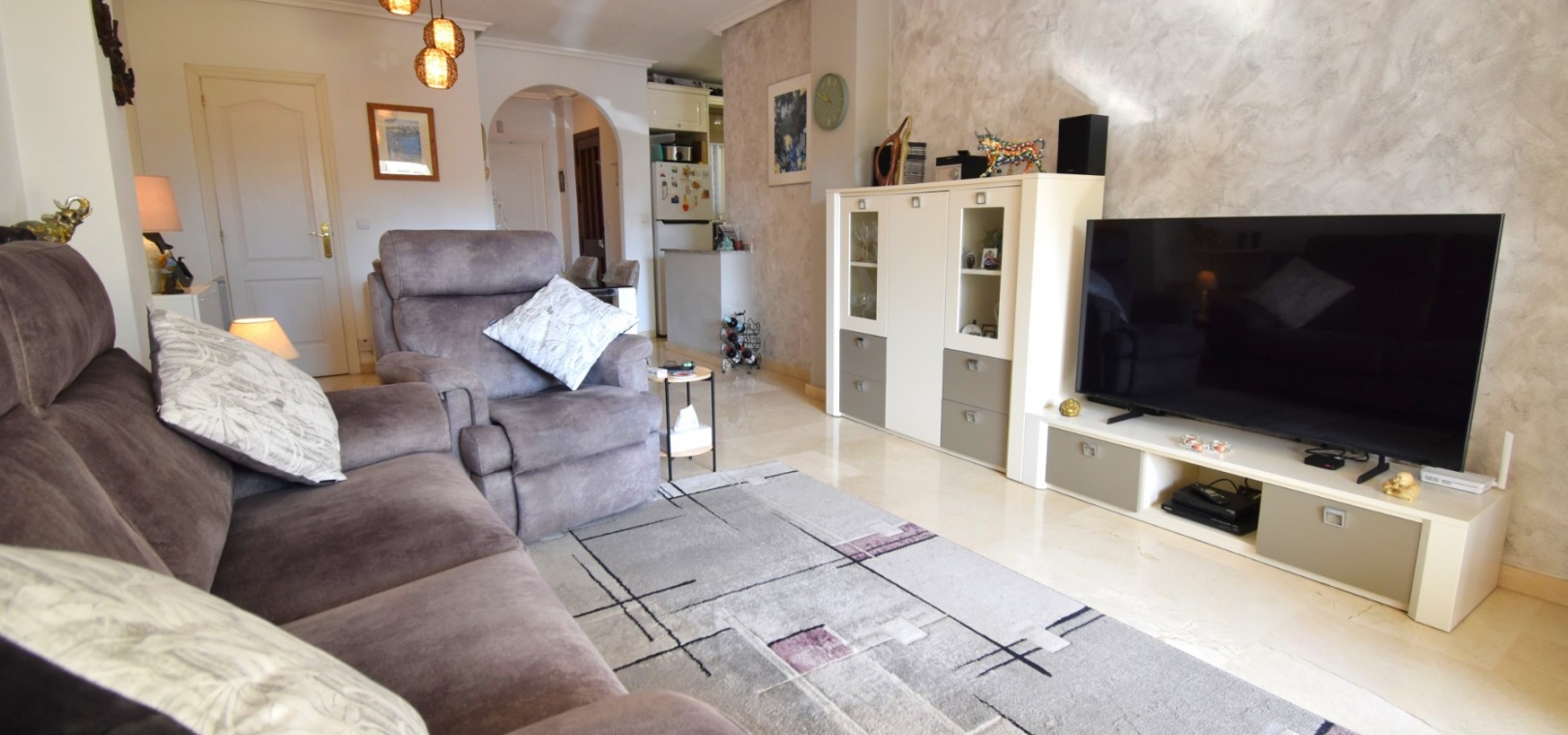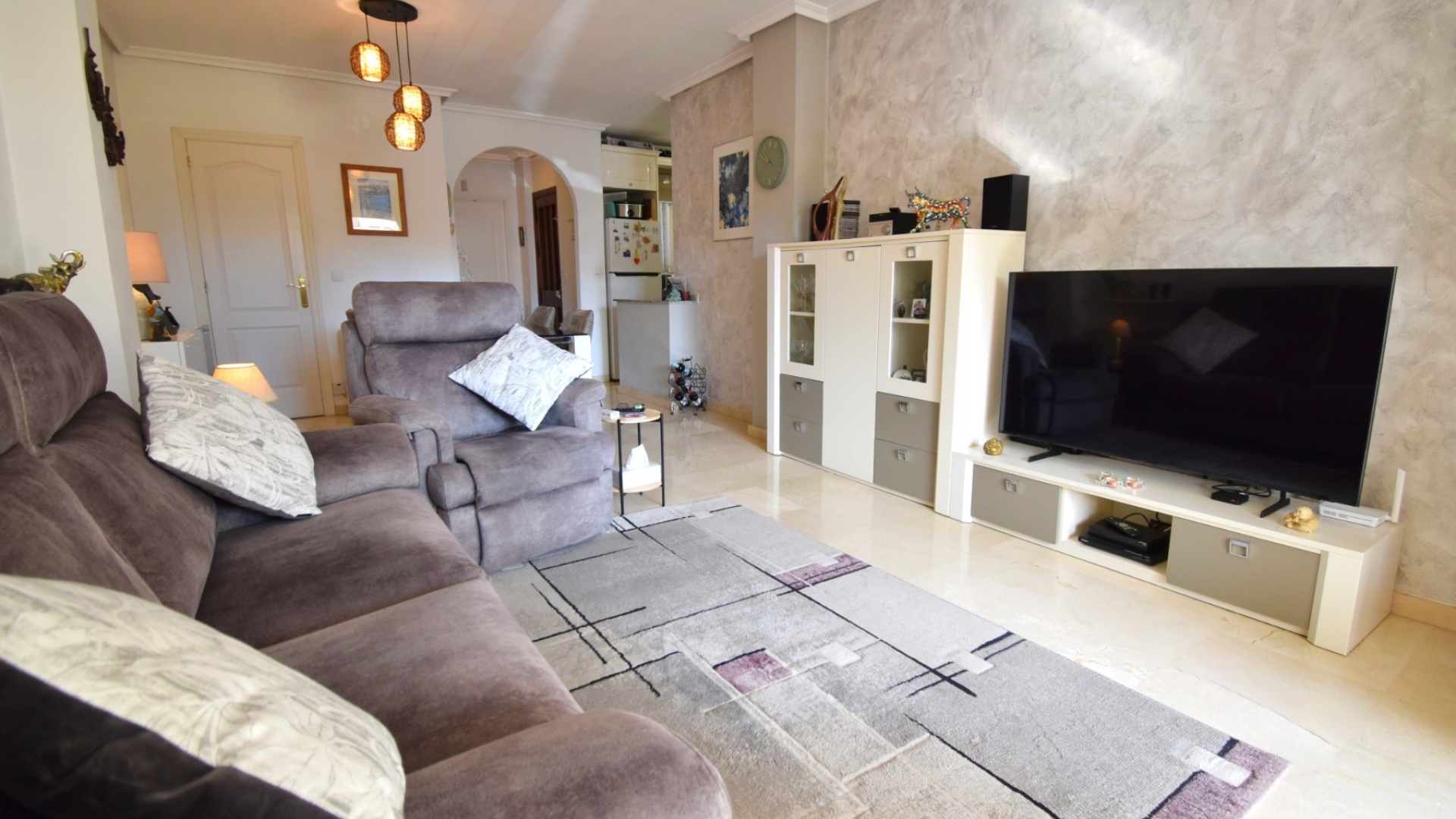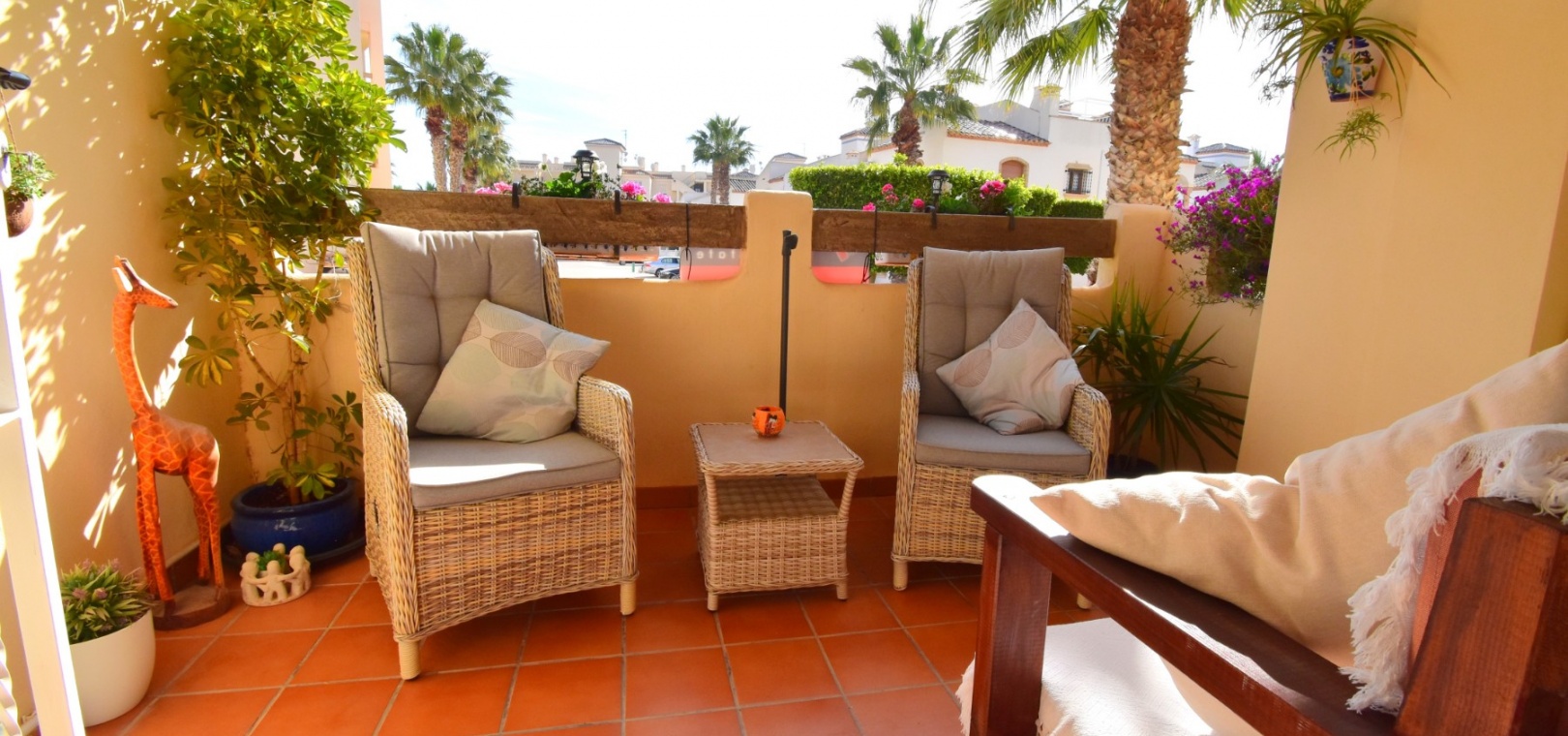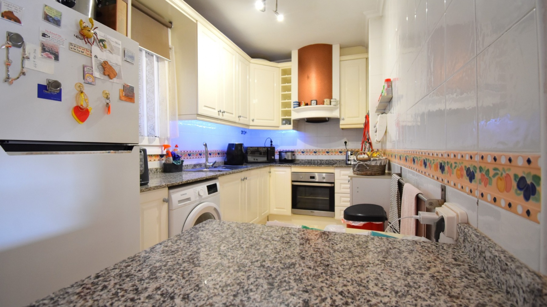 Cet appartement de deux chambres, orienté à l'ouest, au rez-de-chaussée à Playa Flamenca, est situé dans un quartier très prisé de la Costa Blanca Sud, à seulement 5 minutes à pied de nombreux bars et restaurants. Les superbes plages, le centre commercial La Zenia Boulevard et les principaux supermarchés sont tous accessibles en seulement 5 minutes en voiture, ce qui en fait un emplacement idéal pour les vacanciers comme pour les résidents permanents. Cet appartement lumineux et bien entretenu comprend une entrée donnant sur un spacieux salon/salle à manger, où des portes-fenêtres coulissantes à double vitrage s'ouvrent sur une charmante terrasse couverte, idéale pour se détendre en plein air. La cuisine séparée équipée offre de nombreux rangements et un espace de travail. Il comprend deux chambres doubles, toutes deux équipées de ventilateurs de plafond et de placards intégrés, tandis que la chambre principale bénéficie d'une salle de douche attenante. Une deuxième salle de douche moderne complète l'aménagement. Parmi les autres prestations, citons la climatisation, un ascenseur dans l'immeuble, un solarium commun, l'accès à des jardins communautaires bien entretenus, une piscine et un parking fermé. C'est une opportunité fantastique de devenir propriétaire d'un appartement confortable et idéalement situé au cœur de Playa Flamenca !