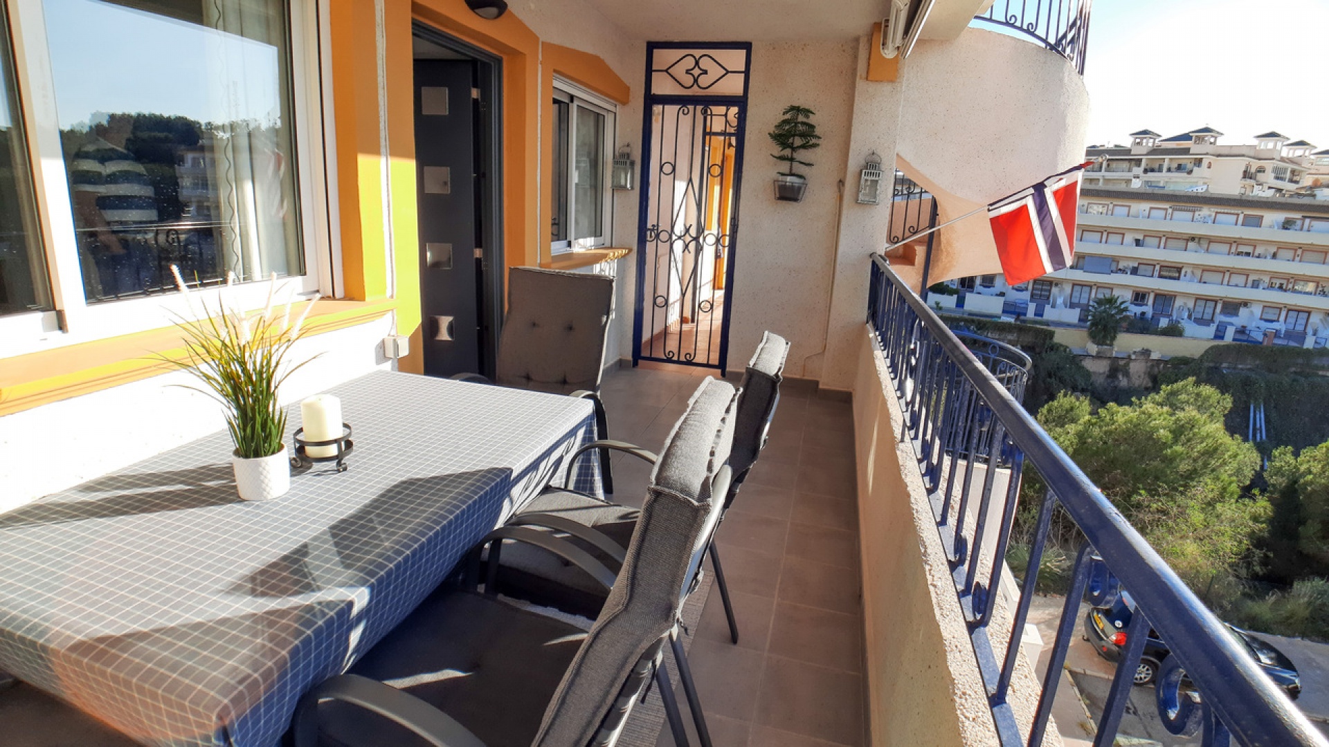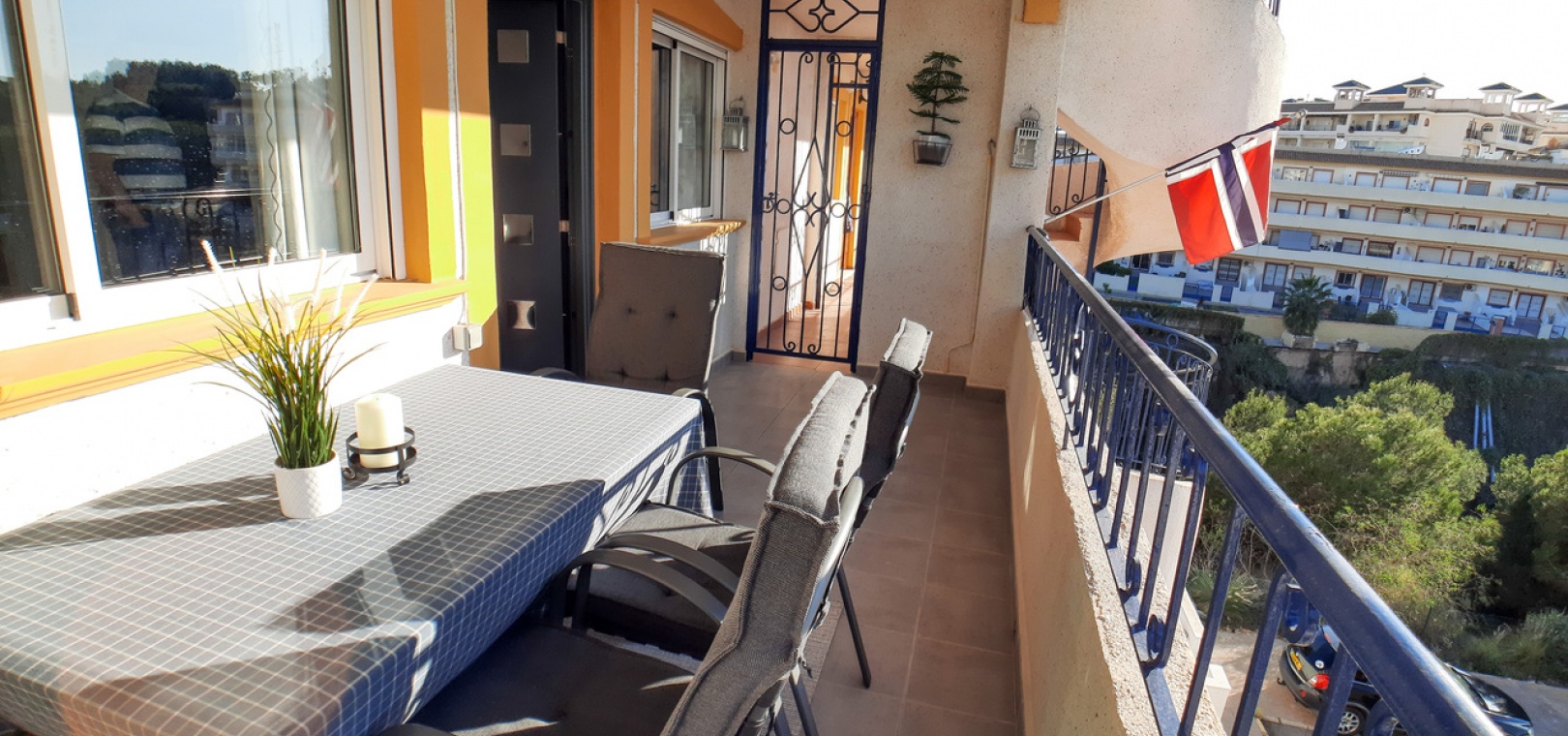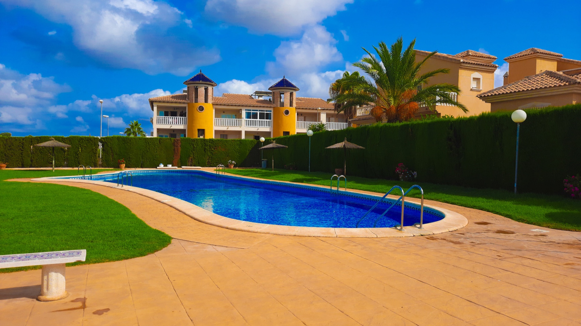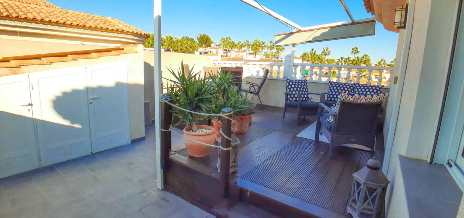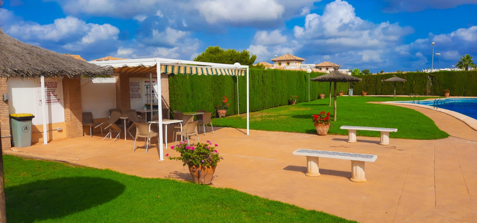Salon/salle à manger avec climatisation chaude et froide, cuisine séparée entièrement équipée, buanderie vitrée, 2 chambres doubles, 1 salle de douche, balcon avec store pare-soleil, une chambre d'amis climatisée avec 2 lits et un solarium privé de 32 m² avec terrasse, pergola aménagée et une pièce vitrée utilisée comme 3ème chambre, piscine commune et bien plus encore.