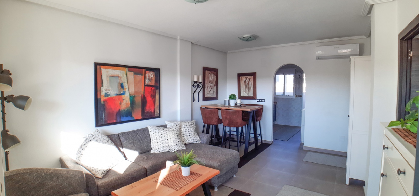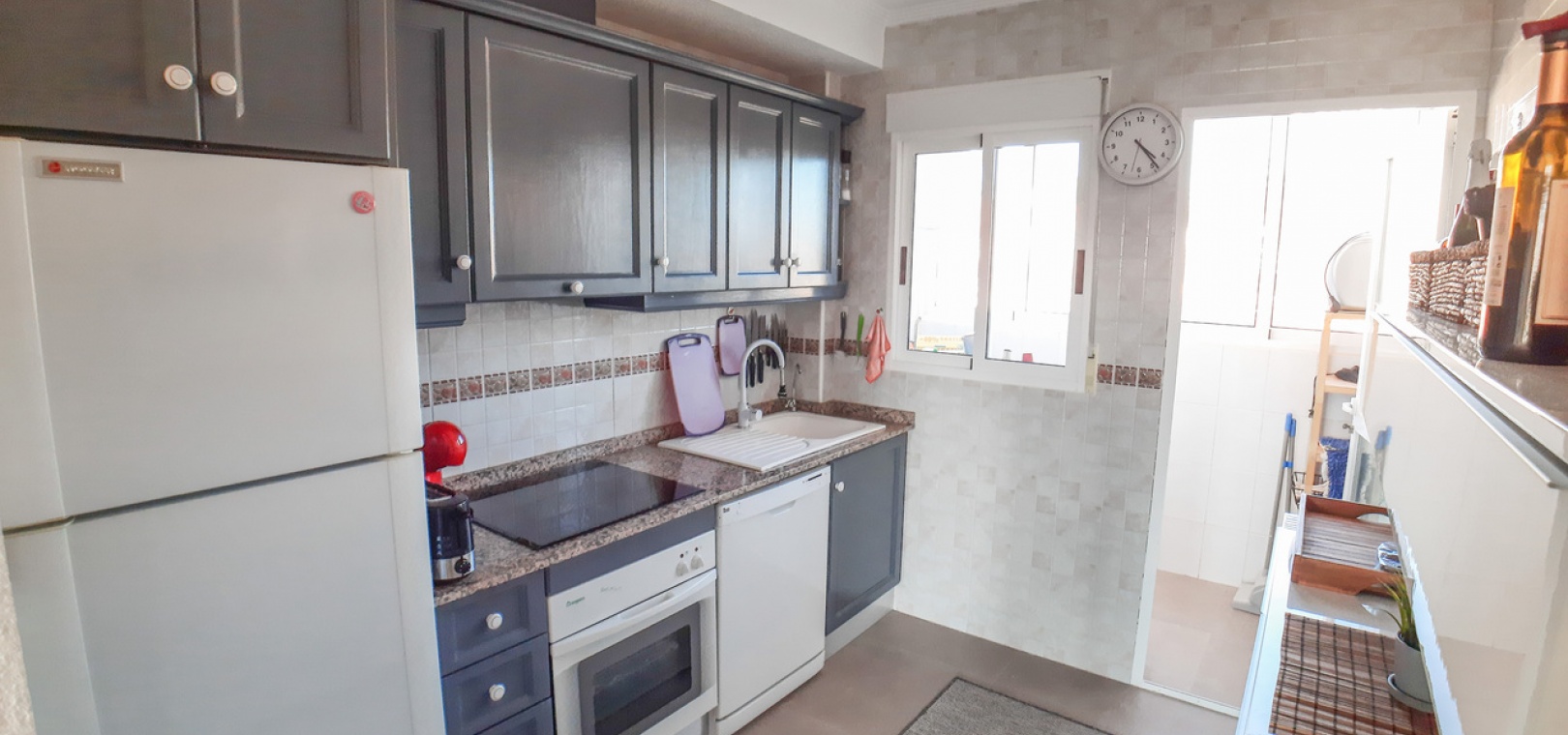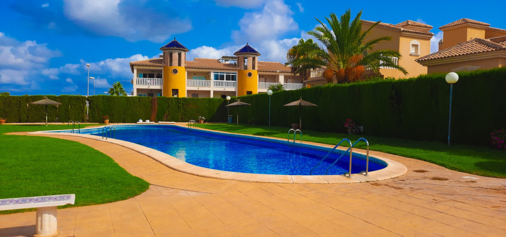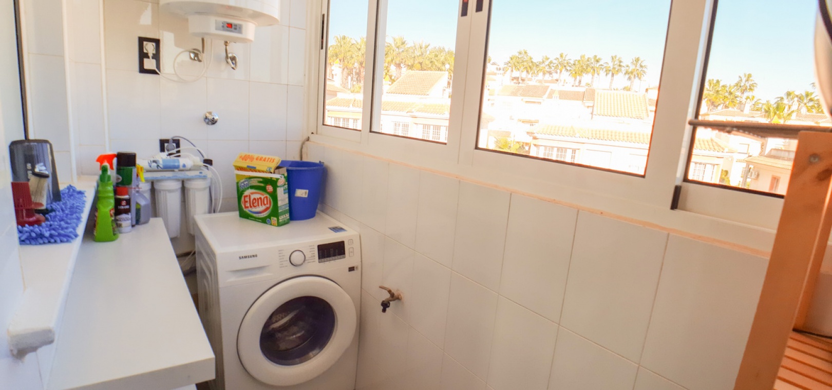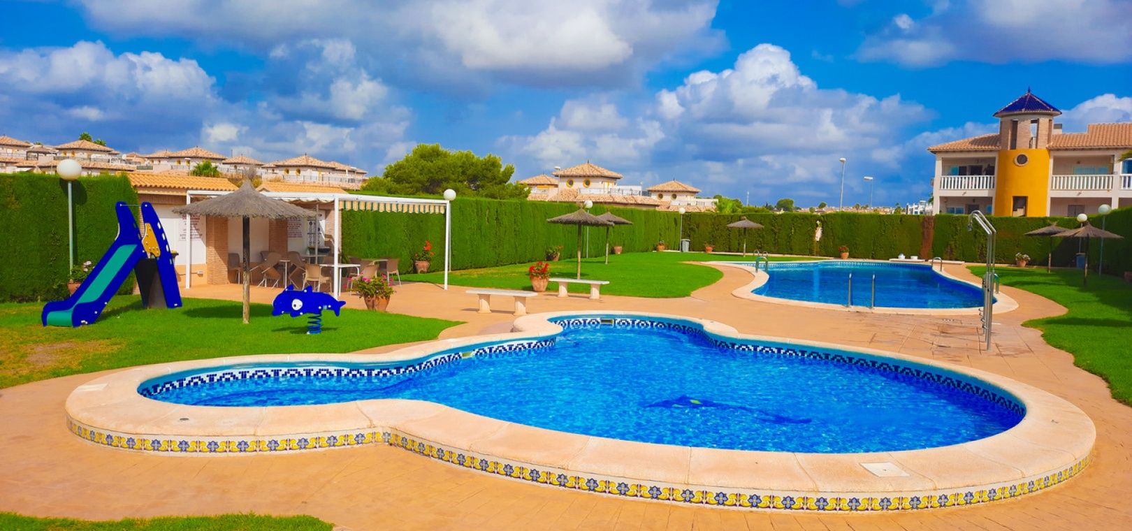Salon/salle à manger avec climatisation chaude et froide, cuisine séparée entièrement équipée, buanderie vitrée, 2 chambres doubles, 1 salle de douche, balcon avec store pare-soleil, une chambre d'amis climatisée avec 2 lits et un solarium privé de 32 m² avec terrasse, pergola aménagée et une pièce vitrée utilisée comme 3ème chambre, piscine commune et bien plus encore.