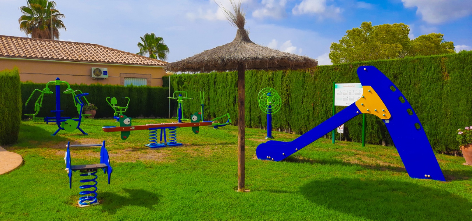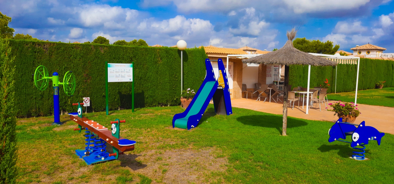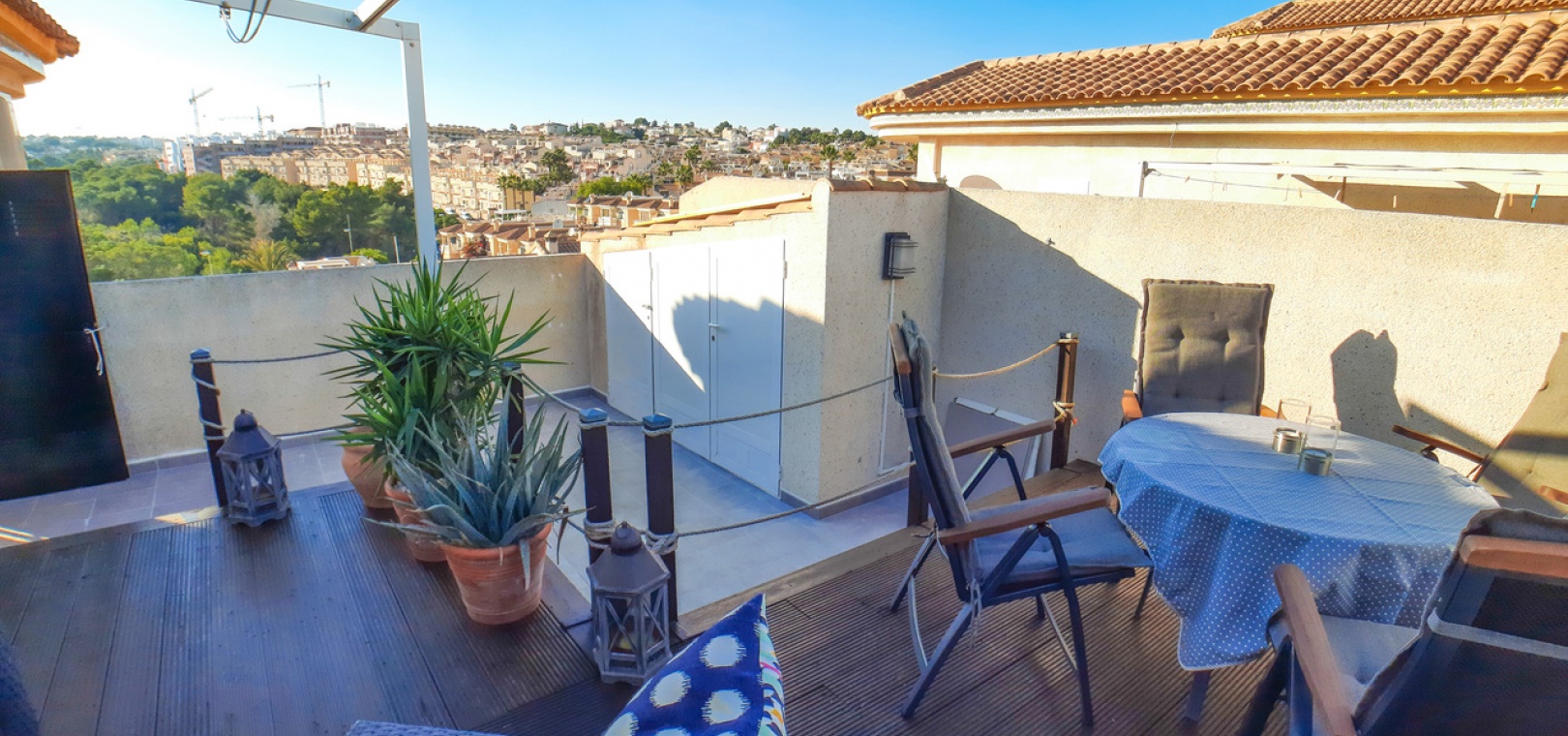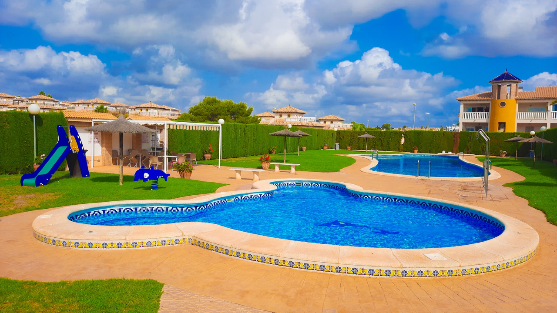 Salon/salle à manger avec climatisation chaude et froide, cuisine séparée entièrement équipée, buanderie vitrée, 2 chambres doubles, 1 salle de douche, balcon avec store pare-soleil, une chambre d'amis climatisée avec 2 lits et un solarium privé de 32 m² avec terrasse, pergola aménagée et une pièce vitrée utilisée comme 3ème chambre, piscine commune et bien plus encore.