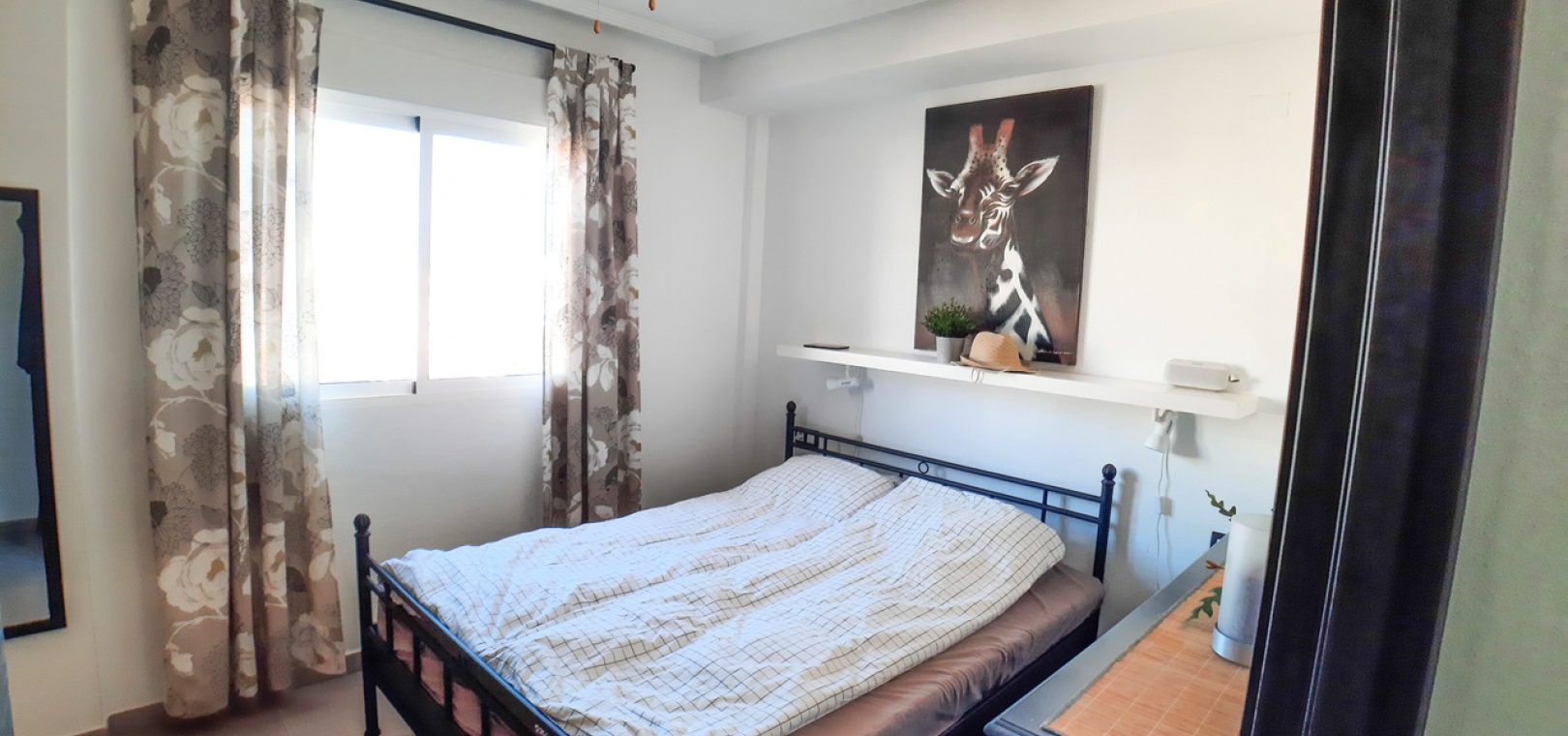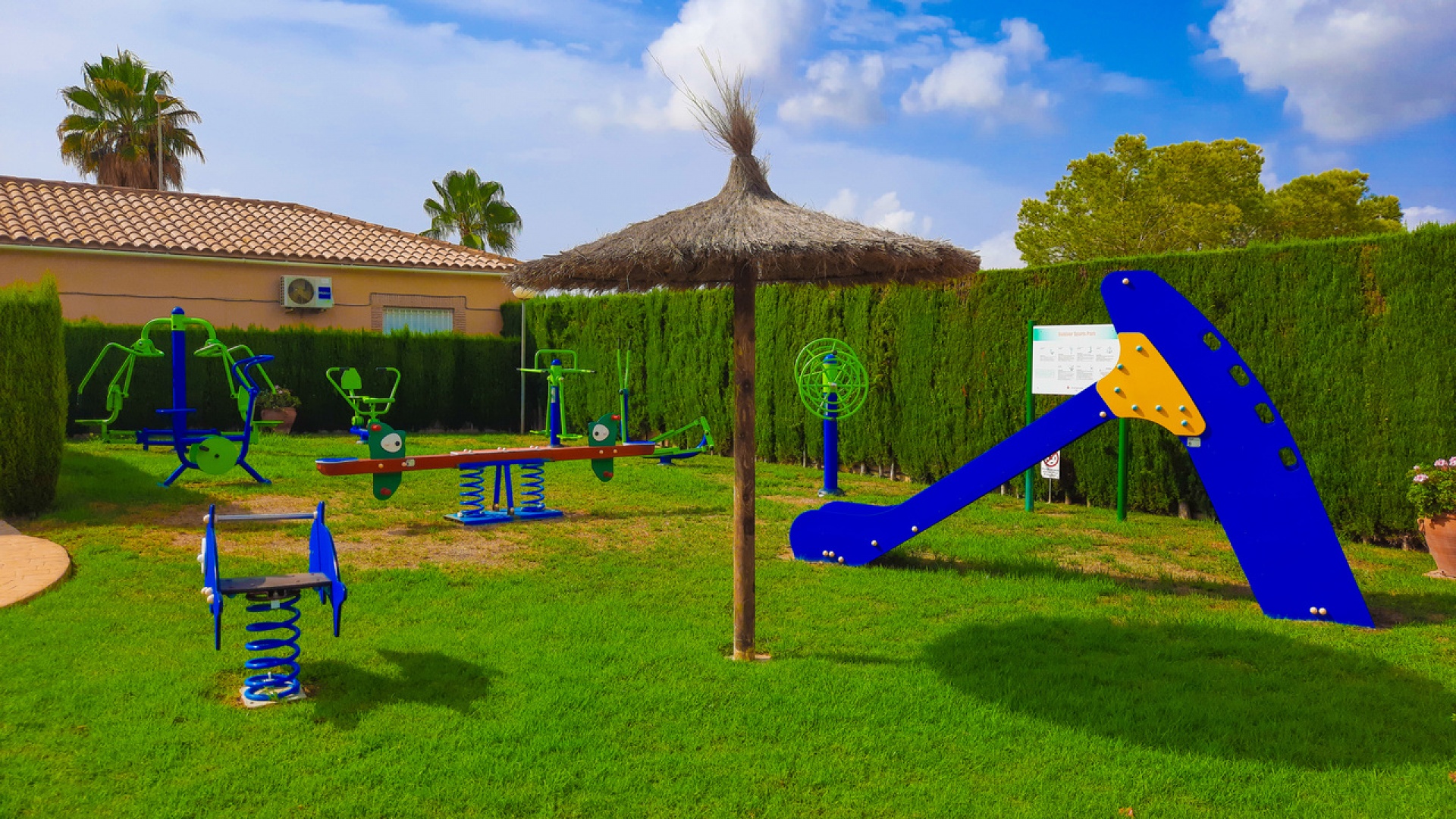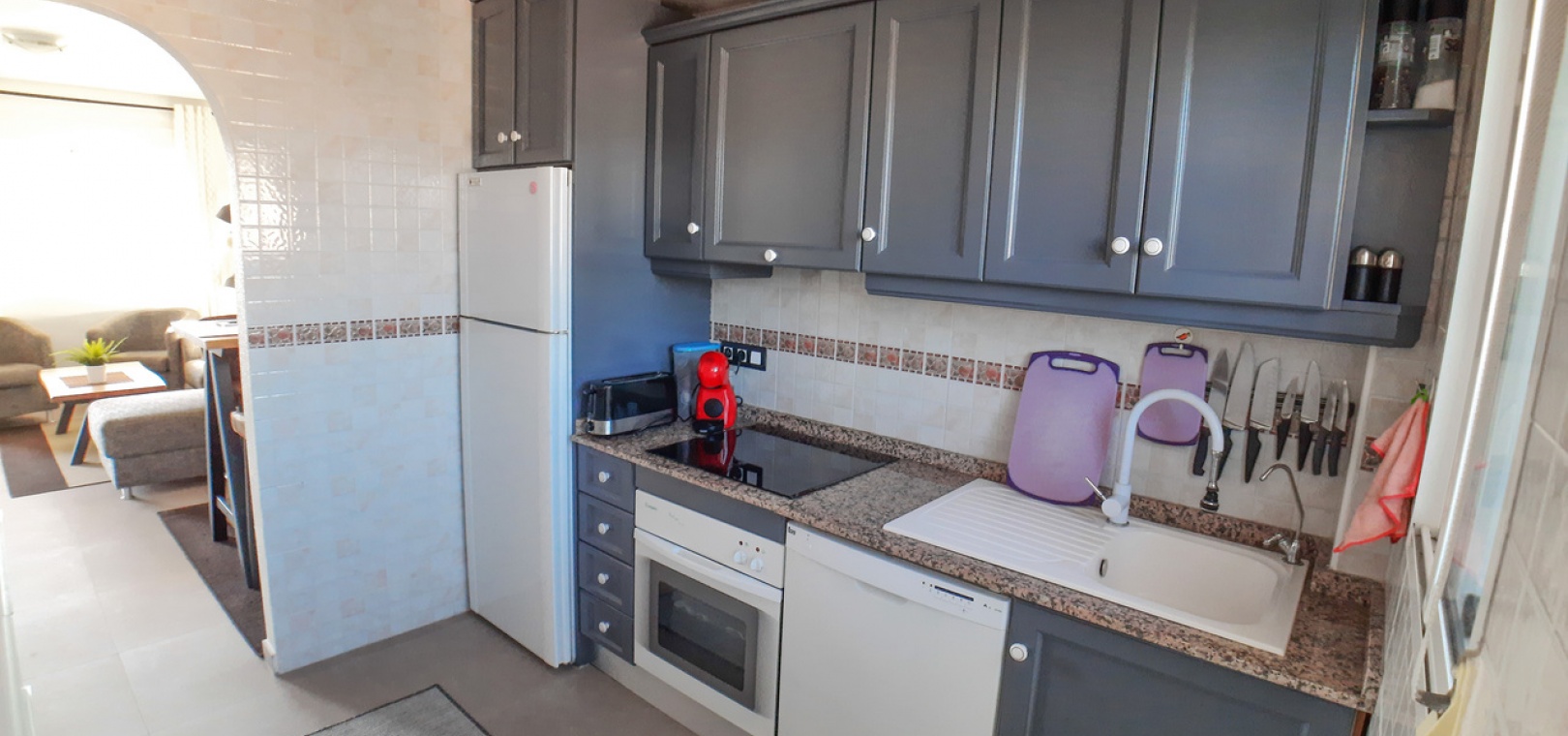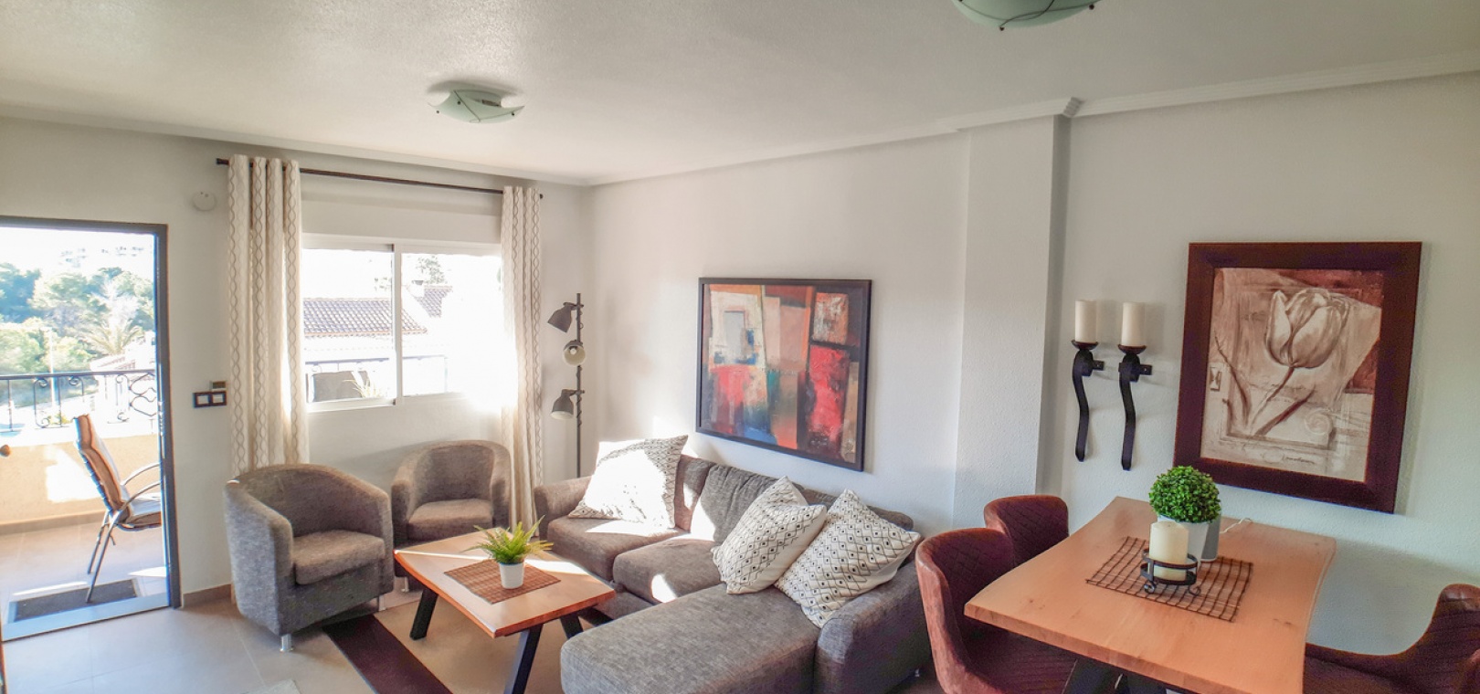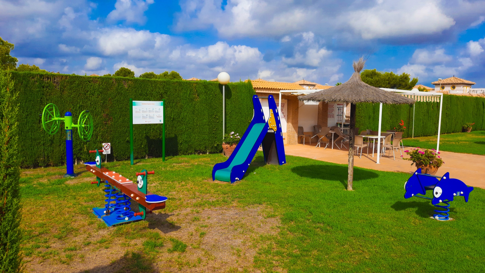 Salon/salle à manger avec climatisation chaude et froide, cuisine séparée entièrement équipée, buanderie vitrée, 2 chambres doubles, 1 salle de douche, balcon avec store pare-soleil, une chambre d'amis climatisée avec 2 lits et un solarium privé de 32 m² avec terrasse, pergola aménagée et une pièce vitrée utilisée comme 3ème chambre, piscine commune et bien plus encore.