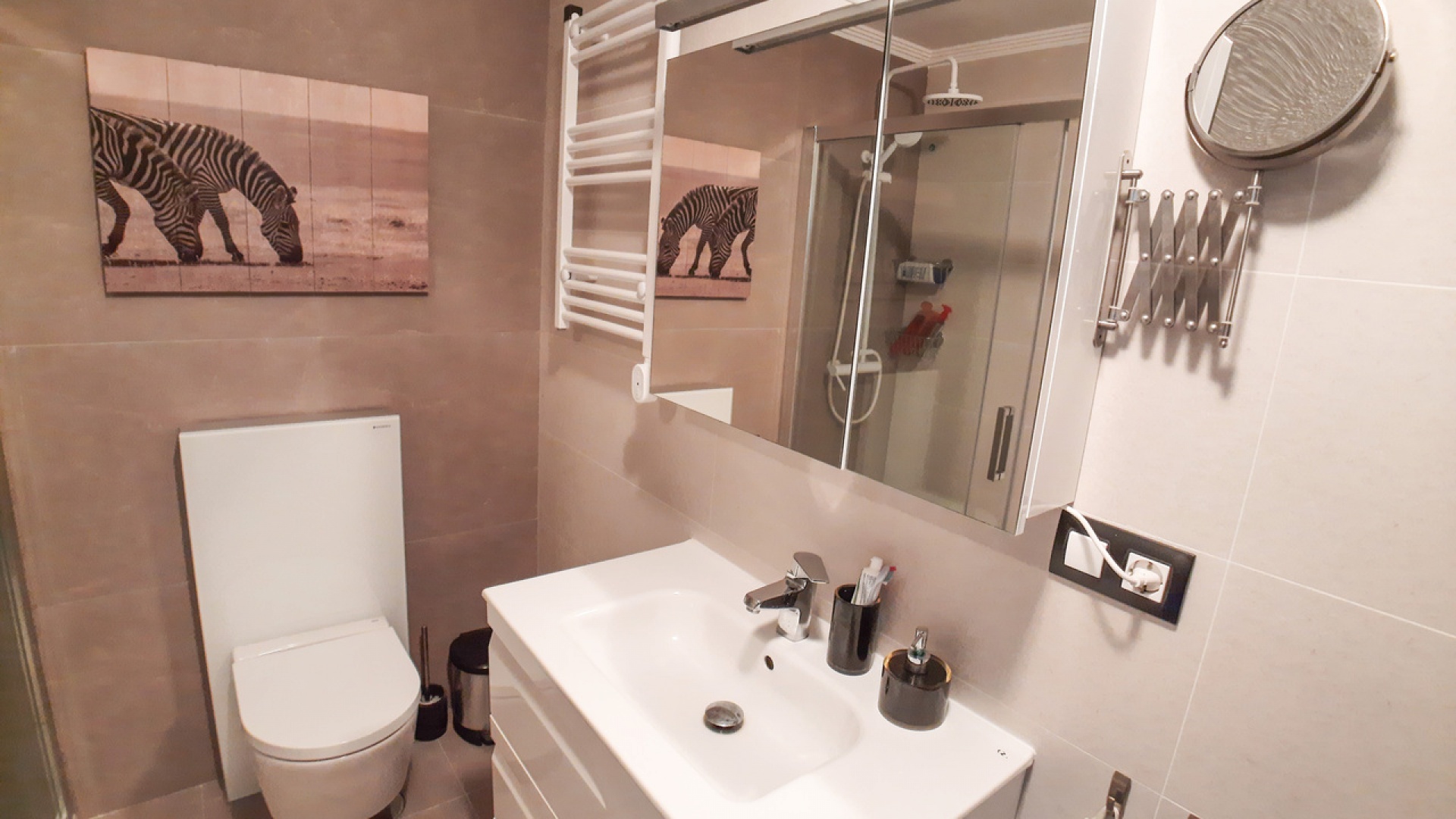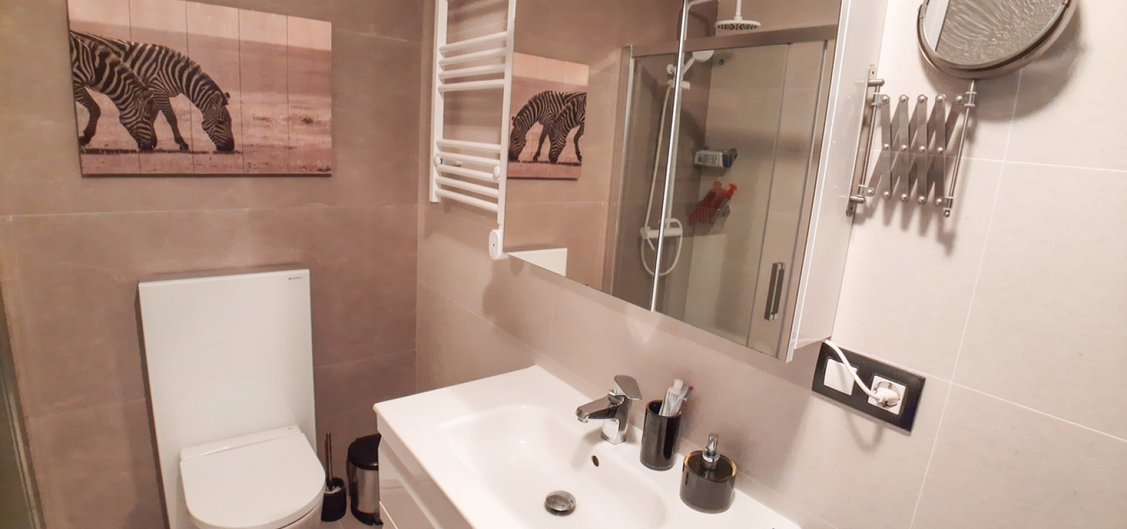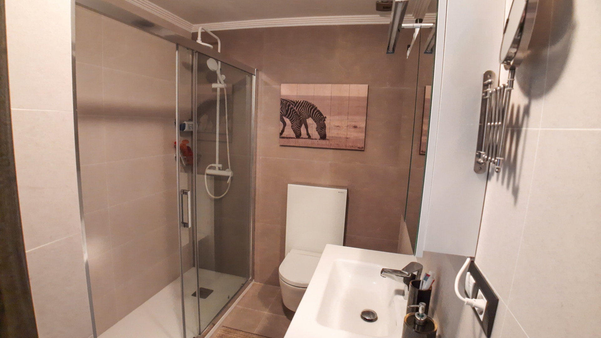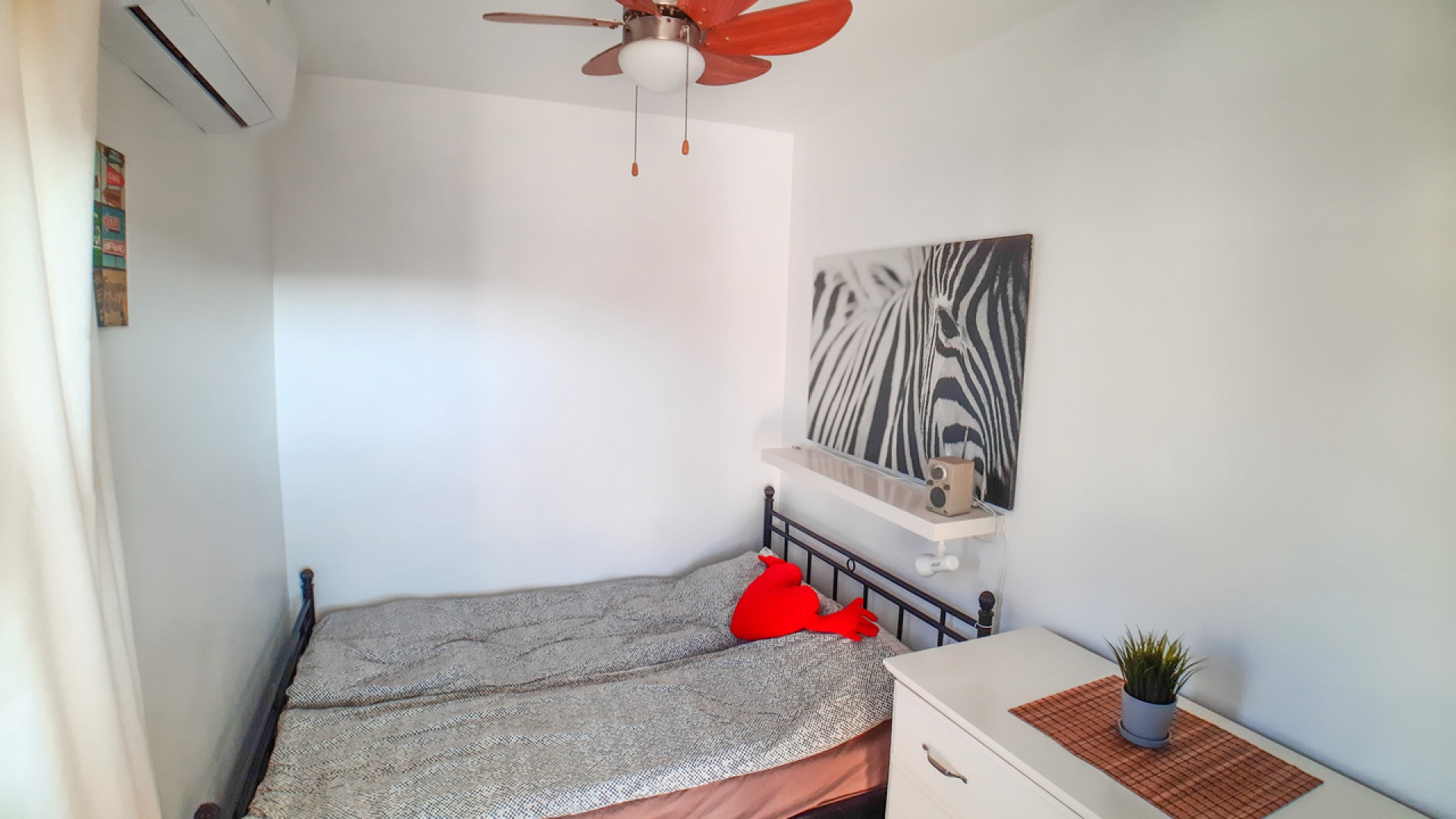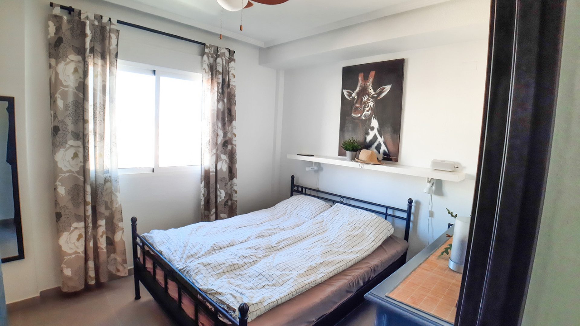 Salon/salle à manger avec climatisation chaude et froide, cuisine séparée entièrement équipée, buanderie vitrée, 2 chambres doubles, 1 salle de douche, balcon avec store pare-soleil, une chambre d'amis climatisée avec 2 lits et un solarium privé de 32 m² avec terrasse, pergola aménagée et une pièce vitrée utilisée comme 3ème chambre, piscine commune et bien plus encore.