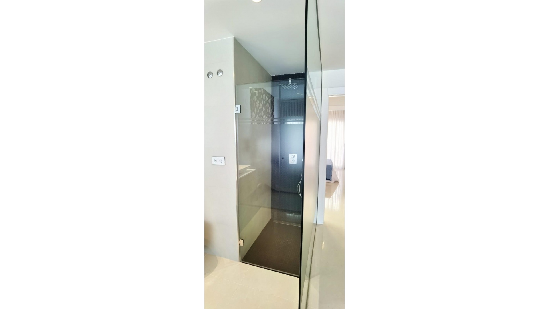 Appartement de 89 m² au rez-de-chaussée, au design contemporain. Il comprend un séjour-salle à manger, une cuisine ouverte, trois chambres et deux salles de bains, dont une attenante. Il bénéficie d'une spacieuse terrasse de 57 m² avec barbecue et pergola.