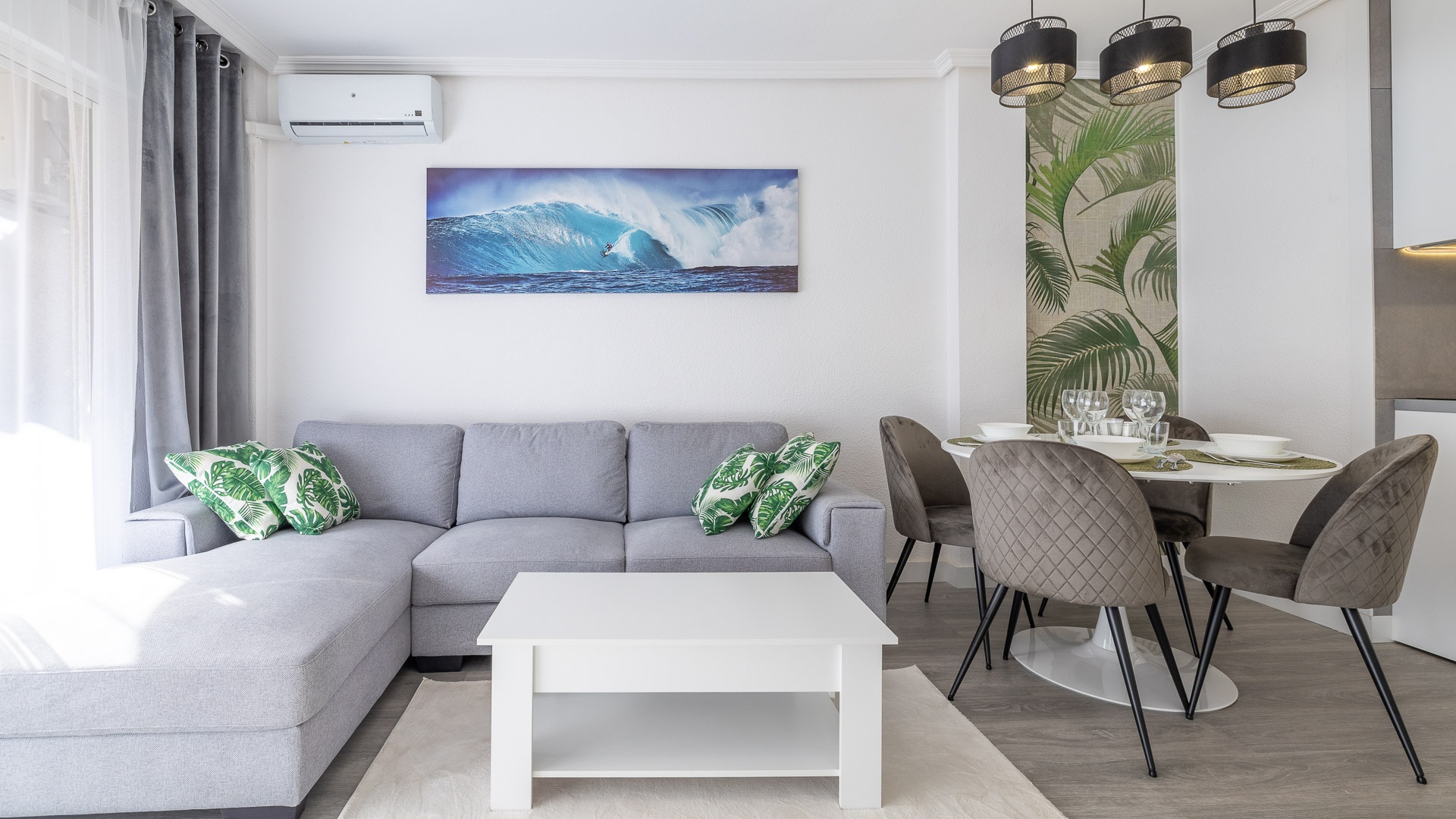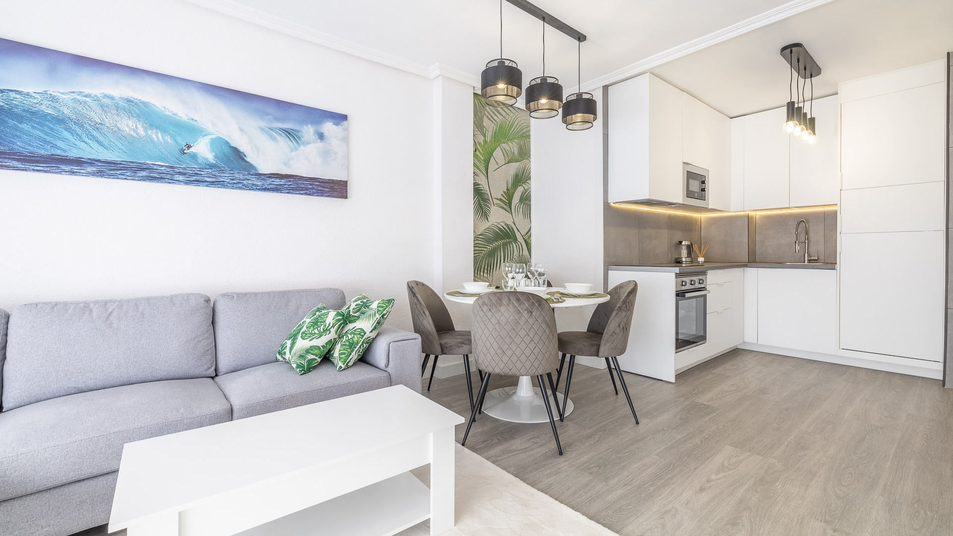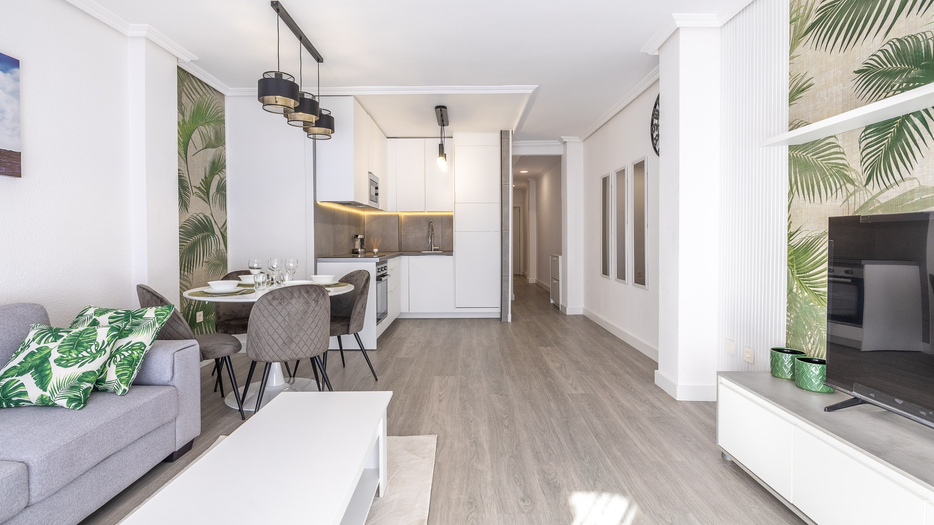 Bienvenue dans cet appartement frais et lumineux de 75 m², rénové avec soin dans les moindres détails pour créer un intérieur moderne et chaleureux. Il comprend deux chambres spacieuses et élégantes, une salle de bain moderne et un espace ouvert entre la cuisine et le salon, idéal pour des moments conviviaux en famille ou entre amis. Depuis le salon, vous accédez à un charmant balcon exposé plein sud. Vous pourrez y savourer votre café du matin au soleil, lire un livre sous la chaleur ou dîner en admirant la vue sur le centre animé de Torrevieja.