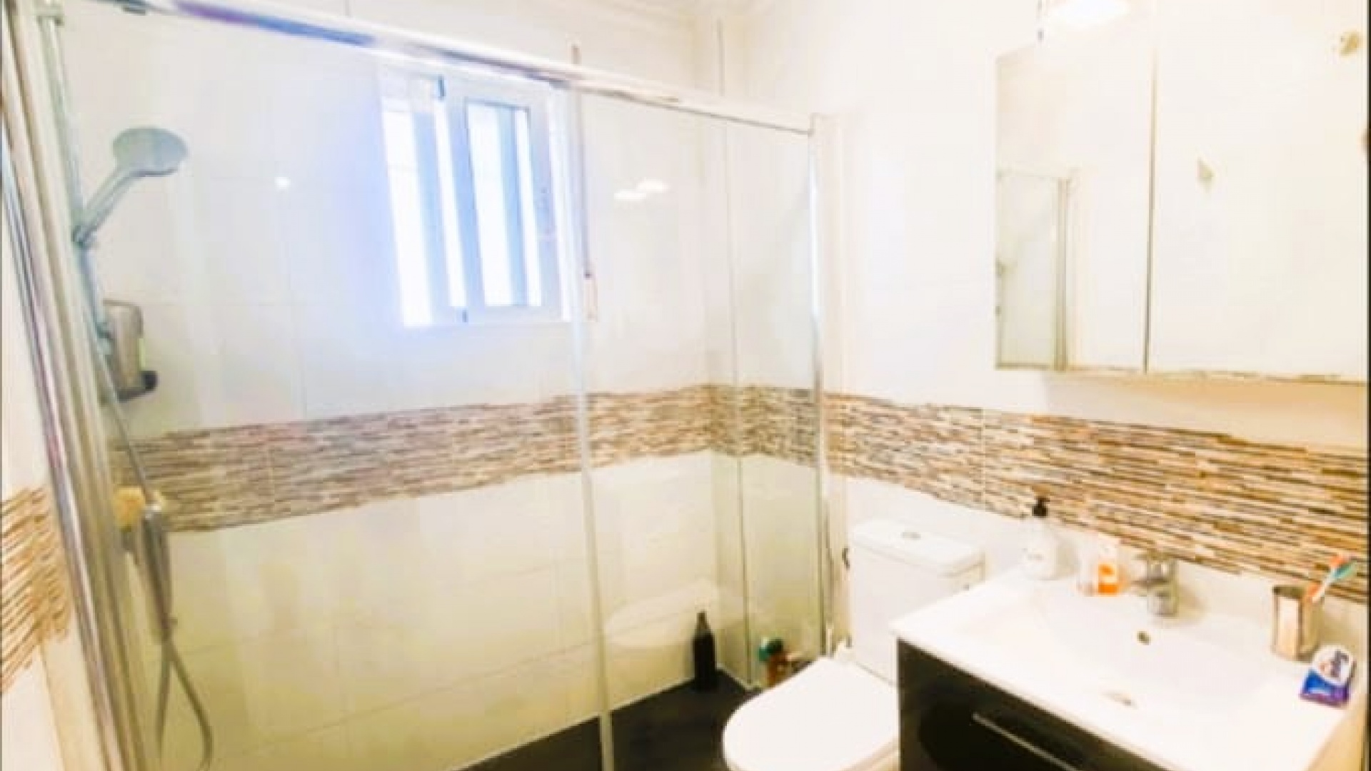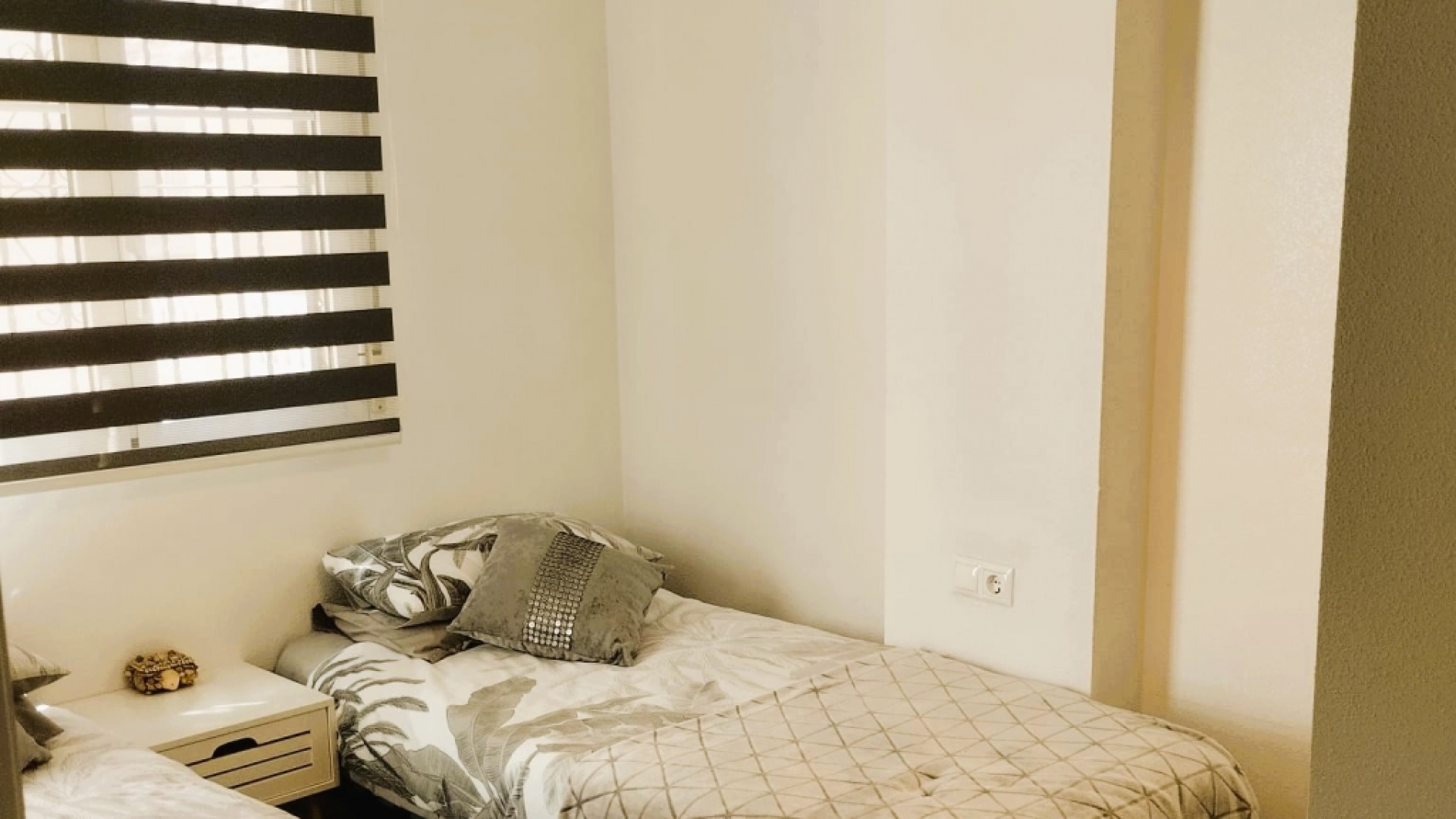 À l'étage intermédiaire se trouvent deux chambres doubles, chacune avec terrasse individuelle. Elles disposent toutes deux de placards intégrés. La spacieuse salle de bains familiale est équipée d'une grande douche, d'un meuble vasque moderne et d'un sèche-serviettes. Cette salle de bains a également été rénovée ! À l'étage supérieur, une autre chambre double bénéficie d'une salle de bains attenante contemporaine et d'un accès direct à une charmante terrasse qui surplombe la campagne environnante et la magnifique chaîne de montagnes d'Orihuela, ainsi que la piscine commune. L'accès à la terrasse est également indépendant depuis le couloir.