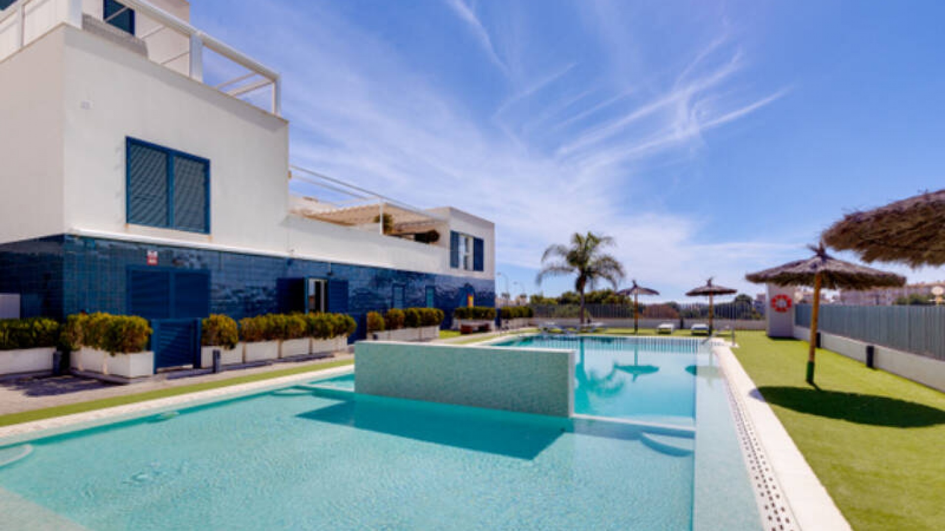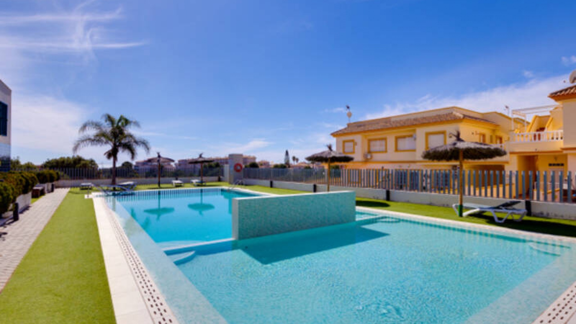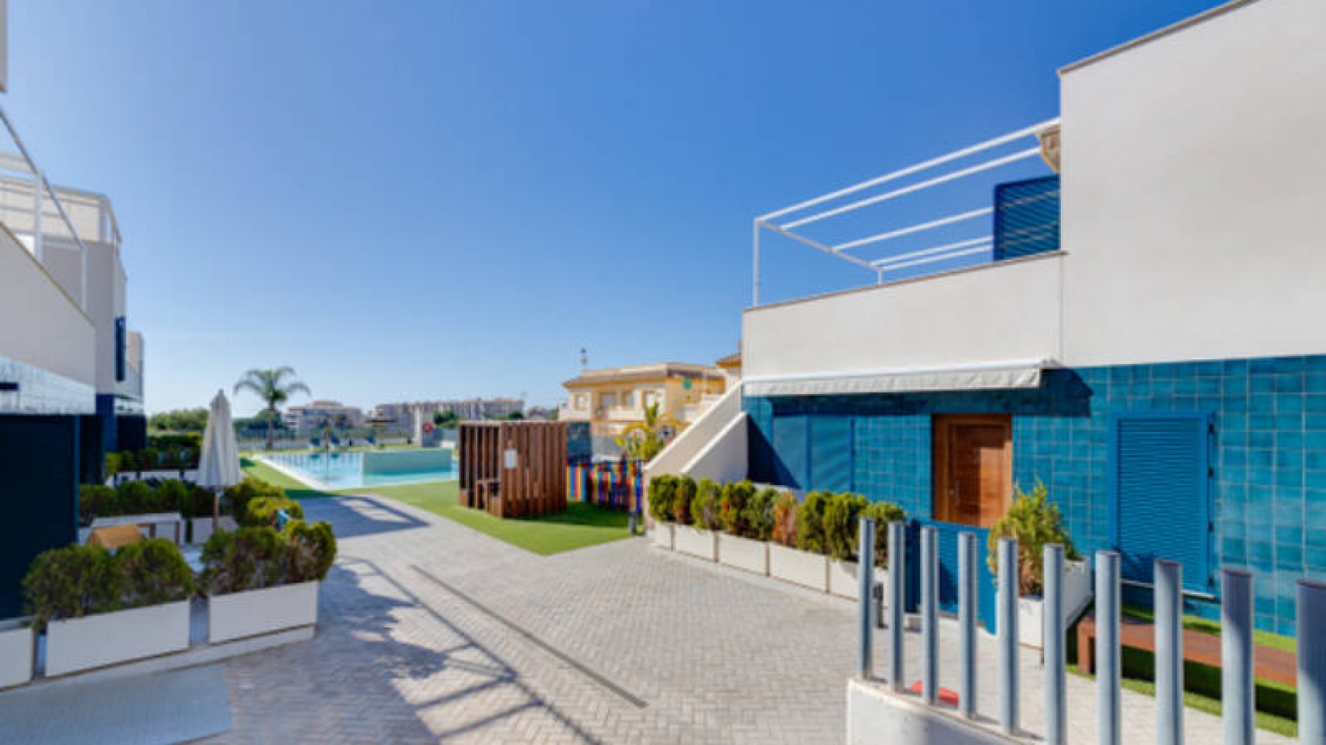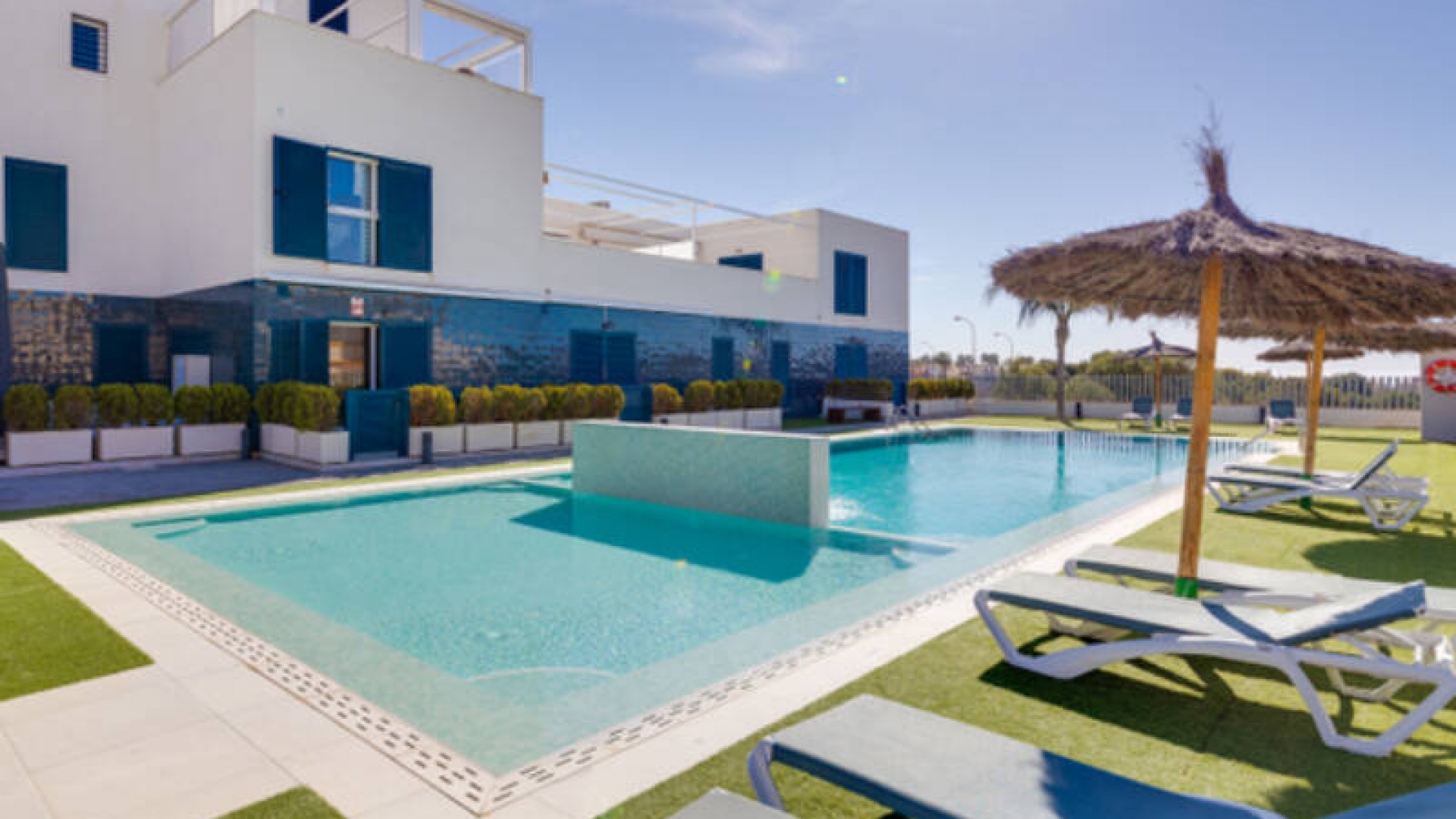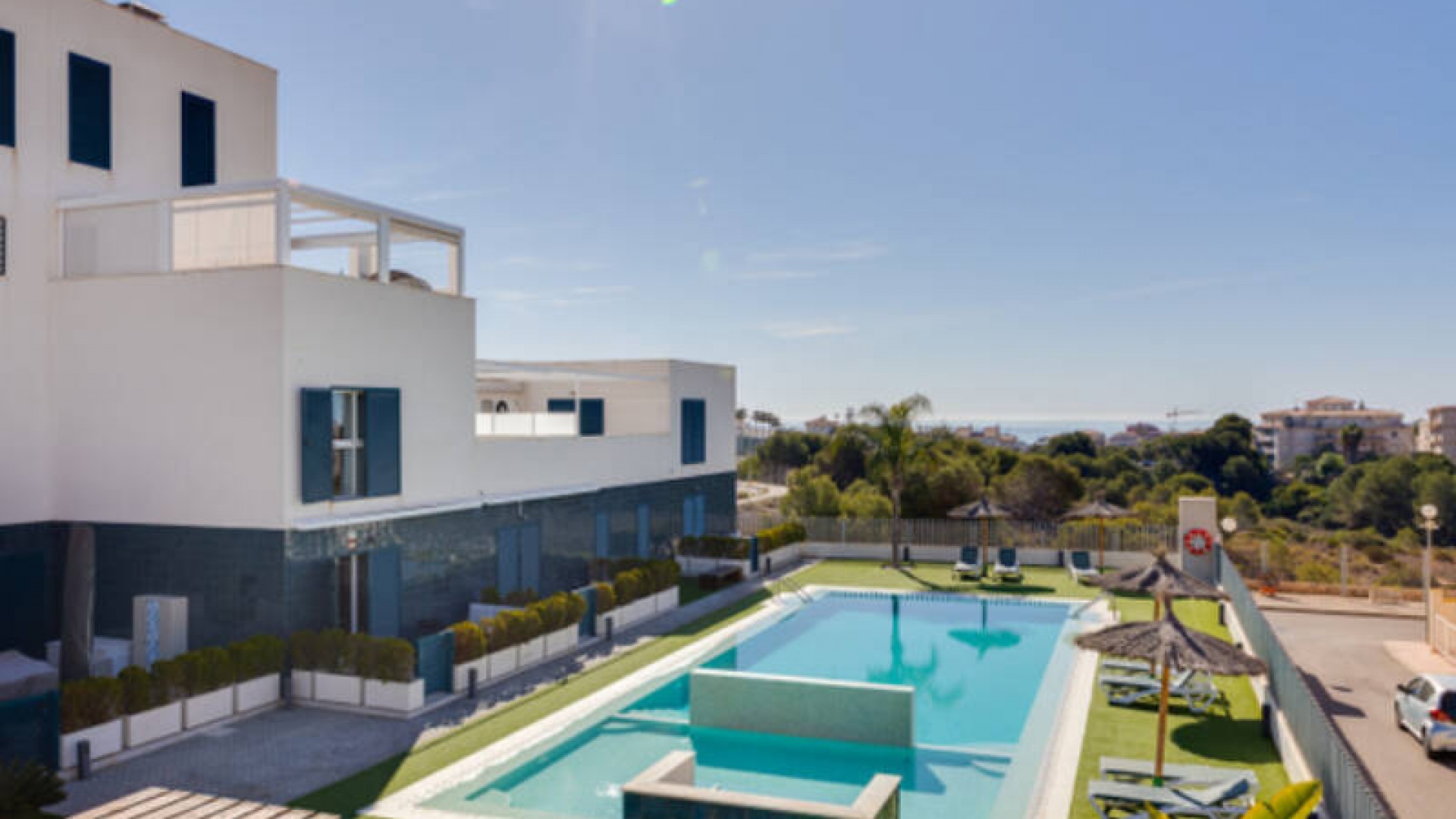 A l'extérieur, il y a une terrasse/jardin avant, une belle piscine commune, une aire de jeux pour enfants, une aire de pique-nique avec vue sur la mer au loin, une communauté fermée sécurisée, 2 places de parking souterraines et bien plus encore.