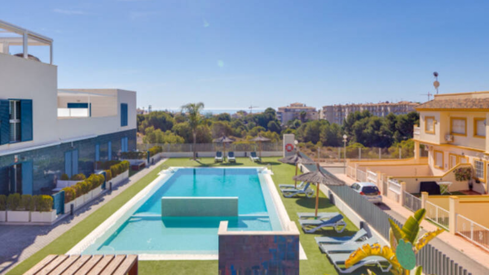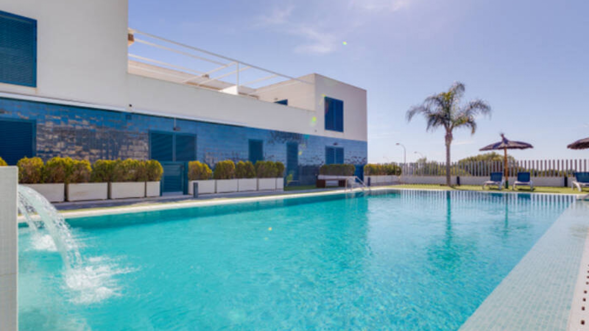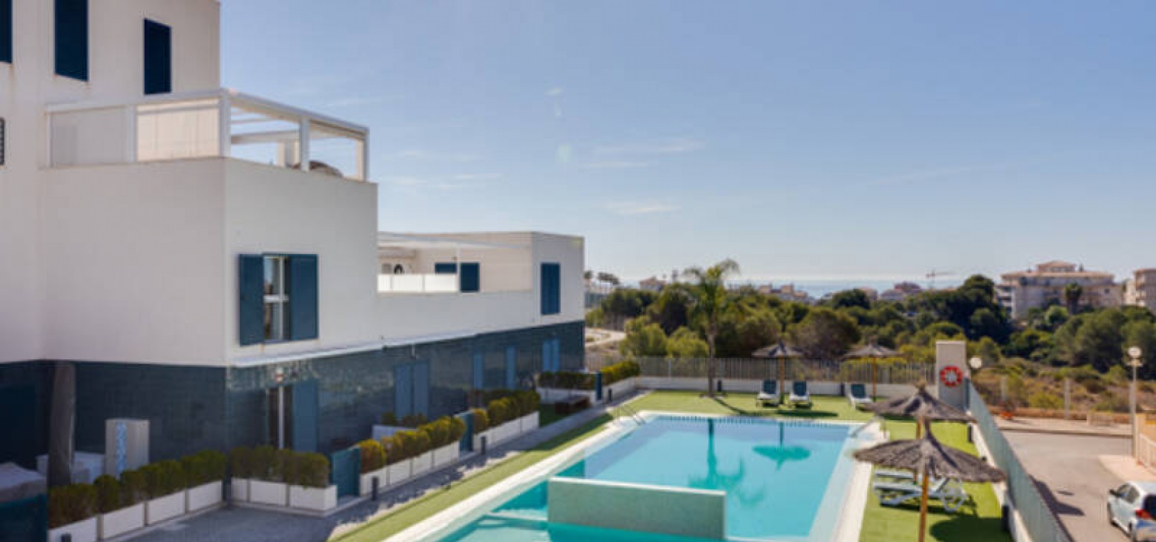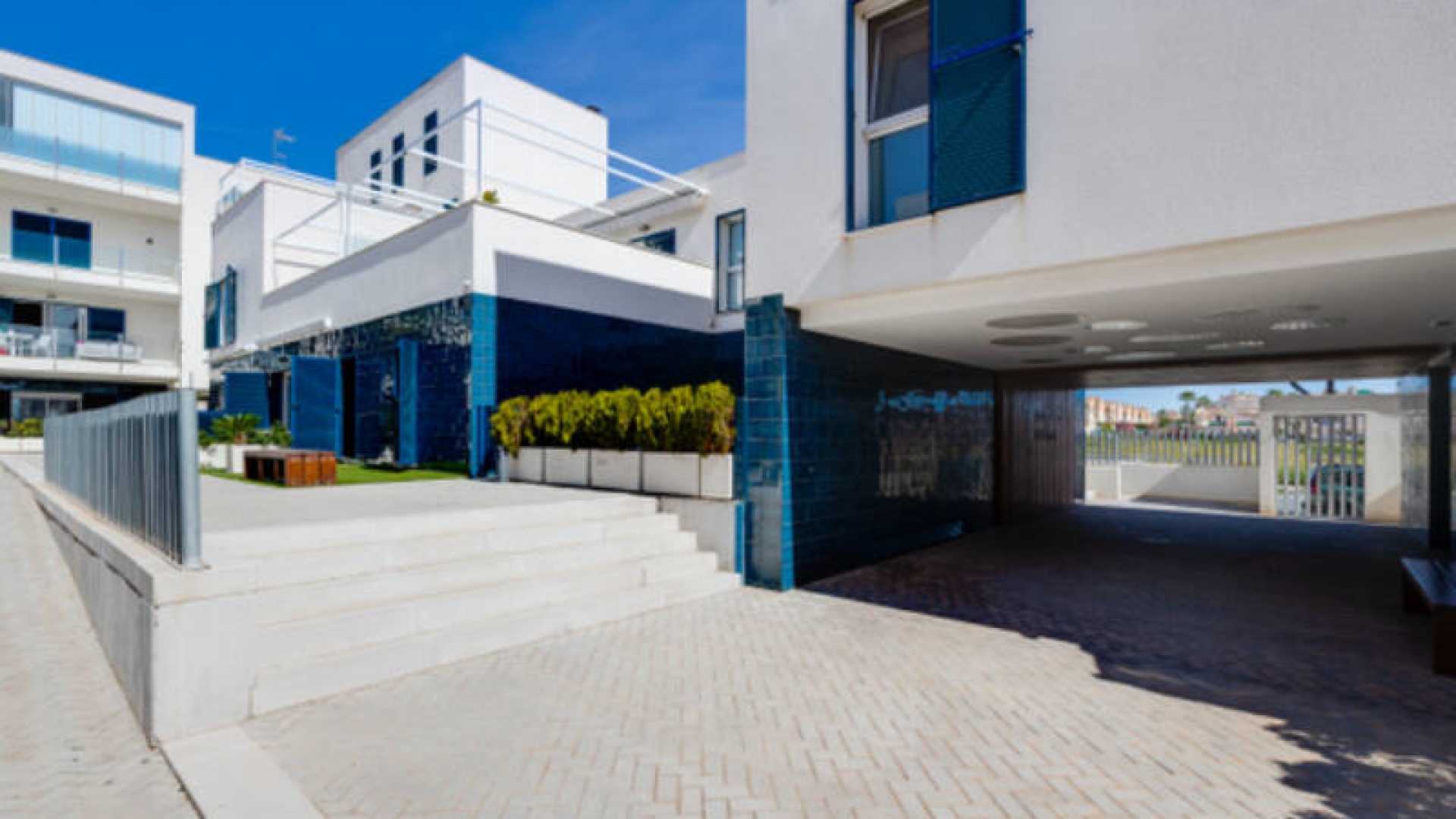 A l'extérieur, il y a une terrasse/jardin avant, une belle piscine commune, une aire de jeux pour enfants, une aire de pique-nique avec vue sur la mer au loin, une communauté fermée sécurisée, 2 places de parking souterraines et bien plus encore.