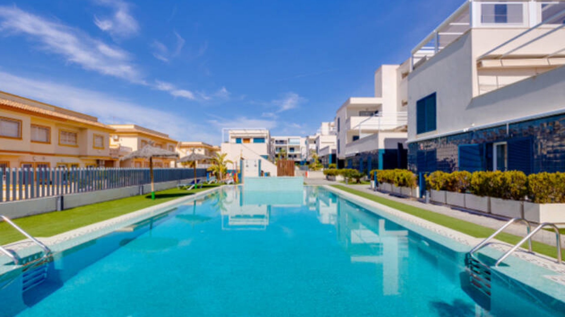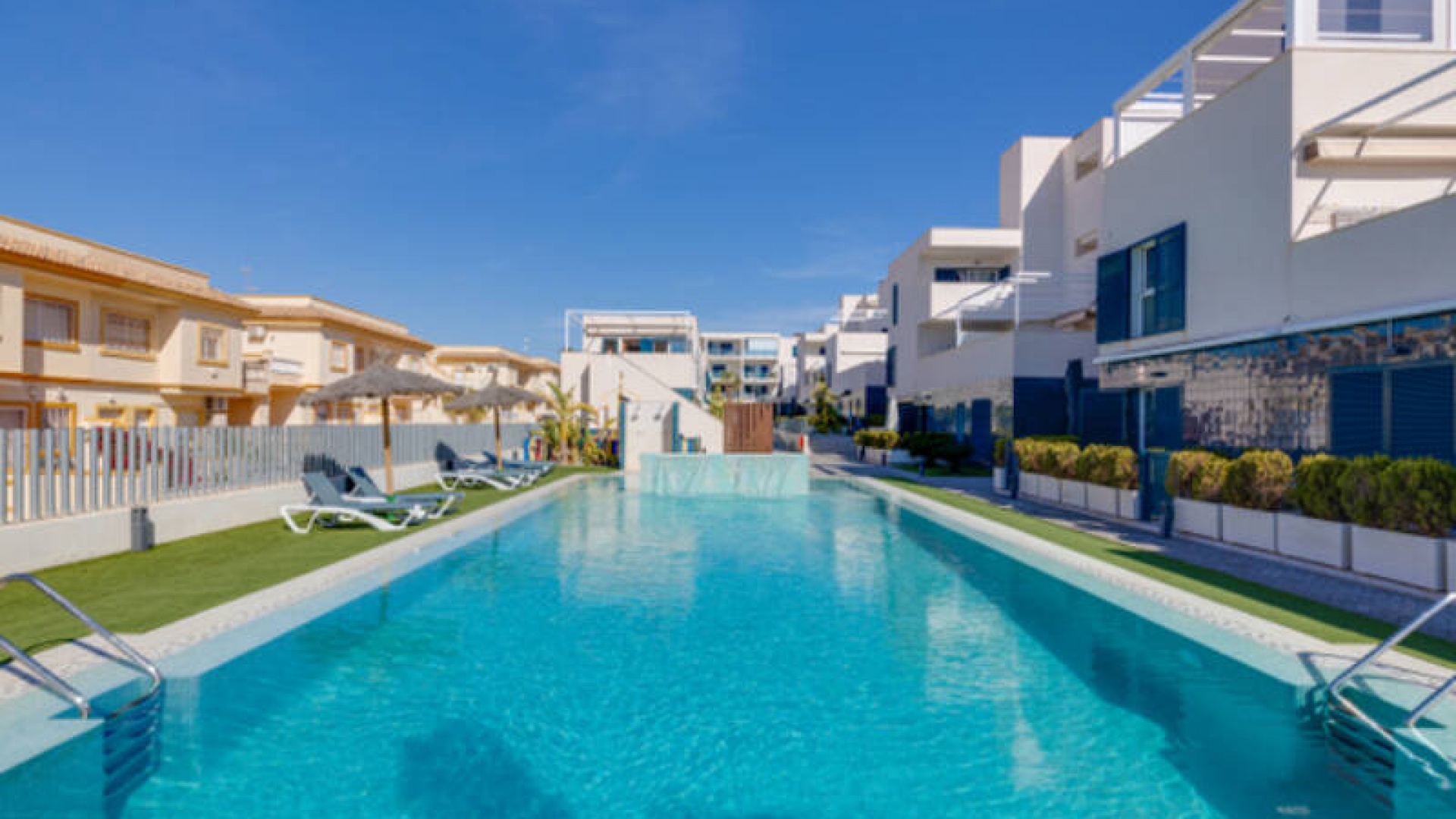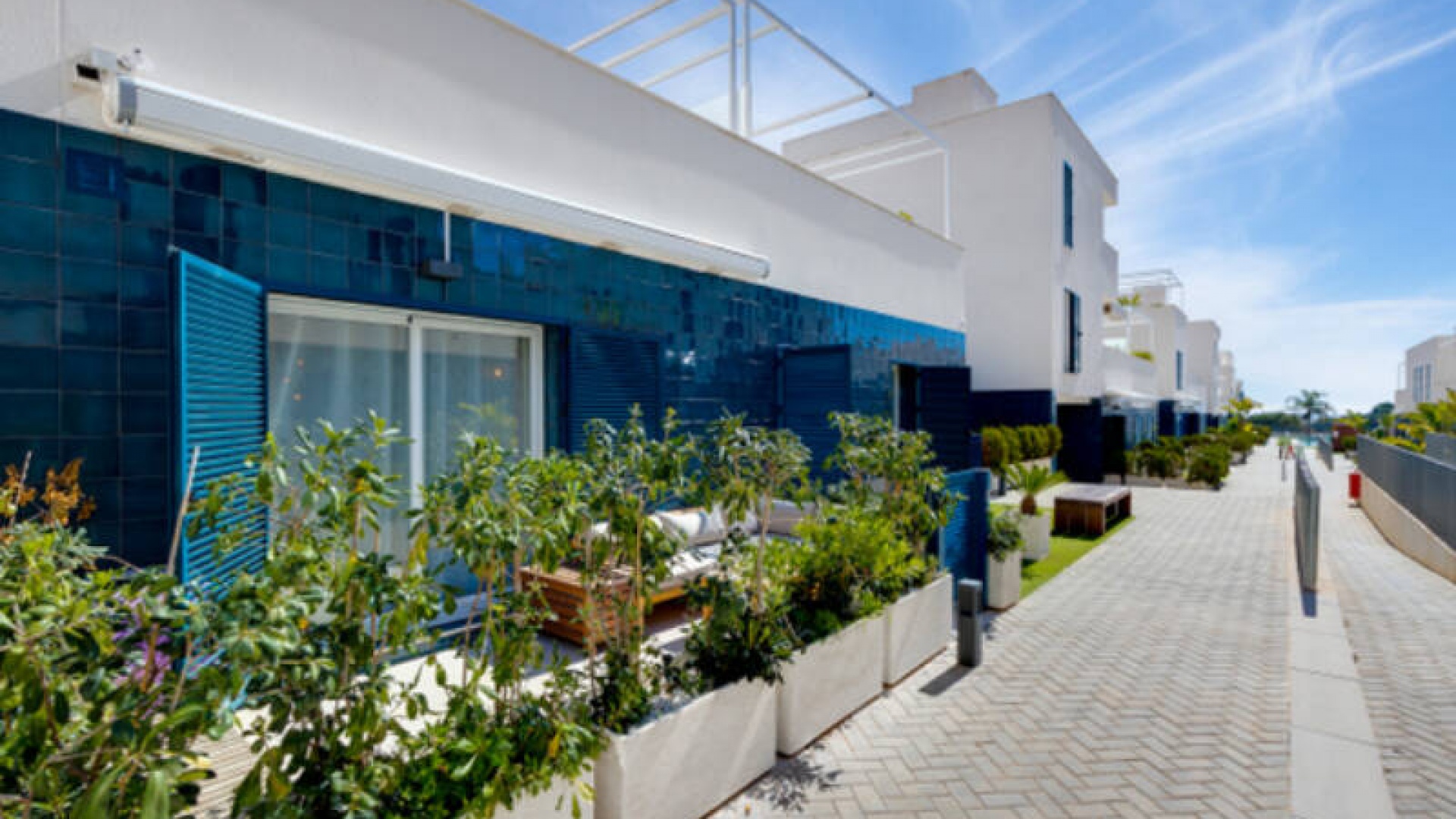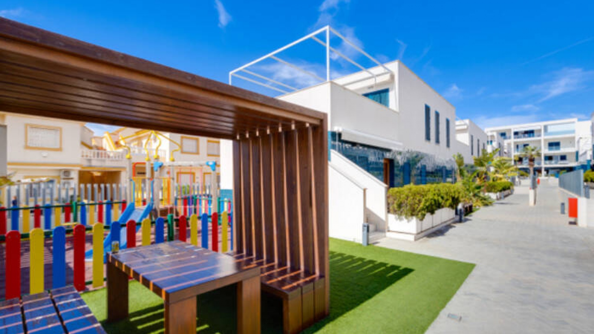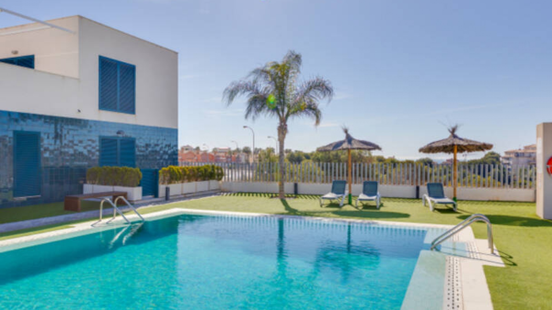 A l'extérieur, il y a une terrasse/jardin avant, une belle piscine commune, une aire de jeux pour enfants, une aire de pique-nique avec vue sur la mer au loin, une communauté fermée sécurisée, 2 places de parking souterraines et bien plus encore.