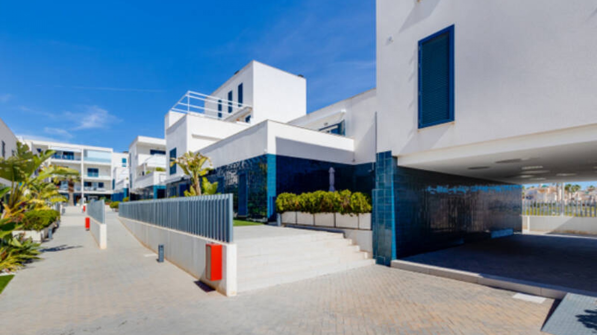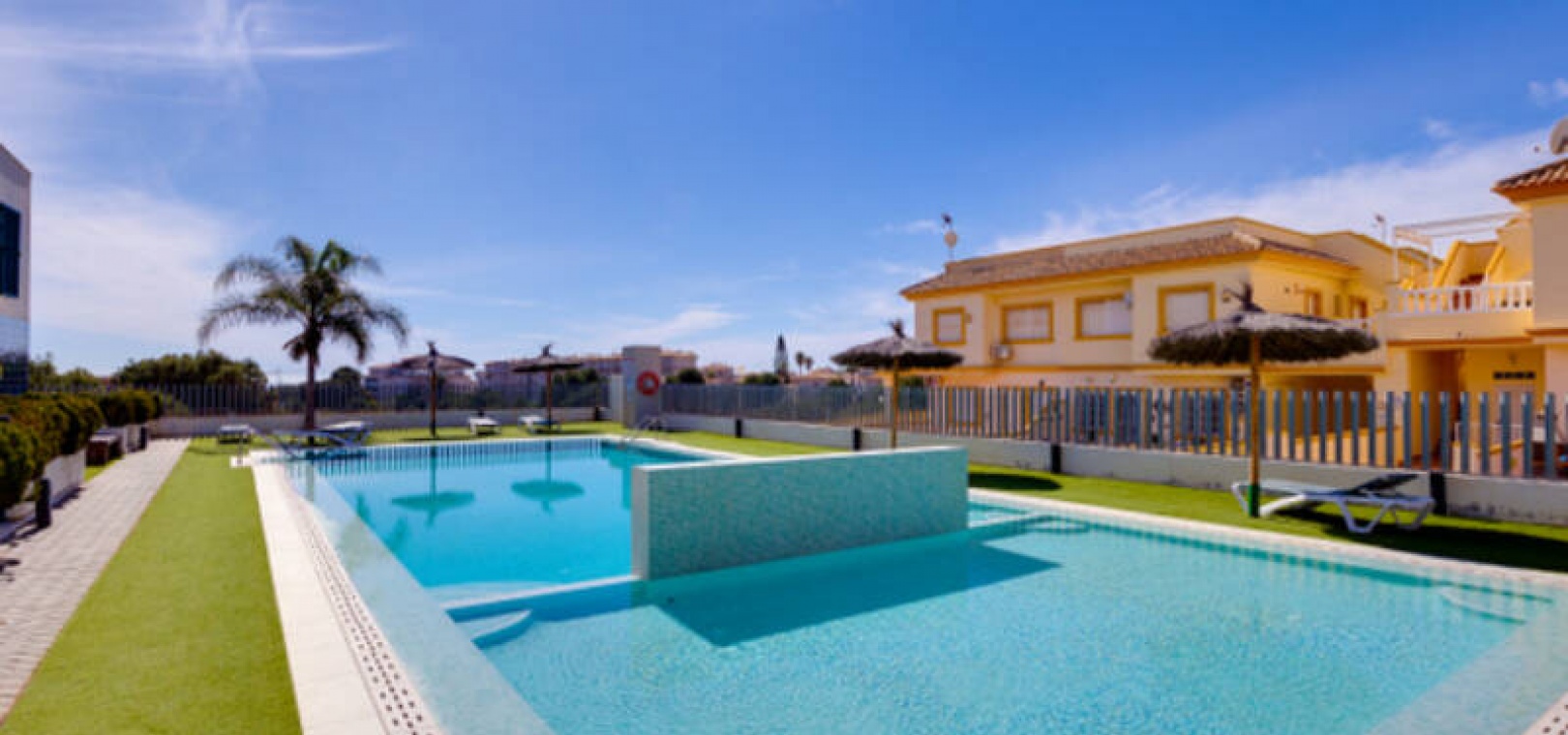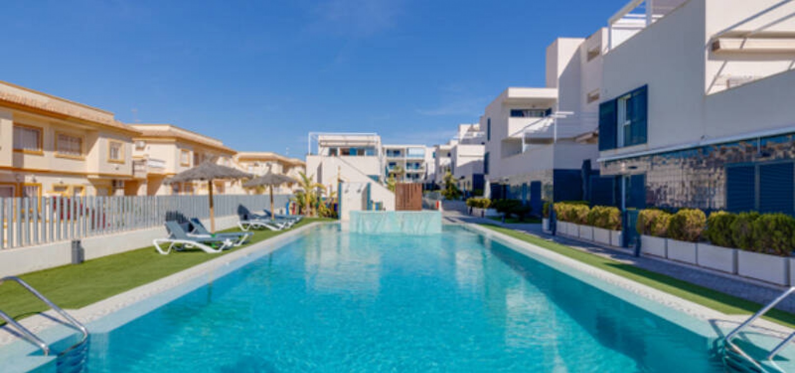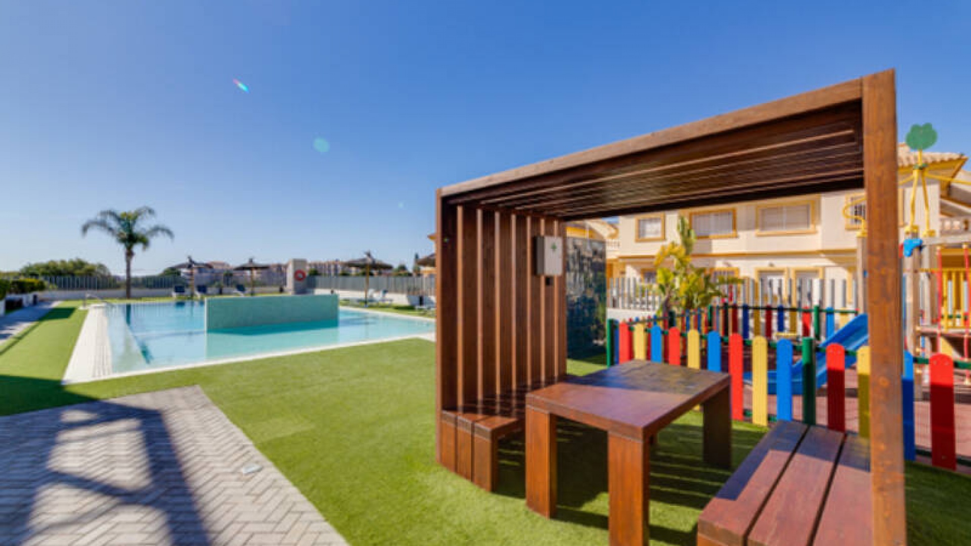 A l'extérieur, il y a une terrasse/jardin avant, une belle piscine commune, une aire de jeux pour enfants, une aire de pique-nique avec vue sur la mer au loin, une communauté fermée sécurisée, 2 places de parking souterraines et bien plus encore.