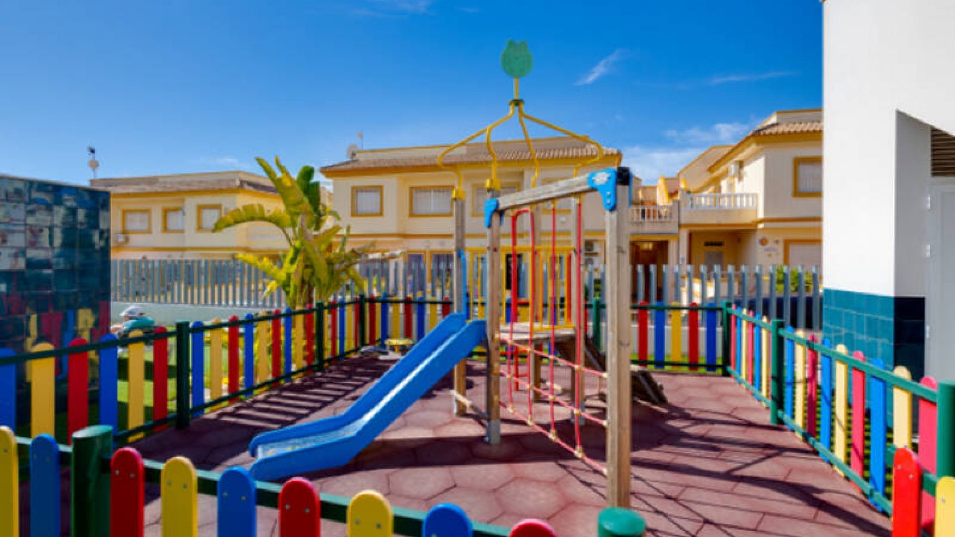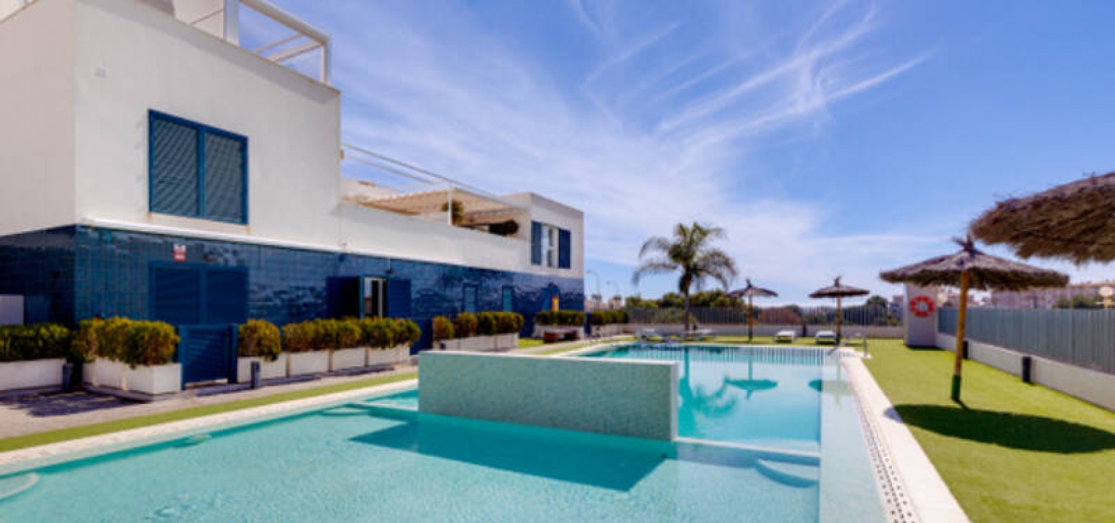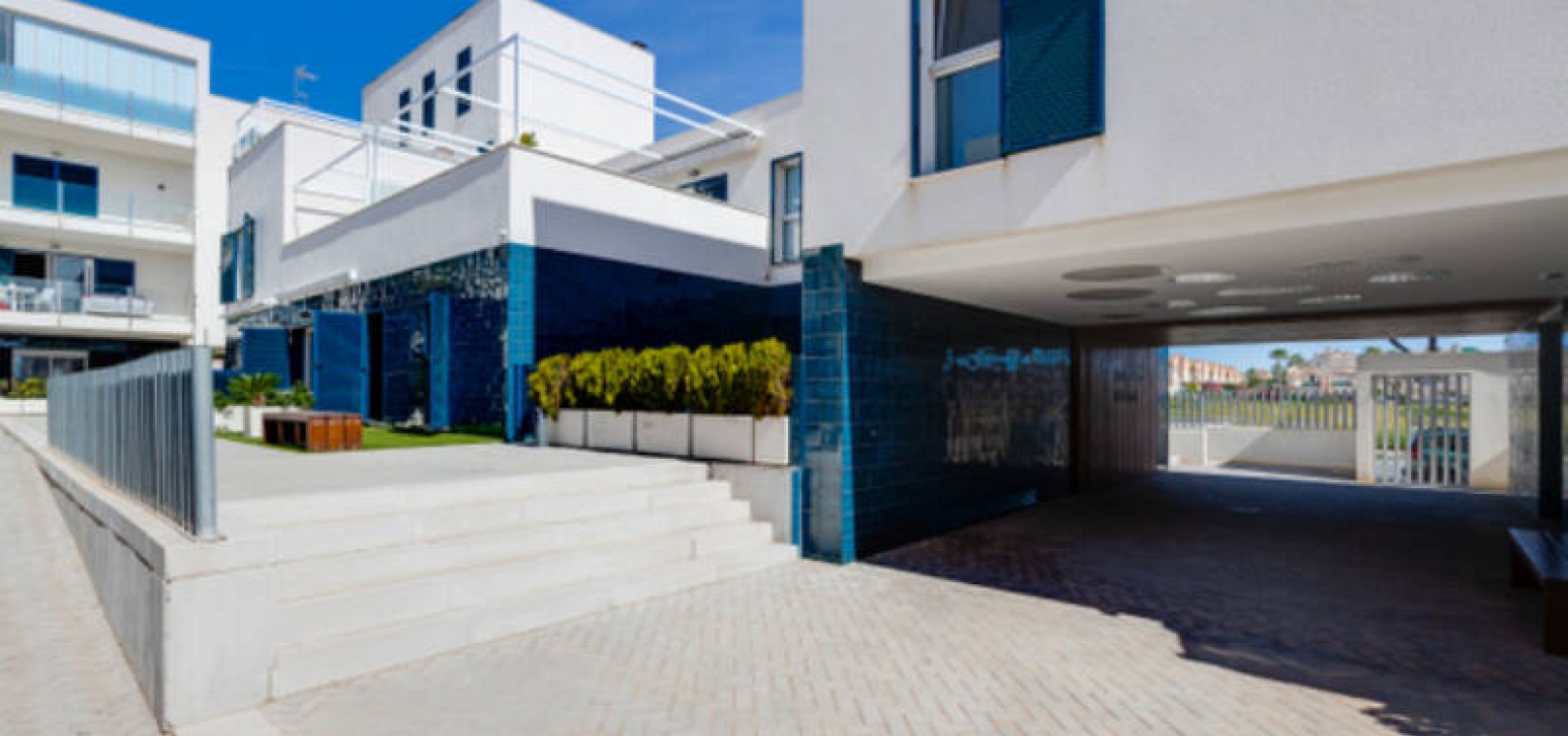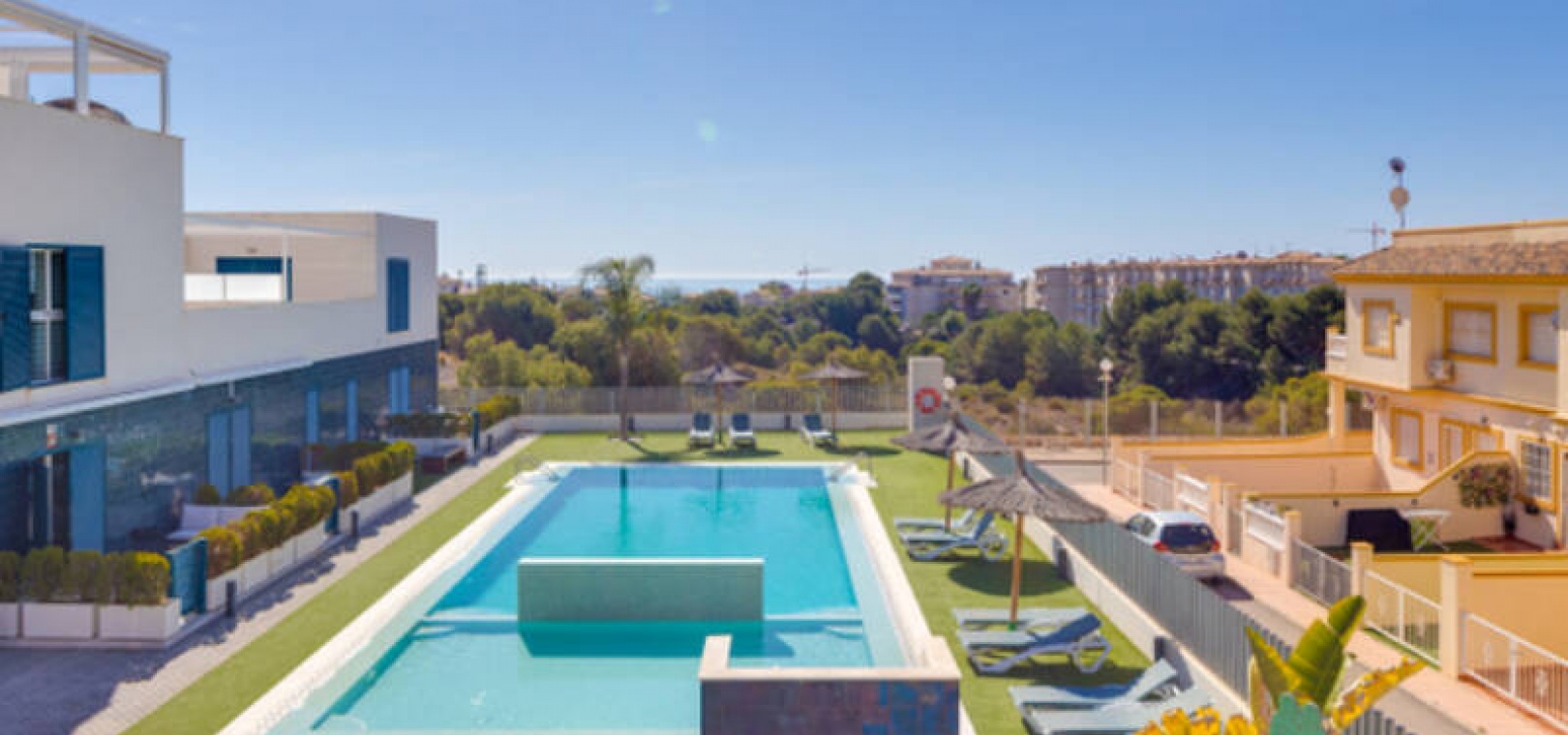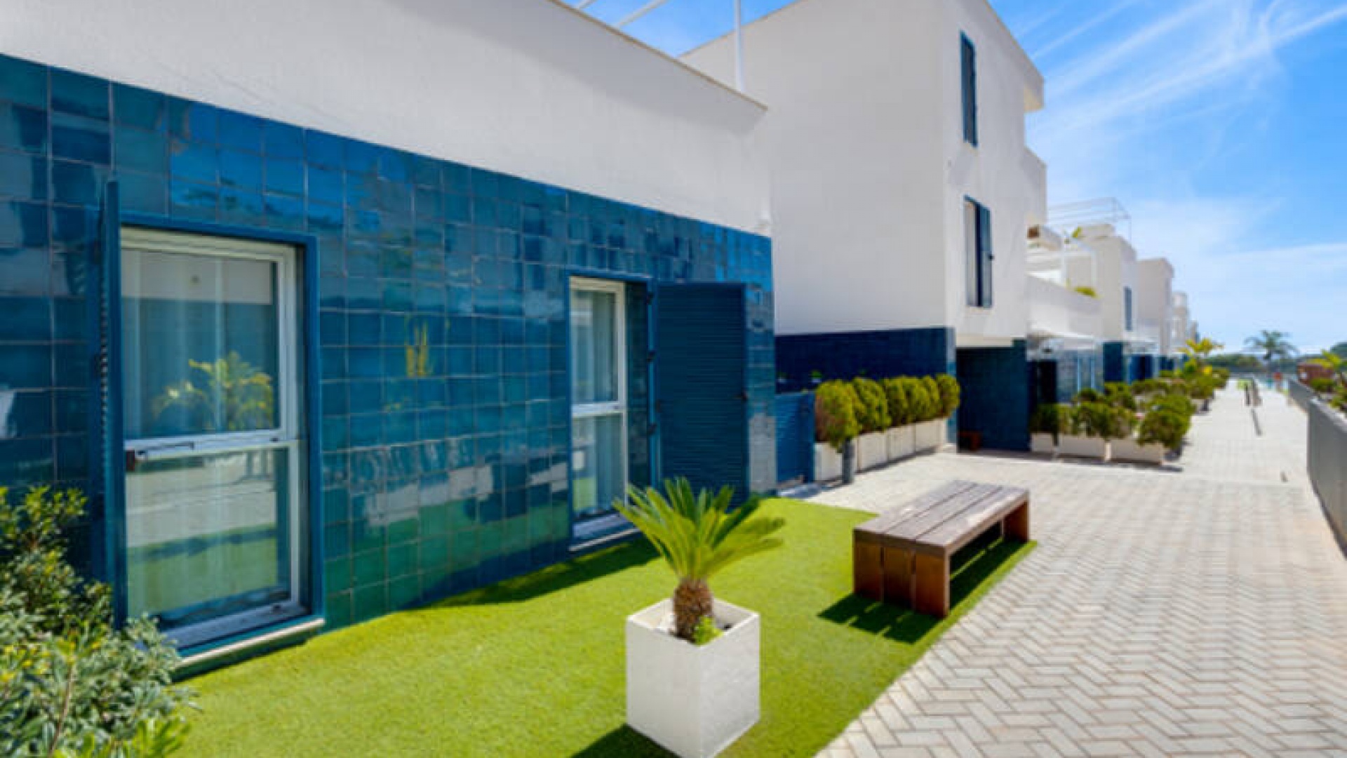 A l'extérieur, il y a une terrasse/jardin avant, une belle piscine commune, une aire de jeux pour enfants, une aire de pique-nique avec vue sur la mer au loin, une communauté fermée sécurisée, 2 places de parking souterraines et bien plus encore.