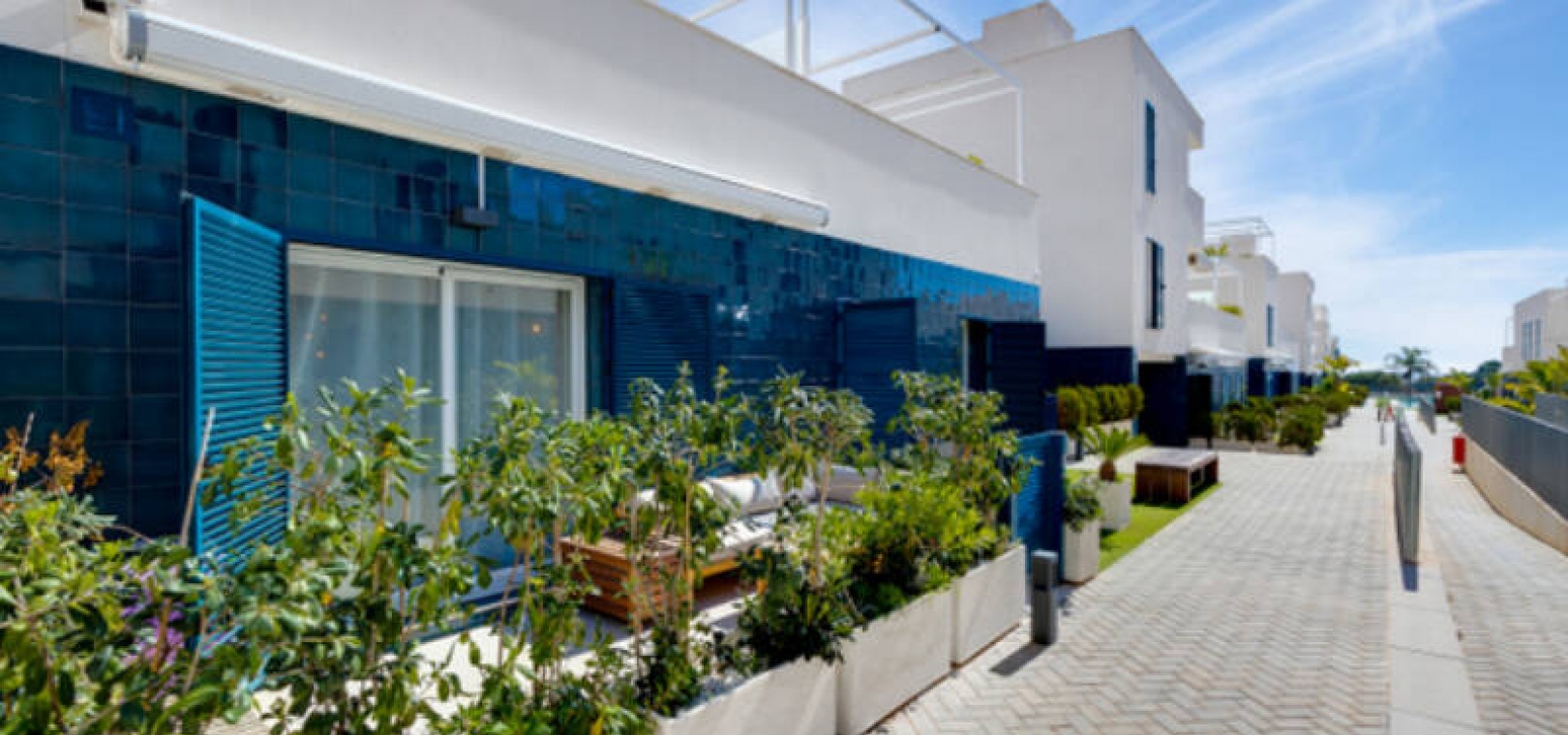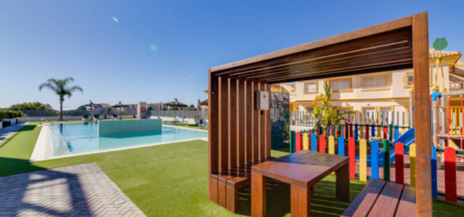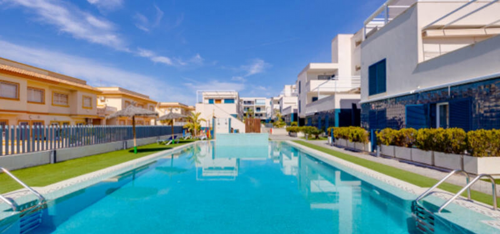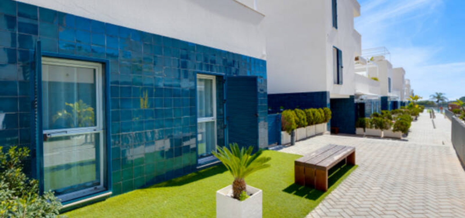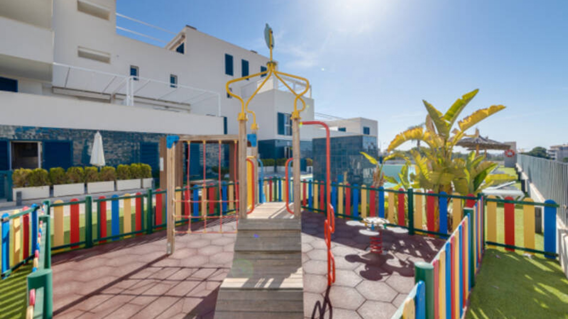 A l'extérieur, il y a une terrasse/jardin avant, une belle piscine commune, une aire de jeux pour enfants, une aire de pique-nique avec vue sur la mer au loin, une communauté fermée sécurisée, 2 places de parking souterraines et bien plus encore.