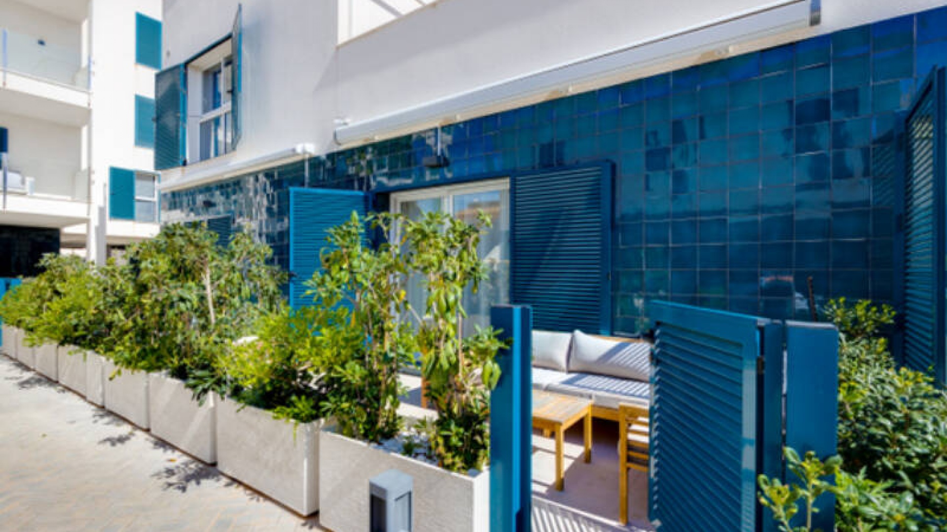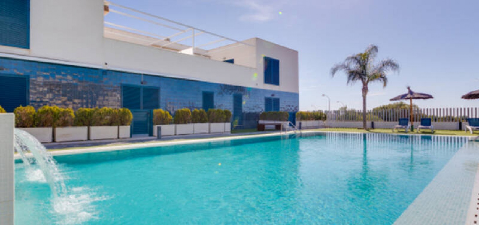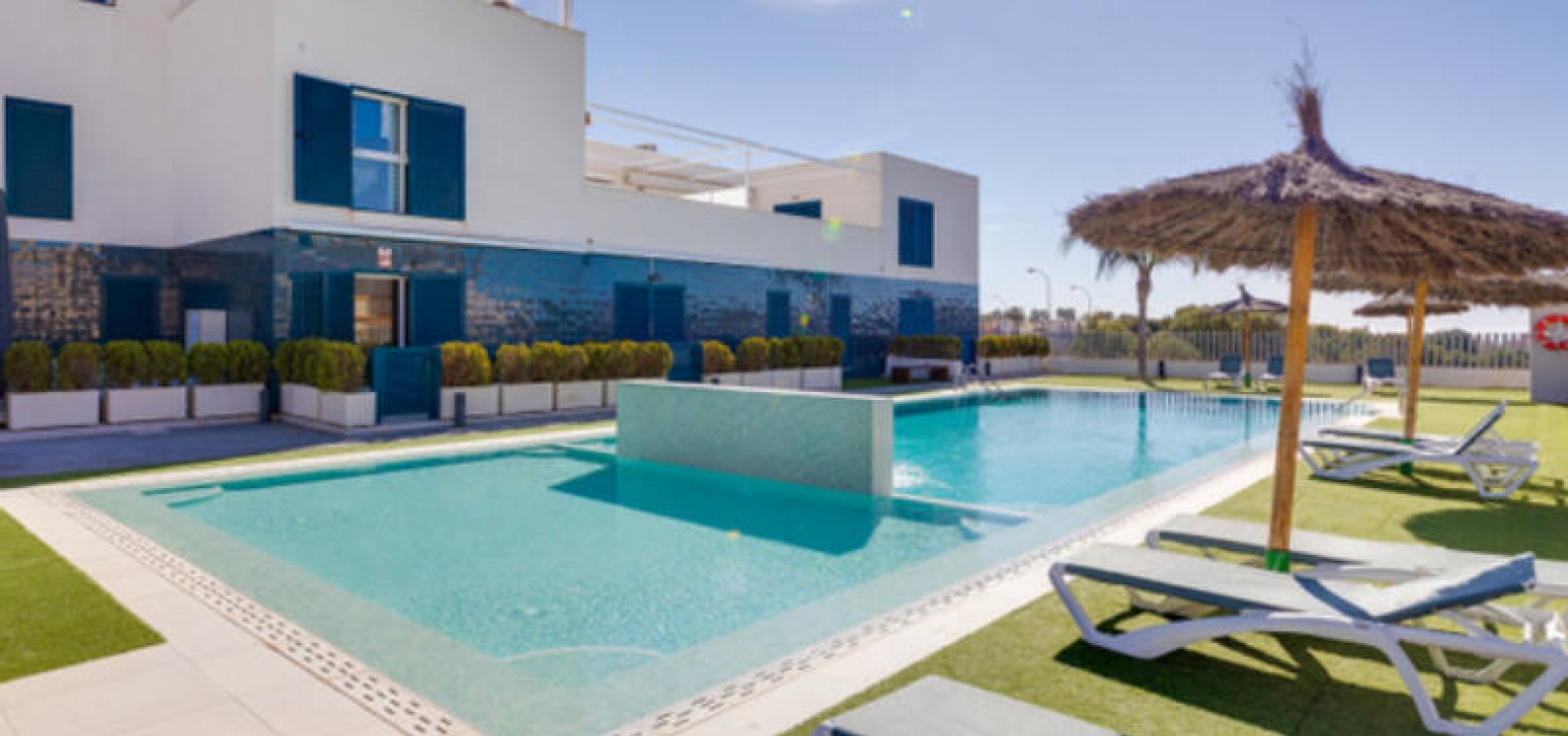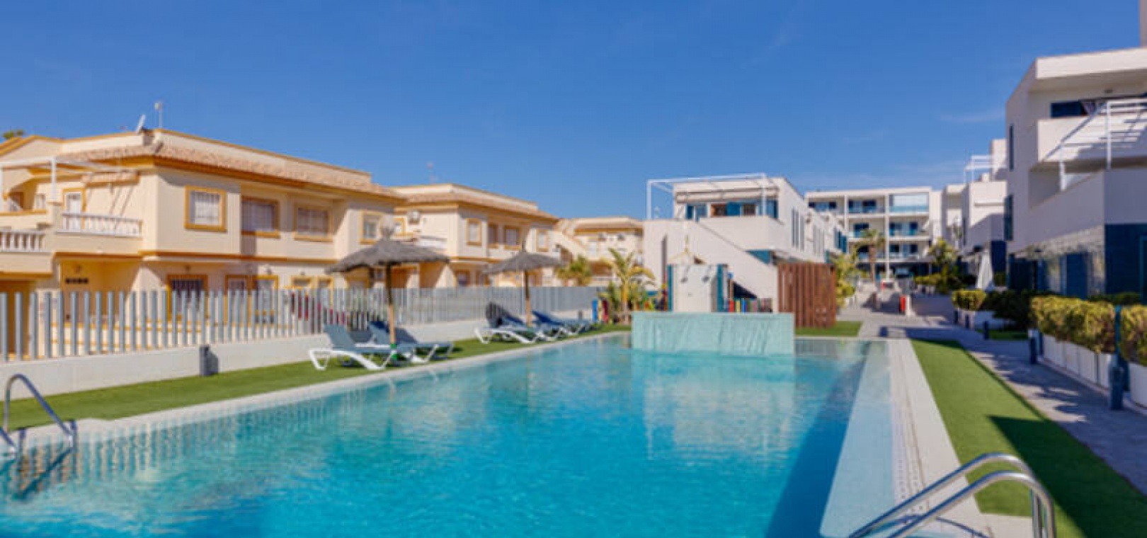 A l'extérieur, il y a une terrasse/jardin avant, une belle piscine commune, une aire de jeux pour enfants, une aire de pique-nique avec vue sur la mer au loin, une communauté fermée sécurisée, 2 places de parking souterraines et bien plus encore.