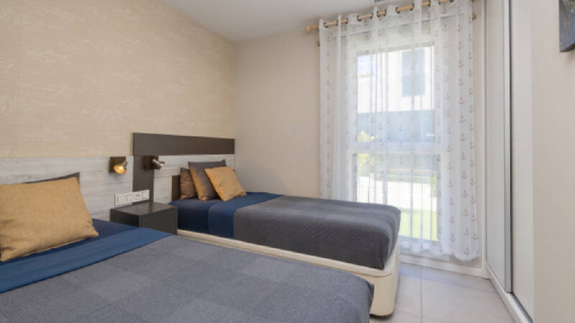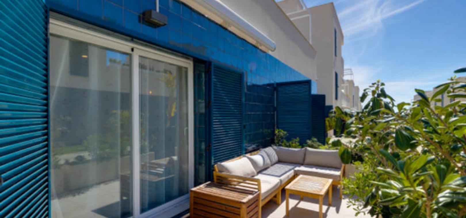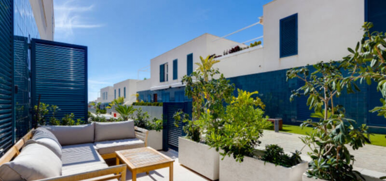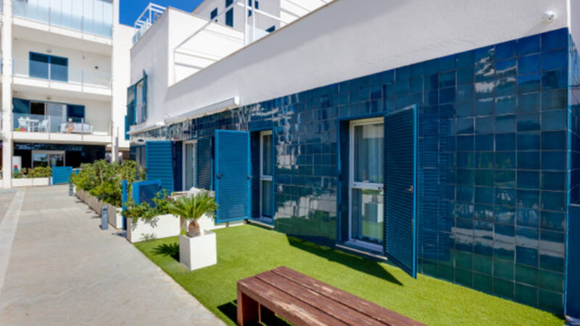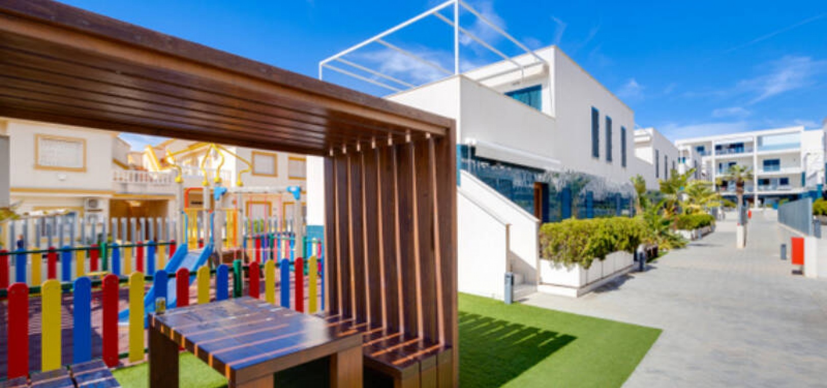 A l'extérieur, il y a une terrasse/jardin avant, une belle piscine commune, une aire de jeux pour enfants, une aire de pique-nique avec vue sur la mer au loin, une communauté fermée sécurisée, 2 places de parking souterraines et bien plus encore.