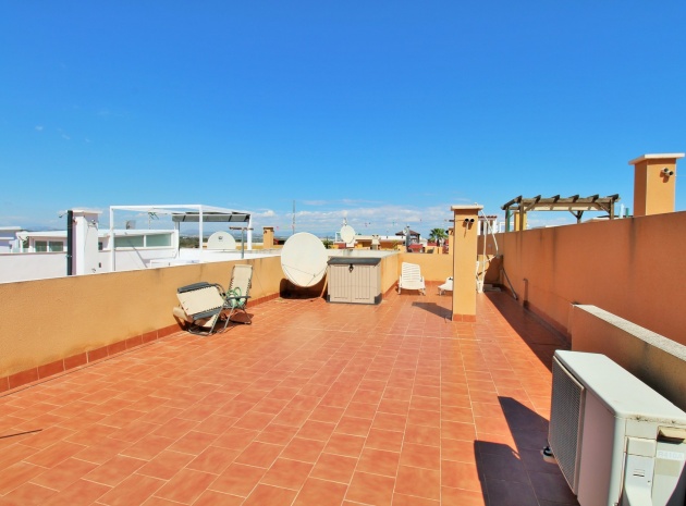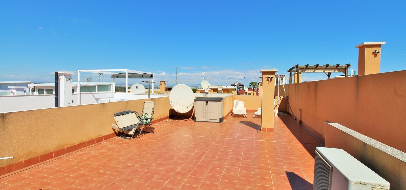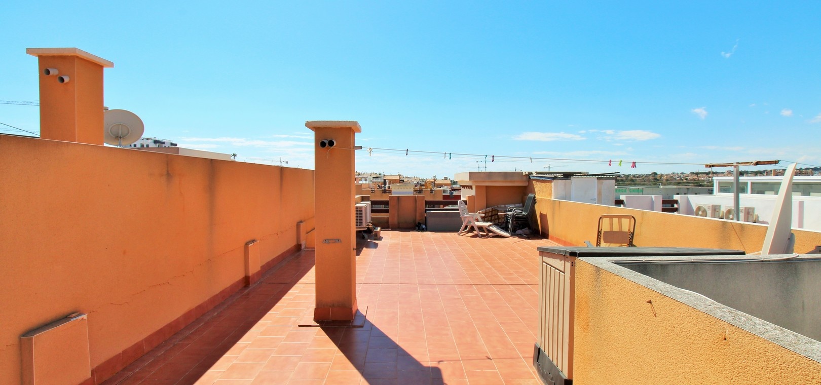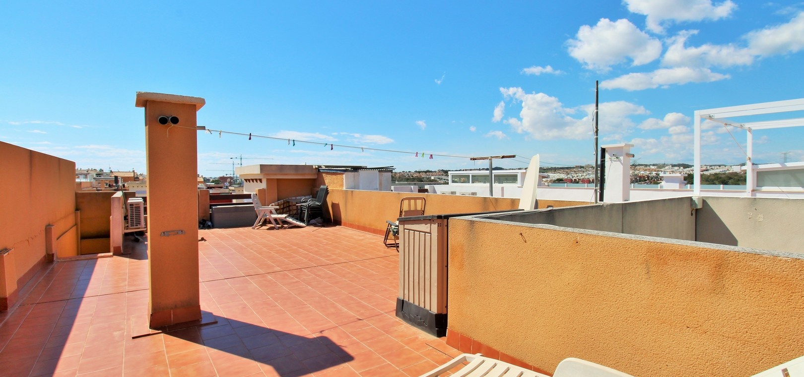 Lumineux appartement en attique exposé plein sud, comprenant deux chambres, deux salles de bains et un vaste solarium privé sur le toit, situé dans le quartier recherché de Dream Hills II à Los Altos, Orihuela Costa. Profitez d'un ensoleillement permanent grâce à son orientation idéale et à l'accès à une piscine commune et à un parking. Idéalement situé, à quelques pas d'un supermarché et du centre commercial Via Park III, qui propose une variété de bars, restaurants et boutiques. L'appartement comprend un salon et une salle à manger spacieux, une cuisine séparée à l'arrière, deux chambres avec placards intégrés et deux salles de bains. Des placards de rangement supplémentaires se trouvent dans le couloir. Les portes-fenêtres du salon s'ouvrent sur un balcon couvert exposé sud, avec un escalier extérieur menant à l'impressionnant solarium privé sur le toit, idéal pour les barbecues, les réceptions ou tout simplement pour profiter du soleil. Vendu meublé et équipé de la climatisation. Dream Hills II se situe à la frontière entre Orihuela Costa et Torrevieja (Los Balcones), offrant un excellent accès à l'autoroute AP-7 et à la route côtière N-332. L'aéroport d'Alicante est à moins de 45 minutes en voiture. Visionnage anticipé recommandé.
