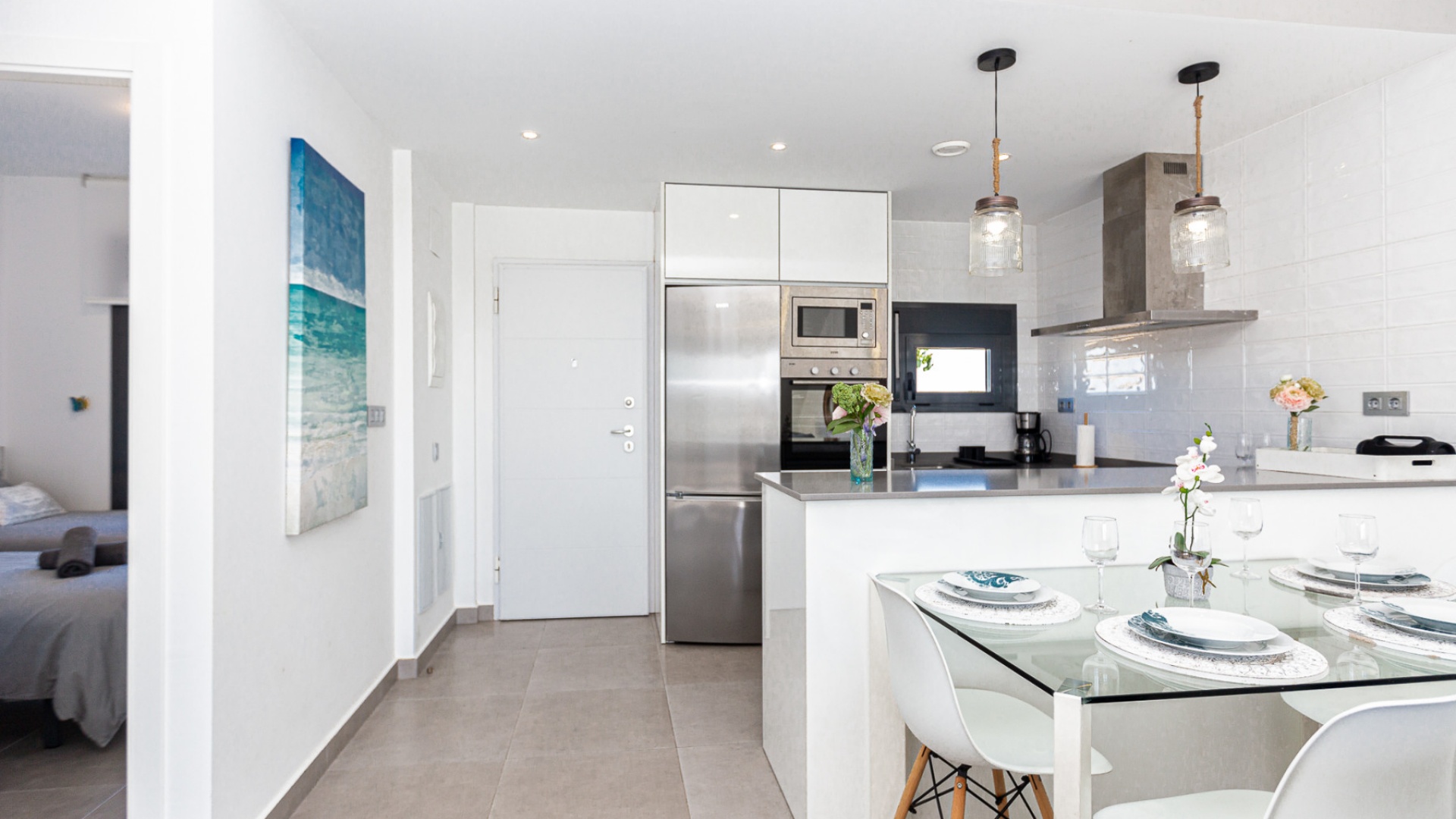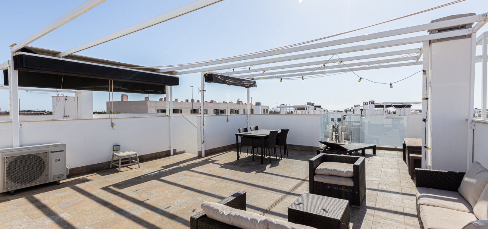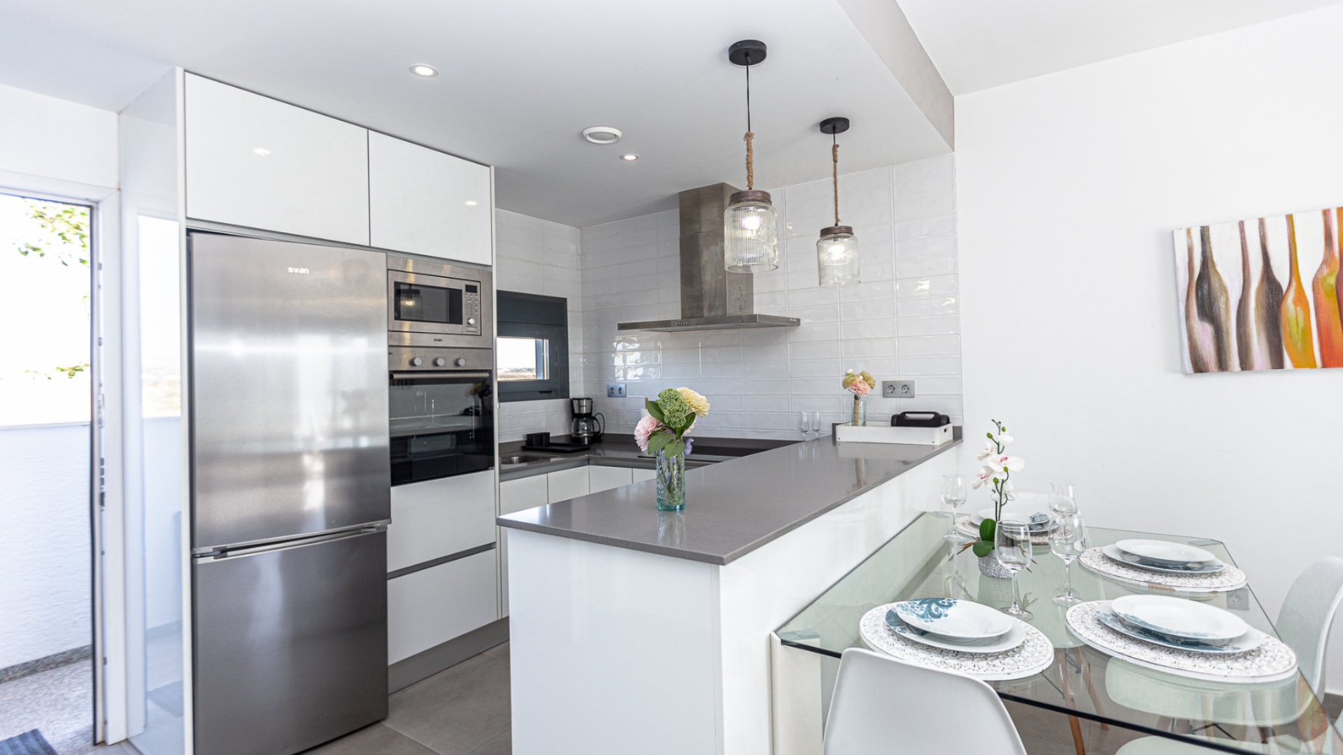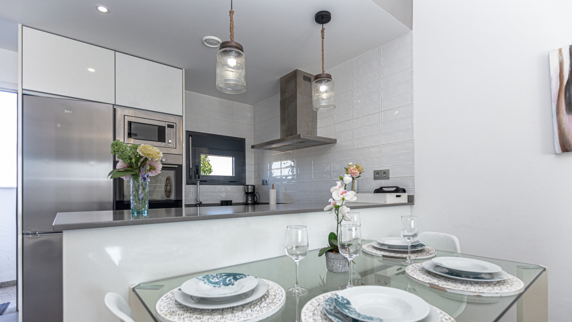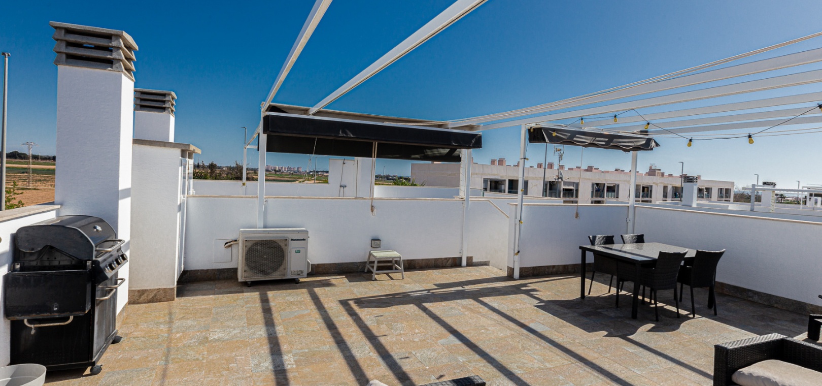 Nous vous présentons ce charmant appartement situé au dernier étage du prestigieux complexe résidentiel Lamar II à Pilar de la Horadada. Doté d'une entrée indépendante par un escalier extérieur, vous serez accueilli par une lumineuse cuisine américaine avec bar à droite, ouverte sur un spacieux salon-salle à manger. De là, vous accéderez à une terrasse ensoleillée et à un escalier menant à un solarium privé équipé d'un store, idéal pour profiter du soleil toute l'année.