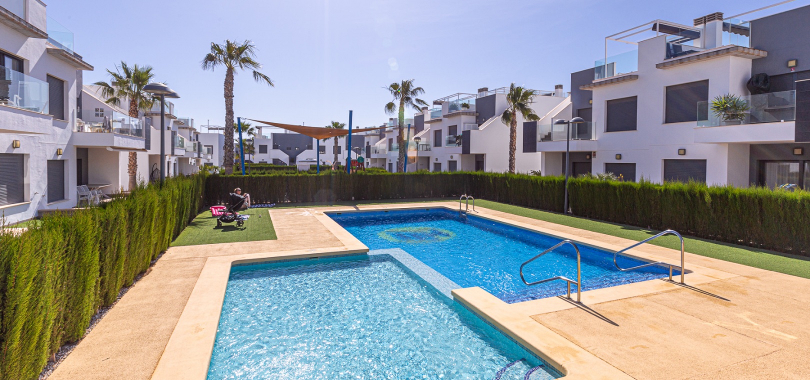 À l'intérieur, la propriété comprend deux chambres et deux salles de bains, dont une attenante. Elle est climatisée et vendue entièrement meublée, avec mobilier de jardin. La résidence fermée comprend deux piscines communes, une aire de jeux pour enfants et un débarras, tous deux inclus dans le prix.