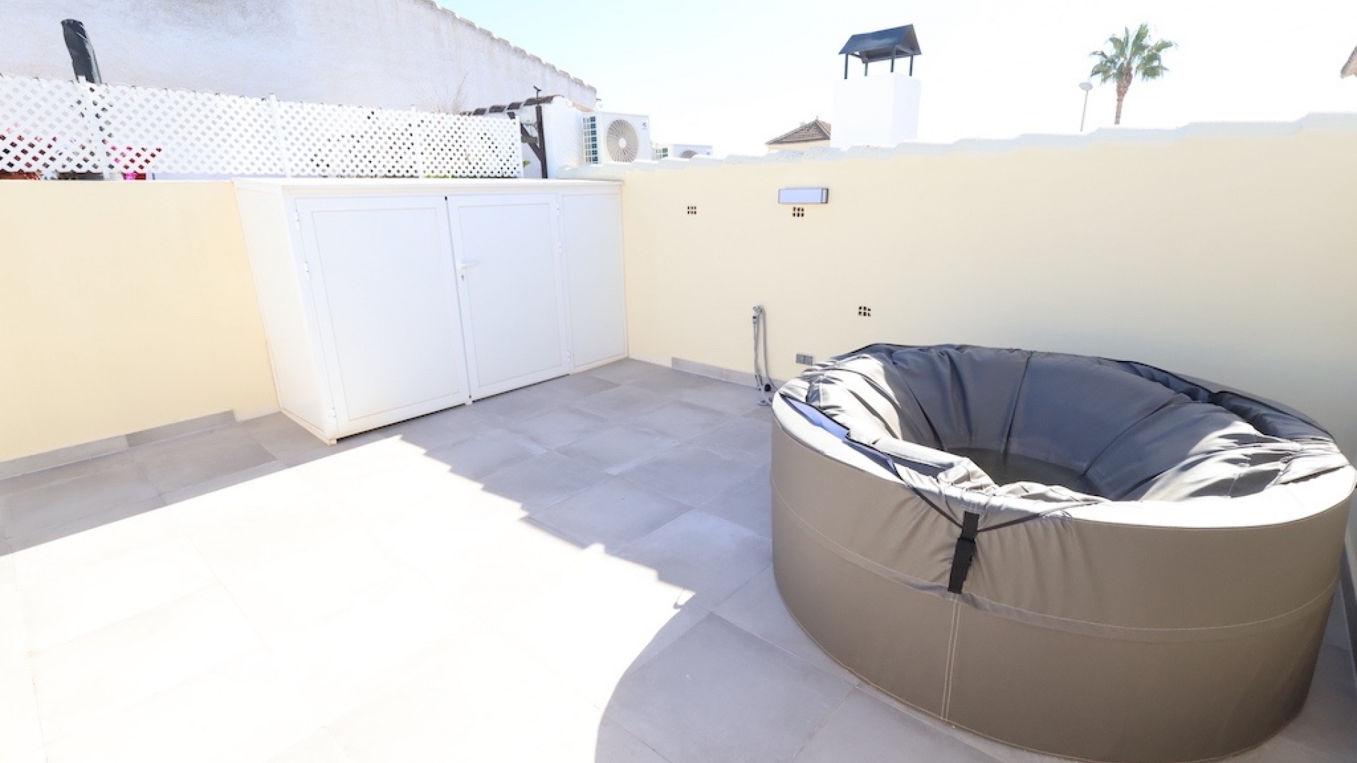 Ciudad Quesada, magnifique bungalow au rez-de-chaussée sans voisin au-dessus et exposé sud, propriété totalement réformée de 77 m2 avec 2 chambres, salle de bain, cuisine ouverte sur le séjour, terrasse et grand solarium de 30 m2 avec jacuzzi et débarras, jardin carrelé de 20 m2, la propriété est vendue meublée et équipée, dispose du chauffage au sol dans toute la maison et de la climatisation.