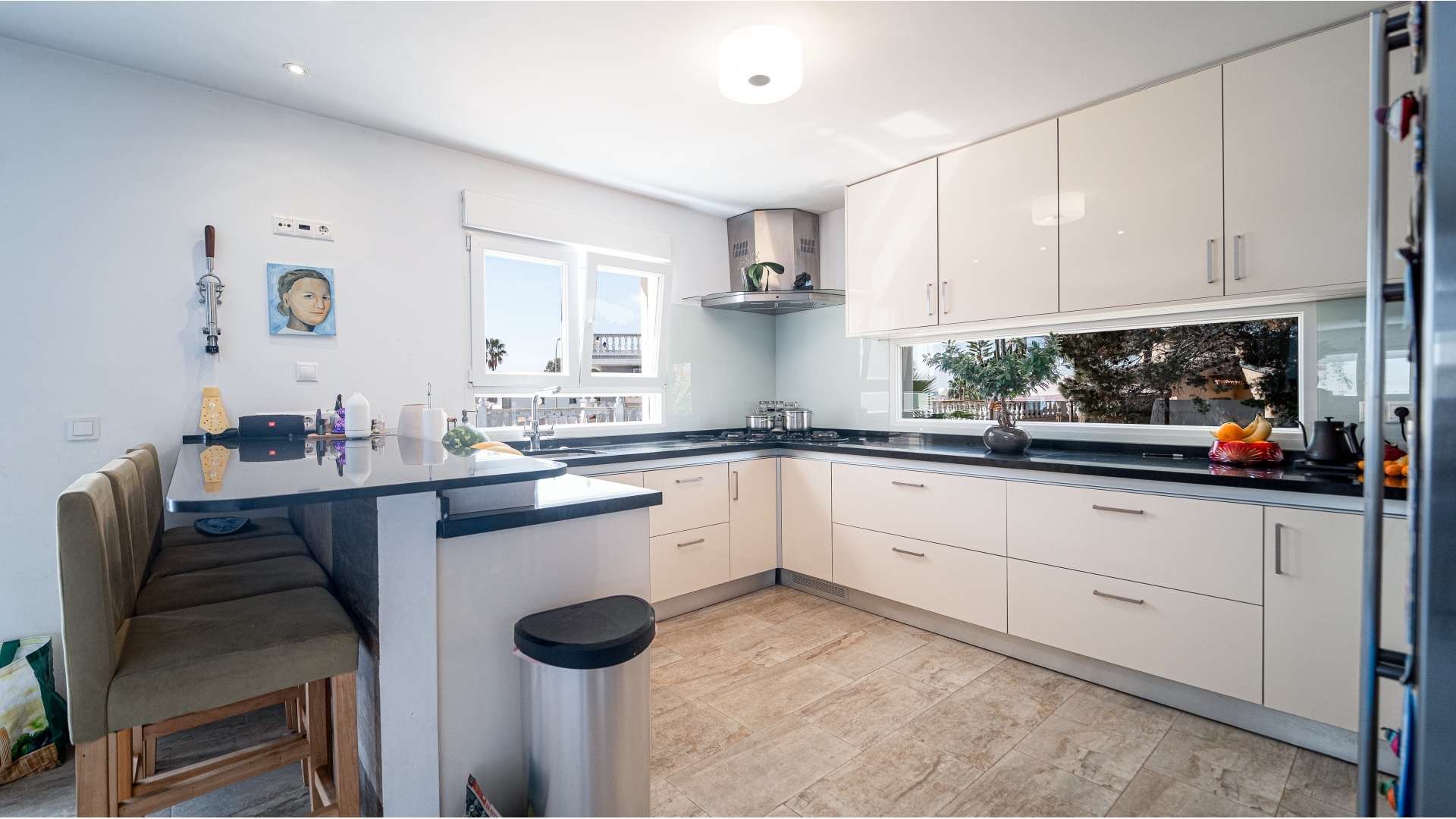Villa impeccable sur un grand terrain arboré de néfliers, d'oliviers, de pins et de palmiers. Elle comprend trois chambres doubles, un dressing, un bureau donnant sur l'espace vert, trois salles de bains, un WC, un salon avec cheminée, une cuisine ouverte avec coin repas, un demi sous-sol divisé en trois pièces comprenant une buanderie, une salle de jeux, un salon de coiffure et une salle de bains. Le dernier étage donne accès à la terrasse et au solarium avec vue sur le lac et le parc. Des panneaux solaires sont installés sur la terrasse. Un débarras avec chaufferie et une piscine privée de 5 x 12 m² sont également à votre disposition. L'entrée du terrain offre suffisamment d'espace pour garer environ trois voitures. Une excellente option pour acquérir la maison de vos rêves !