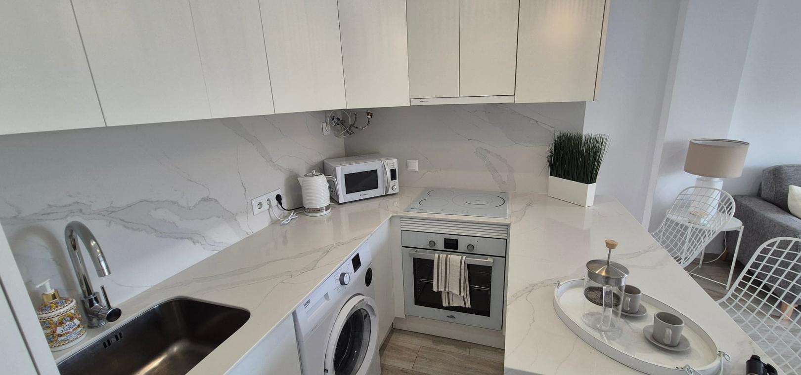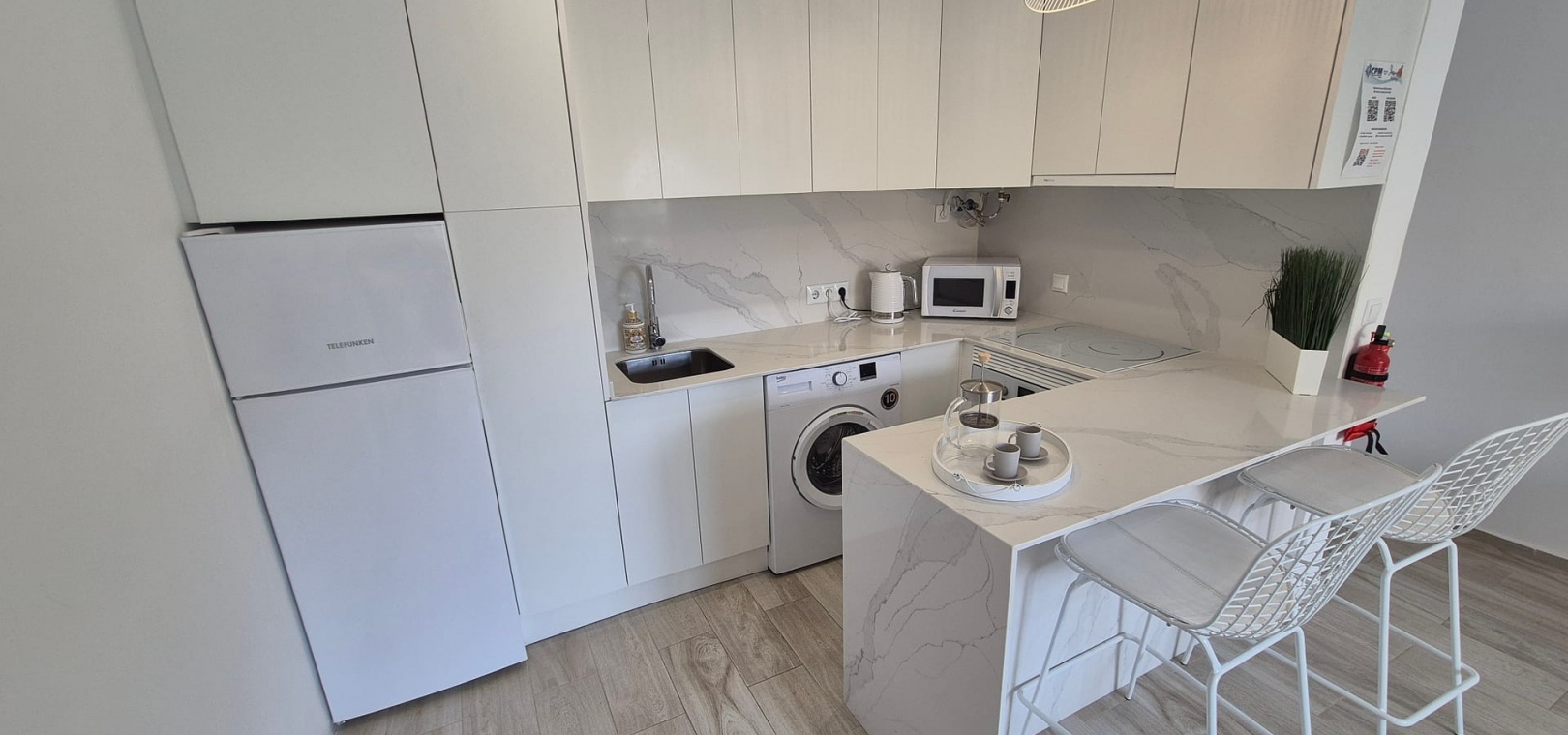 Entrez dans un espace de vie ouvert, lumineux et spacieux, soigneusement conçu et meublé avec goût, selon des normes de qualité élevées. La cuisine moderne est entièrement équipée d'appareils électroménagers haut de gamme, dont un lave-linge, un réfrigérateur-congélateur, un four et une plaque à induction. Vous n'aurez plus qu'à emménager et profiter pleinement de votre séjour.