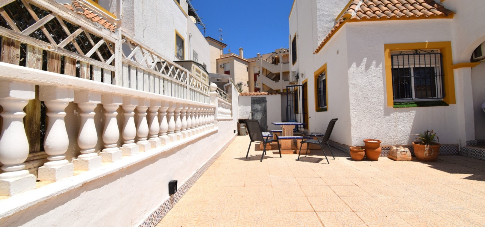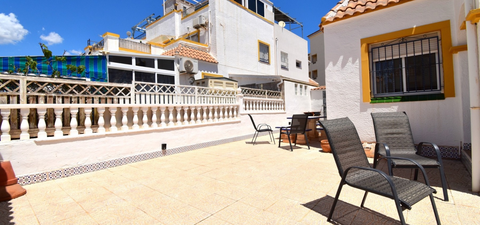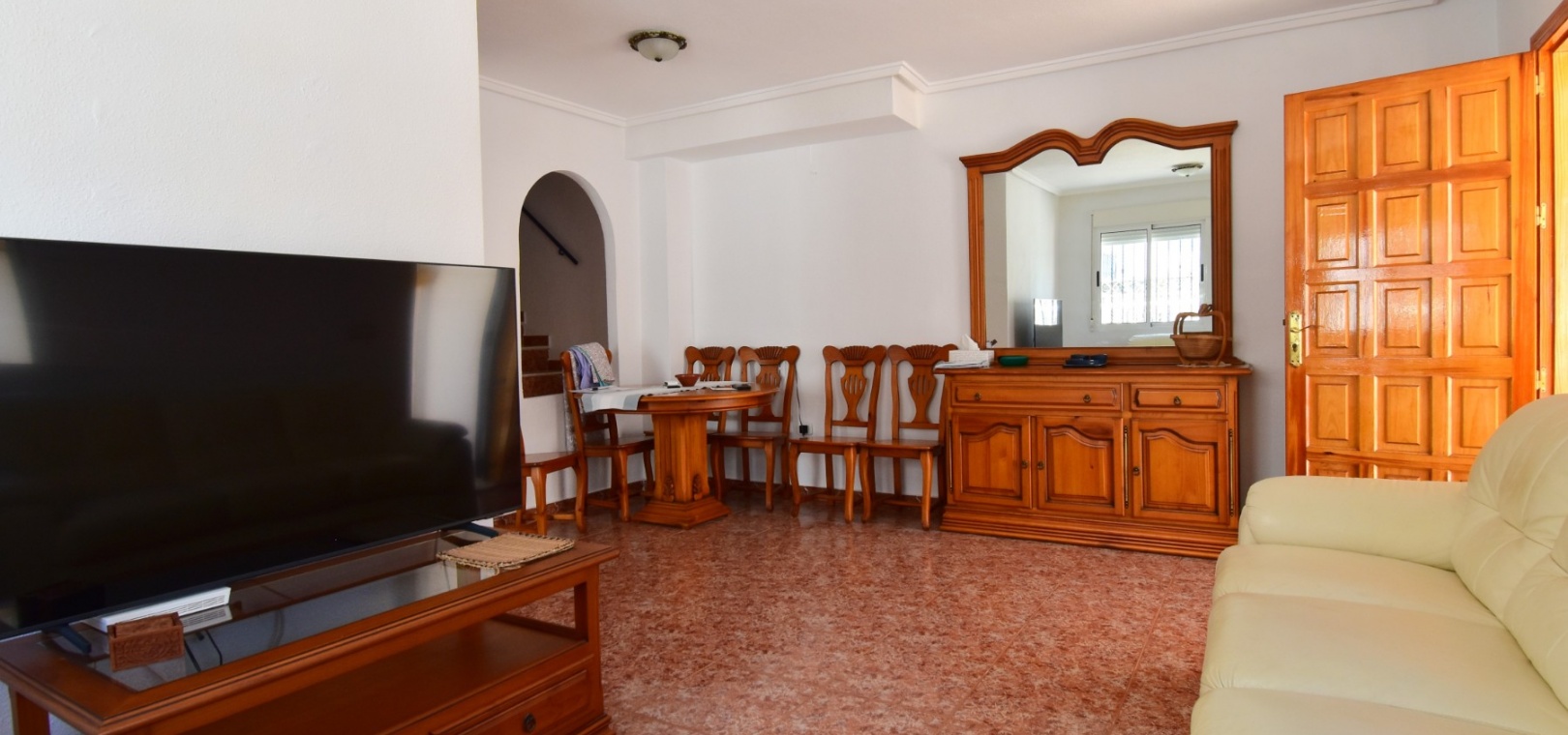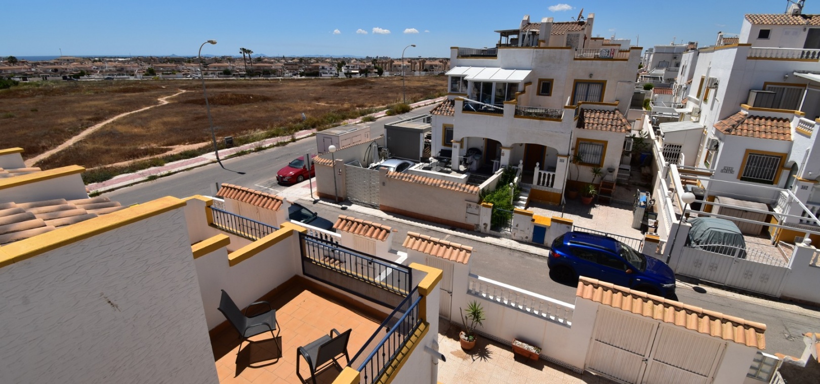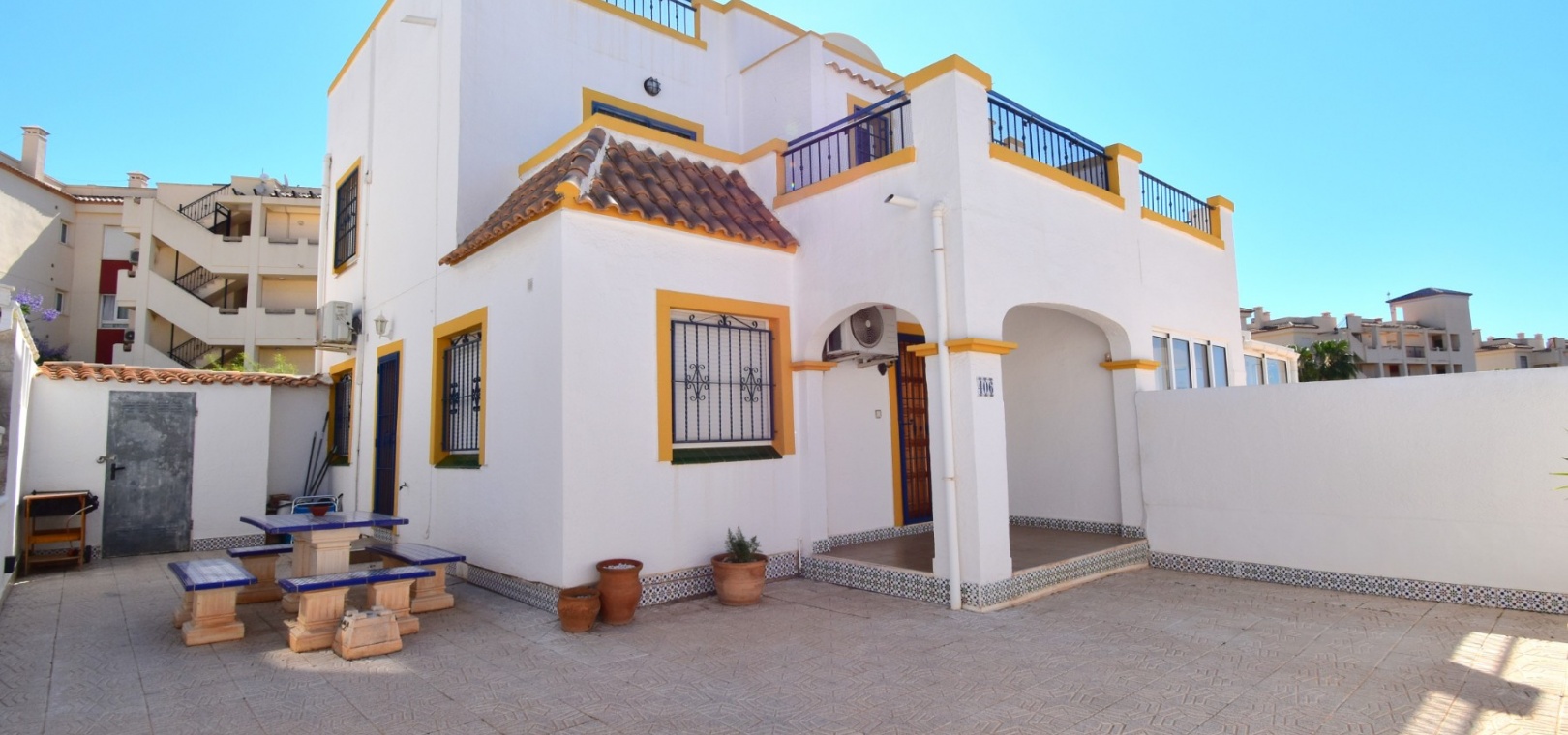 Cette villa mitoyenne de trois chambres, exposée sud-ouest, à Playa Flamenca est située à seulement cinq minutes à pied de nombreux commerces et services, et à seulement cinq minutes en voiture des magnifiques plages d'Orihuela Costa. Spacieuse et en très bon état, cette villa dispose d'une cuisine séparée entièrement équipée et de grilles de sécurité aux fenêtres et aux portes. Les trois chambres sont doubles et disposent de placards intégrés. La chambre principale donne accès à une terrasse privée au premier étage. La propriété comprend une salle de bains et une salle d'eau, toutes climatisées pour un confort optimal toute l'année. À l'entrée, une petite terrasse couverte offre un espace extérieur accueillant, tandis qu'un escalier intérieur mène au solarium privé, offrant une vue imprenable sur les environs et la mer au loin. À l'extérieur, la villa bénéficie d'un jardin carrelé facile d'entretien avec un parking hors voirie, un cellier et un accès à une belle piscine commune. Située au cœur de la Costa Blanca Sud, cette maison allie parfaitement commodité, confort et style de vie côtier.