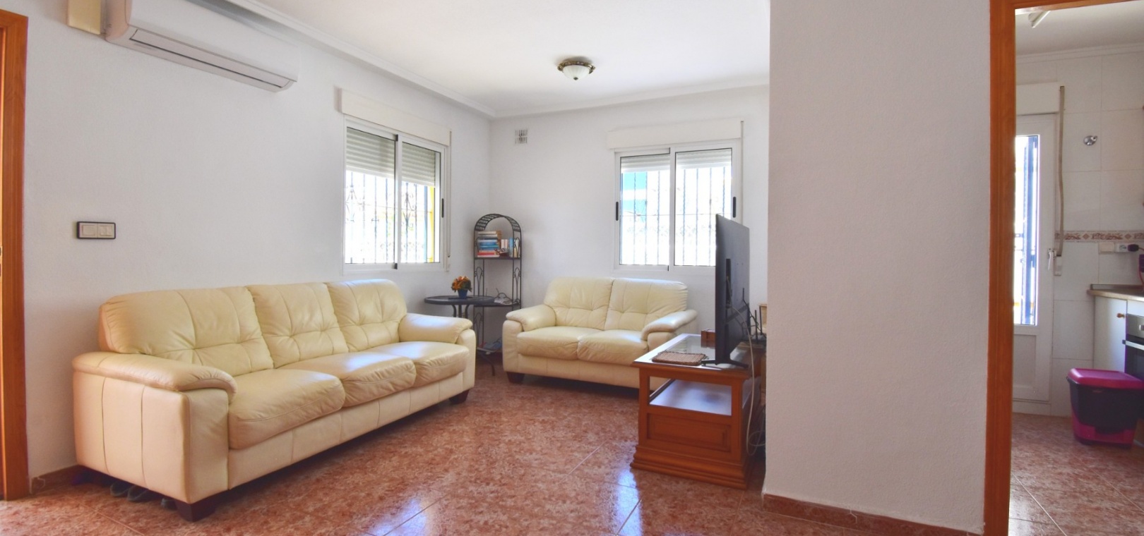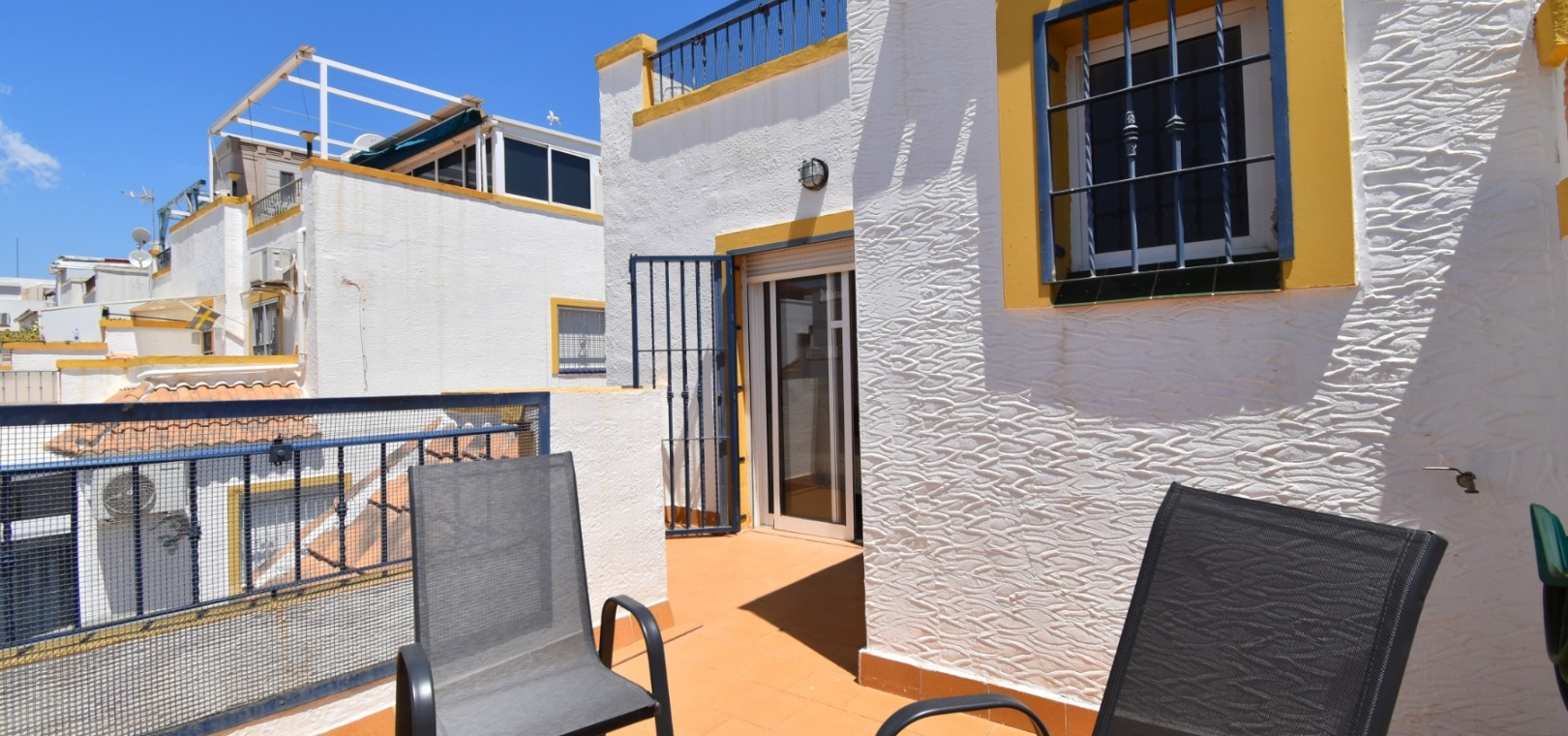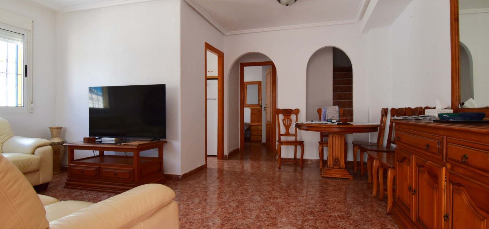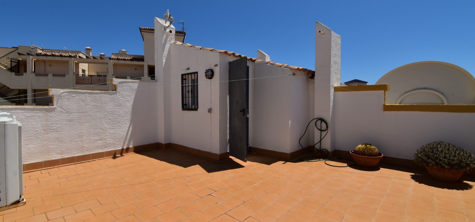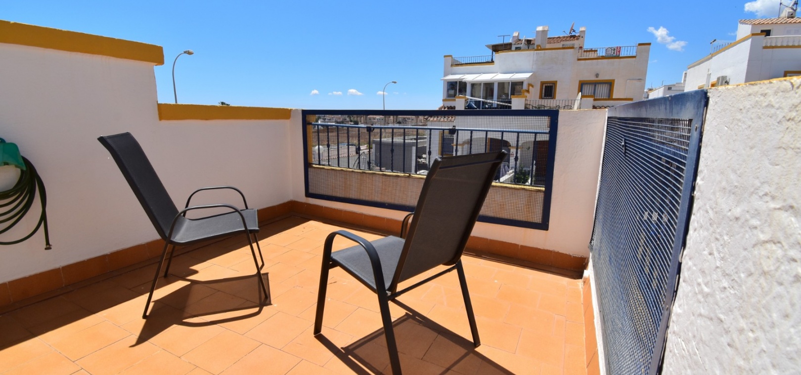 Cette villa mitoyenne de trois chambres, exposée sud-ouest, à Playa Flamenca est située à seulement cinq minutes à pied de nombreux commerces et services, et à seulement cinq minutes en voiture des magnifiques plages d'Orihuela Costa. Spacieuse et en très bon état, cette villa dispose d'une cuisine séparée entièrement équipée et de grilles de sécurité aux fenêtres et aux portes. Les trois chambres sont doubles et disposent de placards intégrés. La chambre principale donne accès à une terrasse privée au premier étage. La propriété comprend une salle de bains et une salle d'eau, toutes climatisées pour un confort optimal toute l'année. À l'entrée, une petite terrasse couverte offre un espace extérieur accueillant, tandis qu'un escalier intérieur mène au solarium privé, offrant une vue imprenable sur les environs et la mer au loin. À l'extérieur, la villa bénéficie d'un jardin carrelé facile d'entretien avec un parking hors voirie, un cellier et un accès à une belle piscine commune. Située au cœur de la Costa Blanca Sud, cette maison allie parfaitement commodité, confort et style de vie côtier.