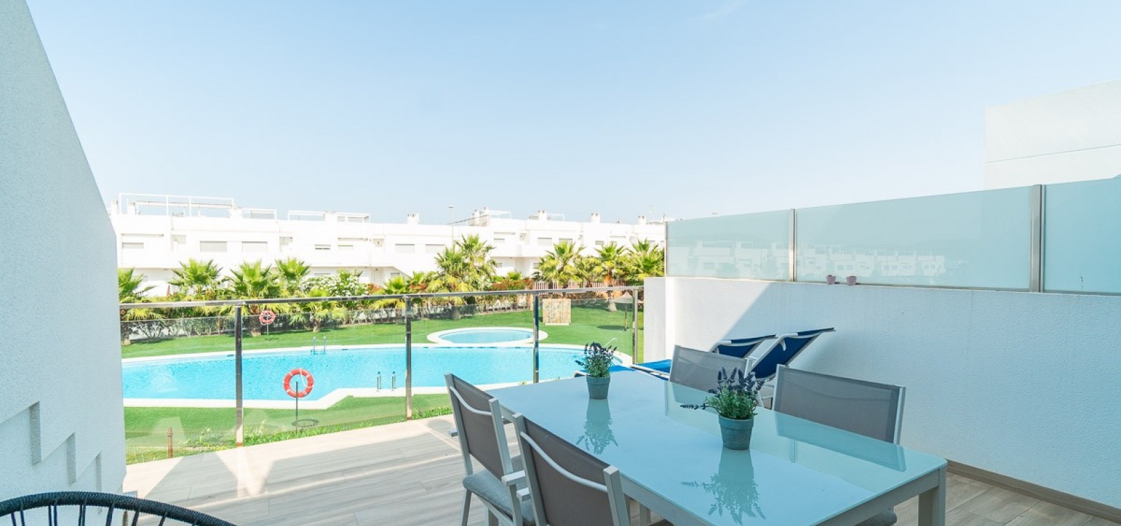 Les espaces communs sont verdoyants et bien aménagés avec différents espaces : pétanque, espace détente, piscine commune.