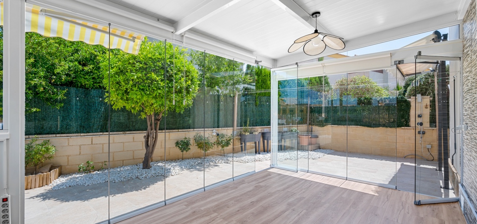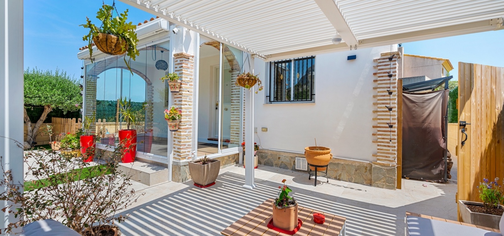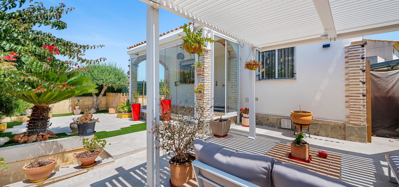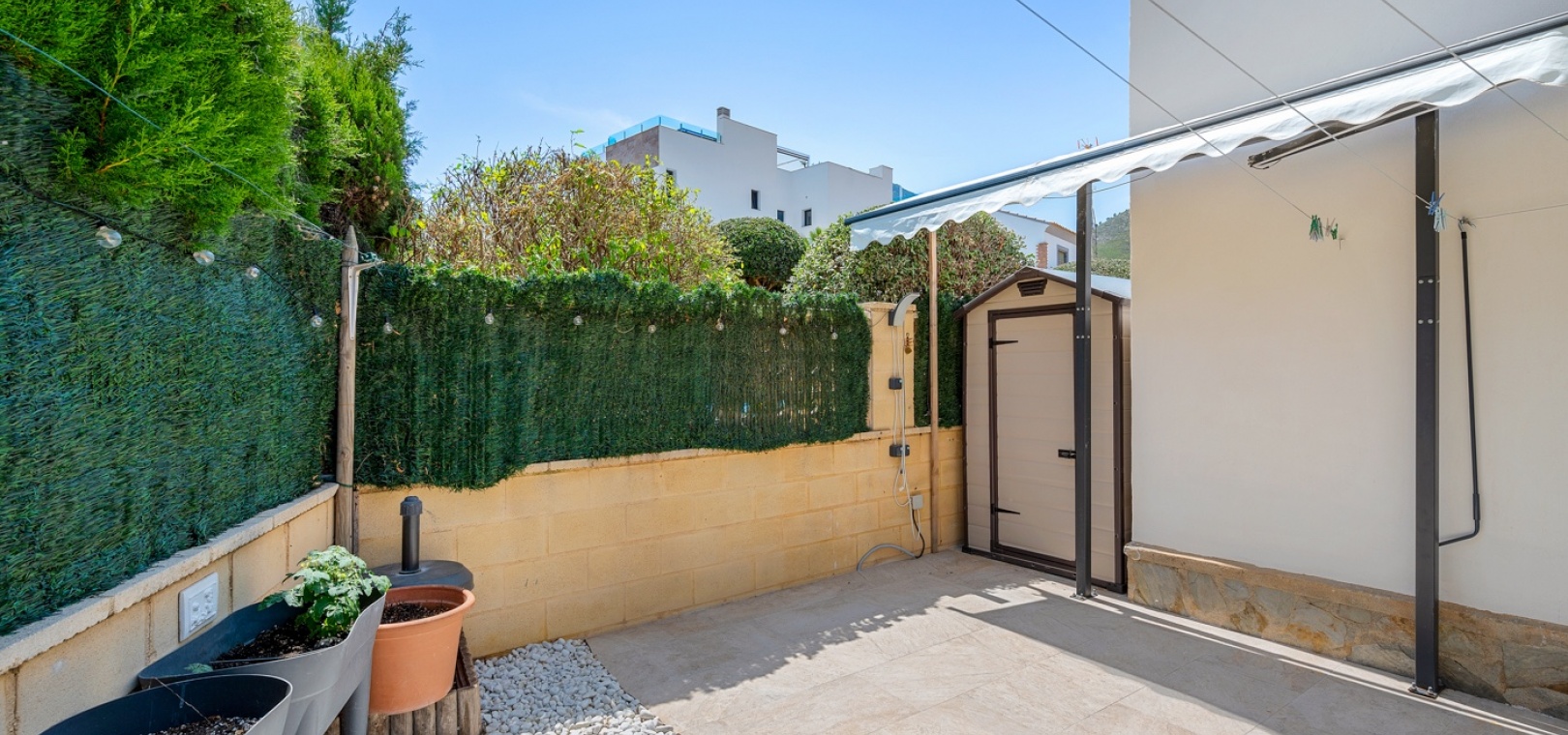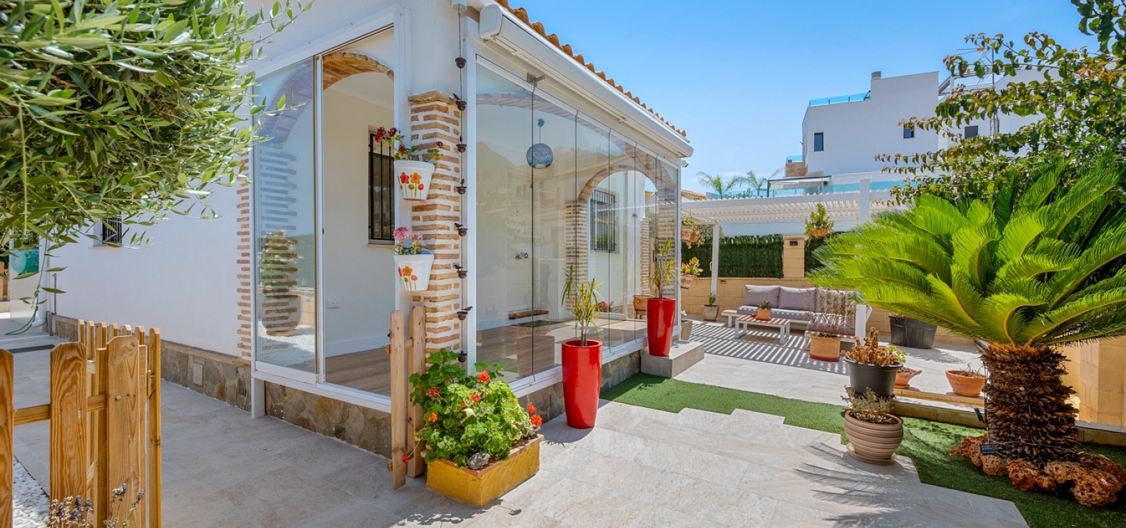 ExtérieurLa villa dispose d’un charmant jardin et d’une terrasse vitrée à l’avant. Dans le jardin avant, il y a également une zone de stationnement couverte, actuellement utilisée comme espace salon. Sur le côté de la maison, se trouve un débarras. Une autre terrasse vitrée se trouve dans le jardin arrière. Dans cette partie du jardin, on trouve également une douche extérieure et de l’espace pour un autre coin salon.À l’étage, il y a une terrasse avec vue sur la mer.