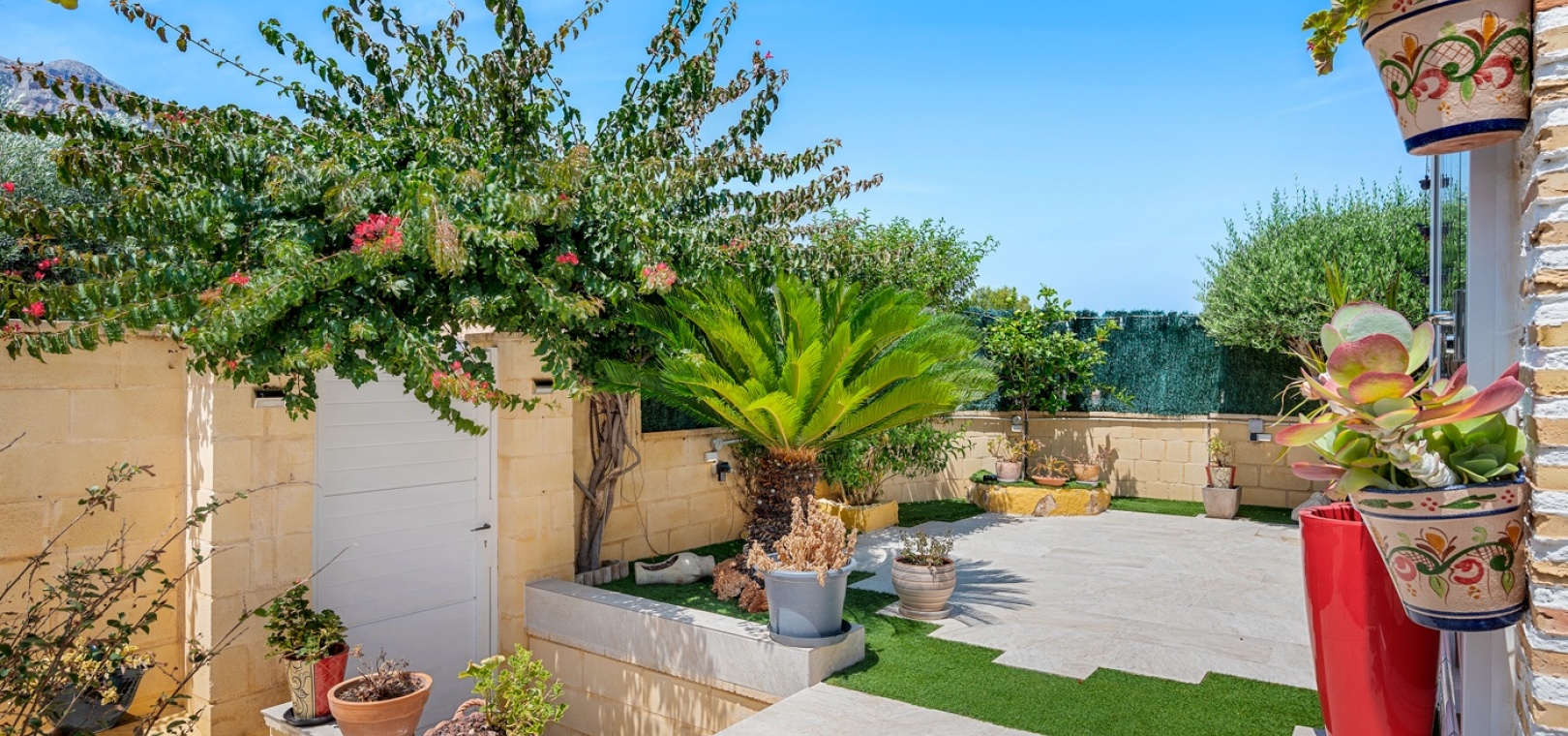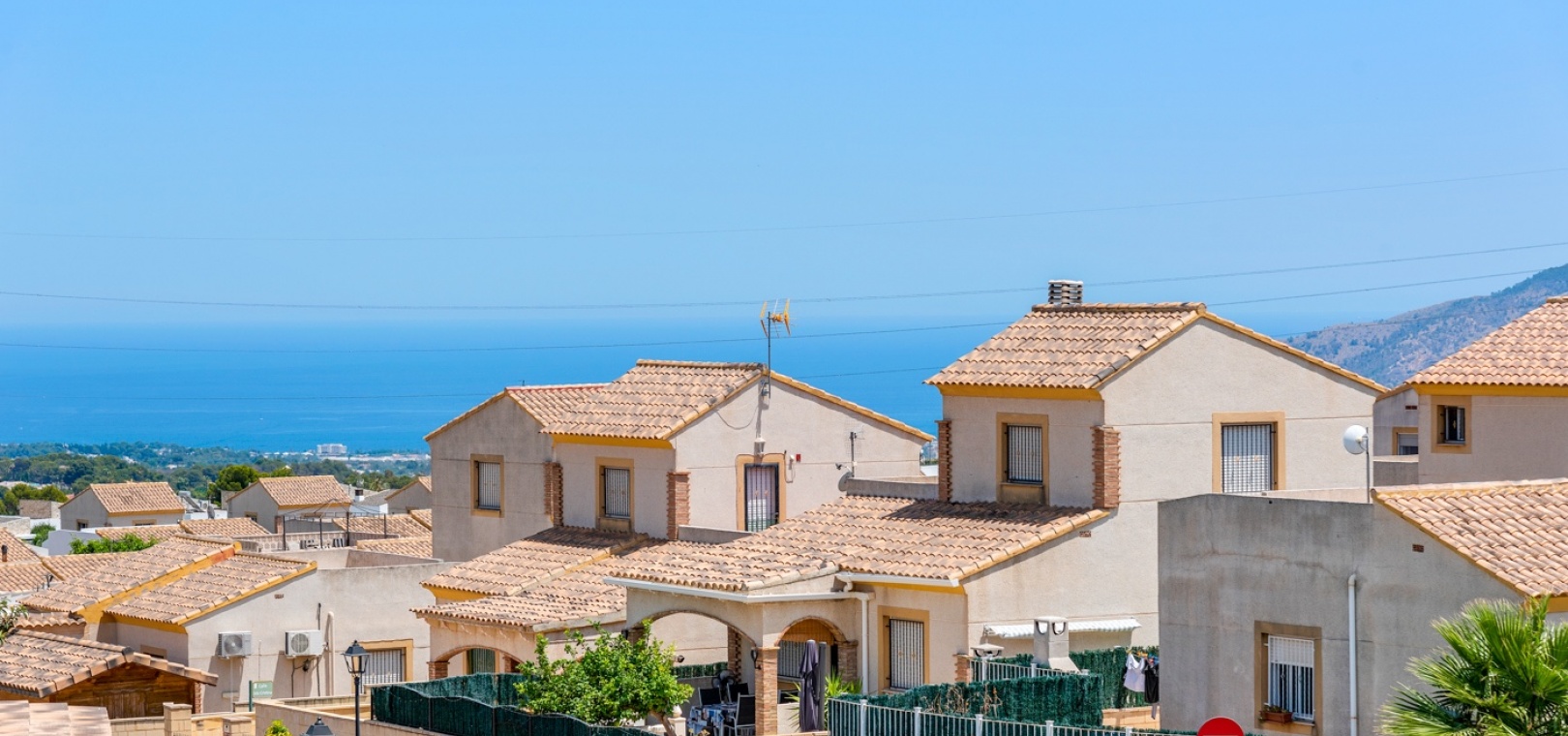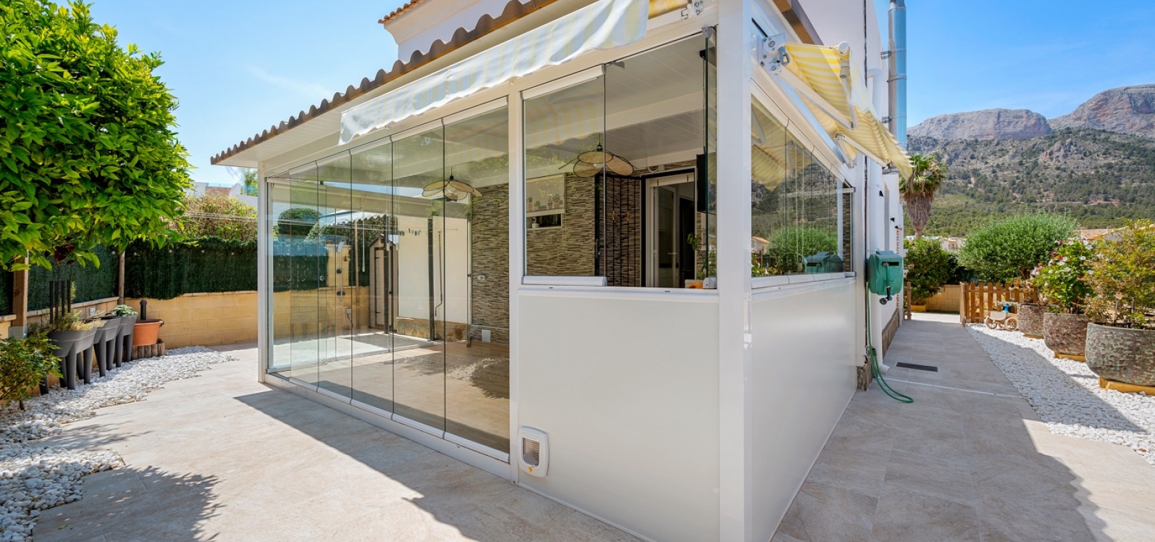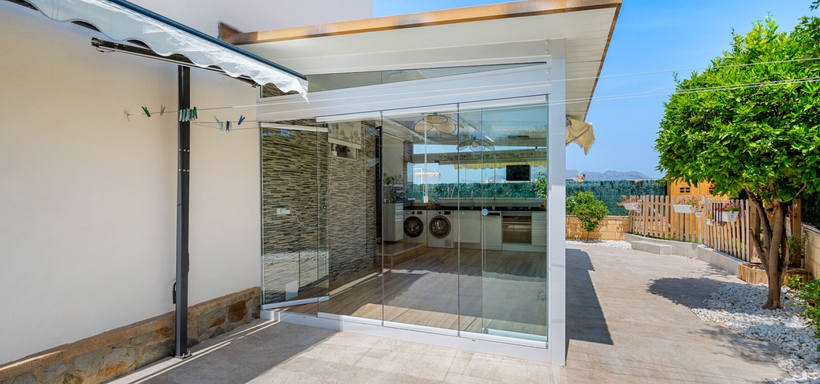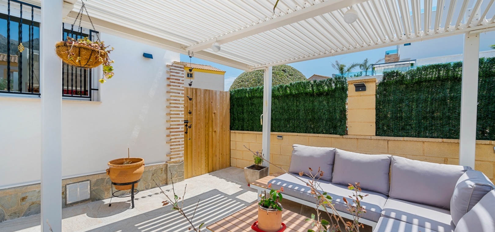 ExtérieurLa villa dispose d’un charmant jardin et d’une terrasse vitrée à l’avant. Dans le jardin avant, il y a également une zone de stationnement couverte, actuellement utilisée comme espace salon. Sur le côté de la maison, se trouve un débarras. Une autre terrasse vitrée se trouve dans le jardin arrière. Dans cette partie du jardin, on trouve également une douche extérieure et de l’espace pour un autre coin salon.À l’étage, il y a une terrasse avec vue sur la mer.