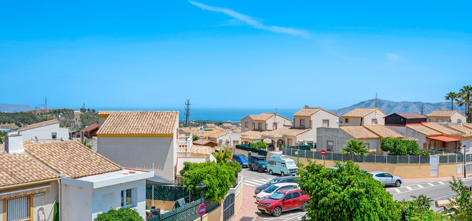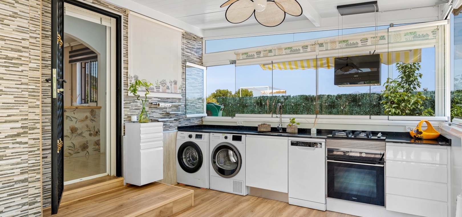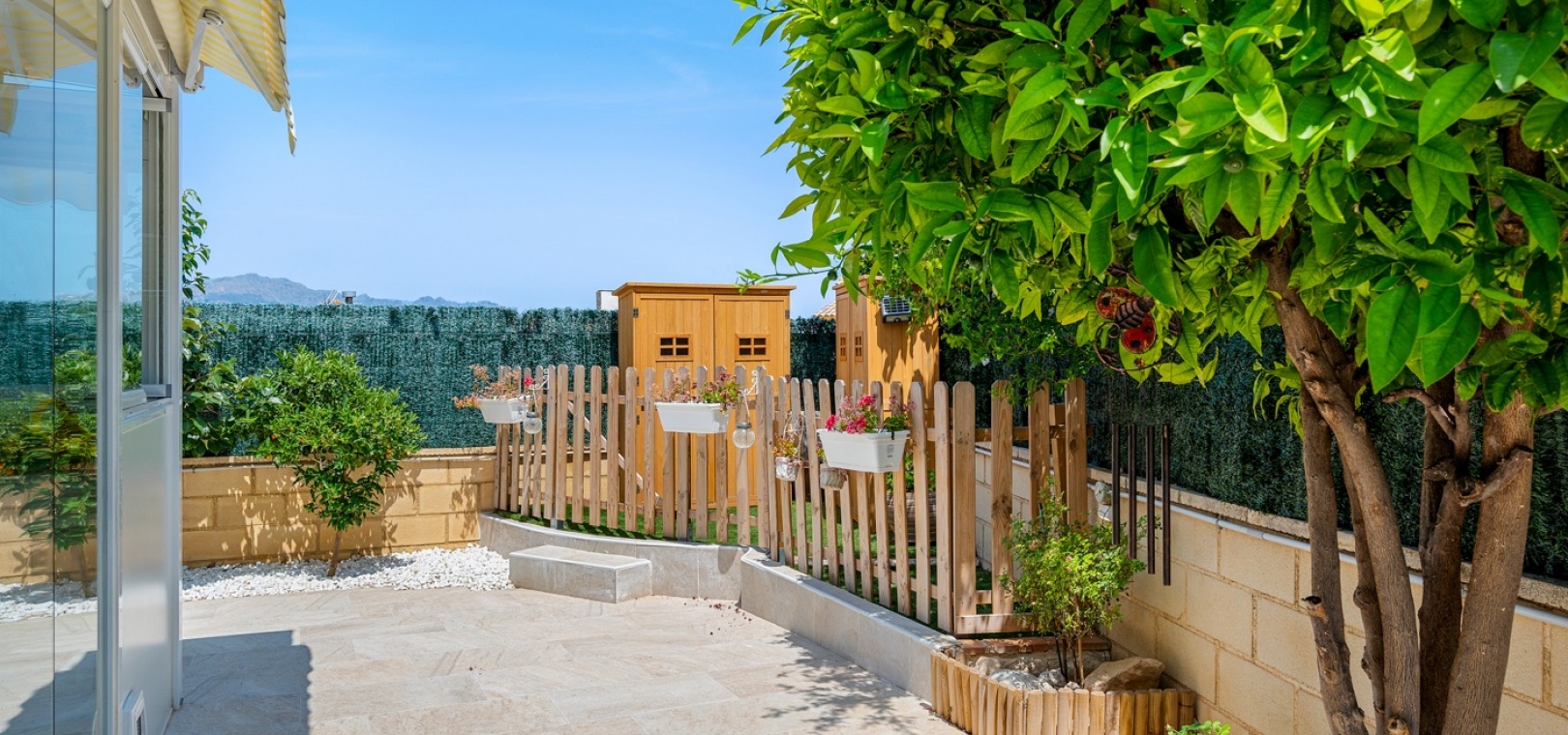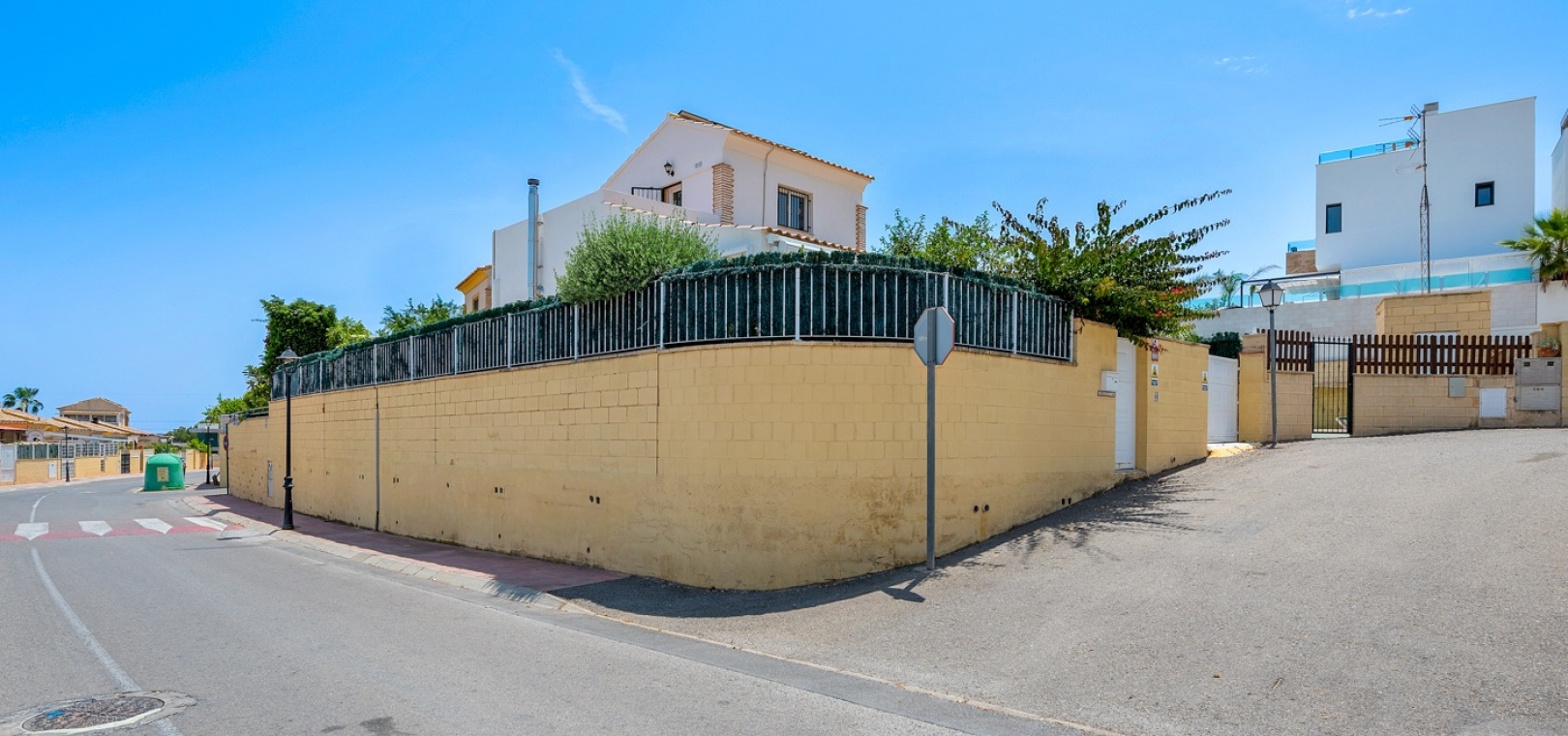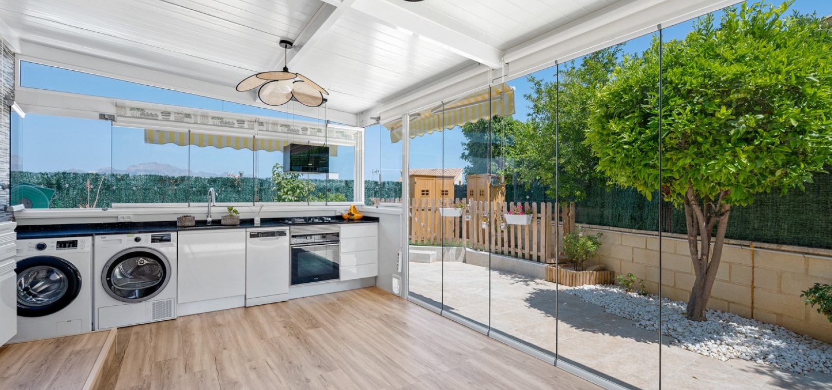 ExtérieurLa villa dispose d’un charmant jardin et d’une terrasse vitrée à l’avant. Dans le jardin avant, il y a également une zone de stationnement couverte, actuellement utilisée comme espace salon. Sur le côté de la maison, se trouve un débarras. Une autre terrasse vitrée se trouve dans le jardin arrière. Dans cette partie du jardin, on trouve également une douche extérieure et de l’espace pour un autre coin salon.À l’étage, il y a une terrasse avec vue sur la mer.