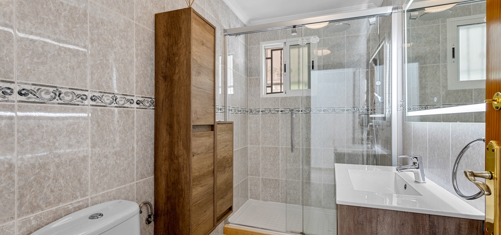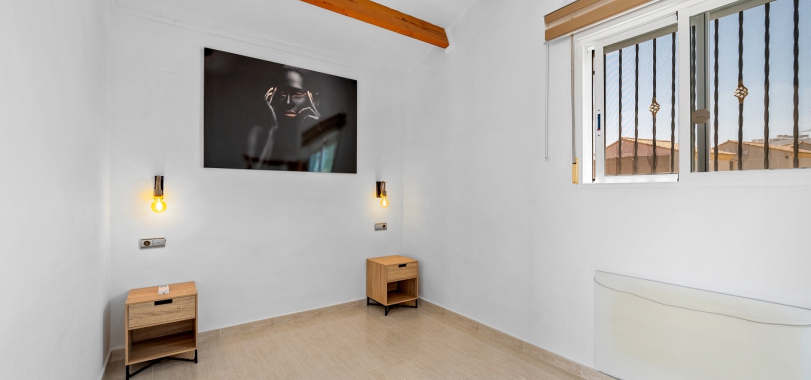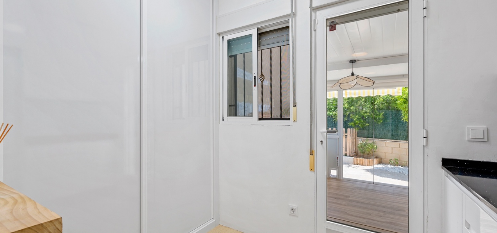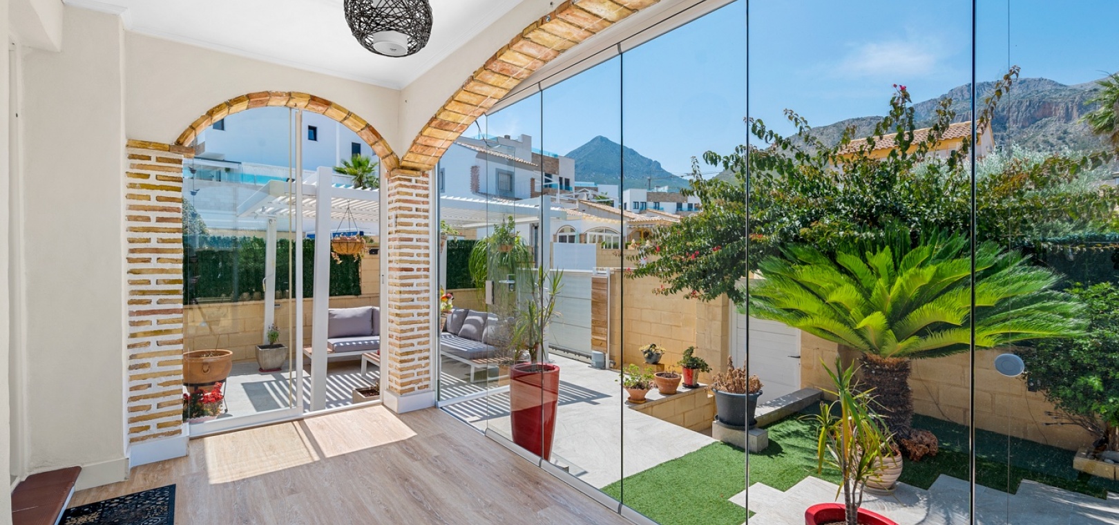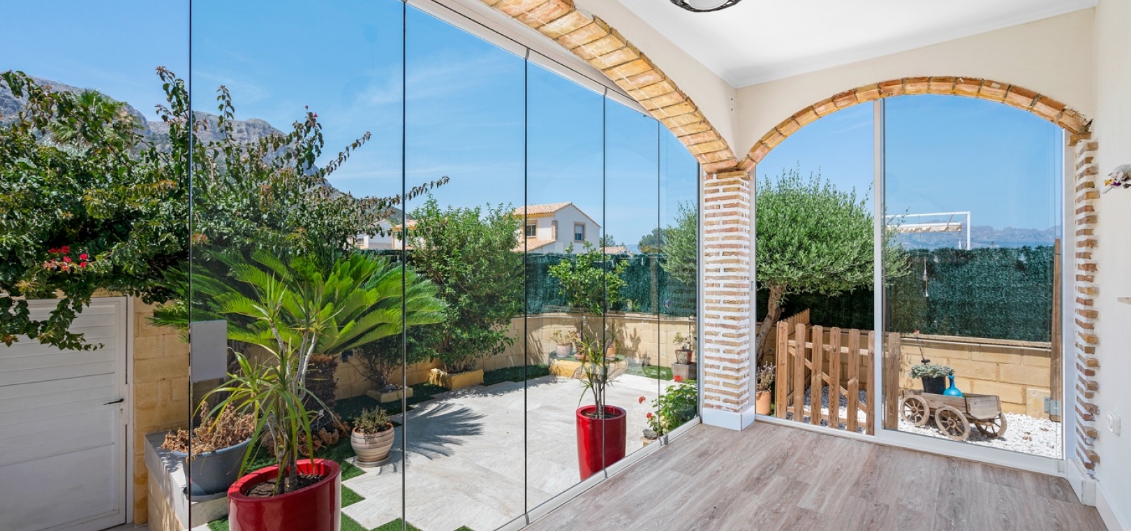 ExtérieurLa villa dispose d’un charmant jardin et d’une terrasse vitrée à l’avant. Dans le jardin avant, il y a également une zone de stationnement couverte, actuellement utilisée comme espace salon. Sur le côté de la maison, se trouve un débarras. Une autre terrasse vitrée se trouve dans le jardin arrière. Dans cette partie du jardin, on trouve également une douche extérieure et de l’espace pour un autre coin salon.À l’étage, il y a une terrasse avec vue sur la mer.
