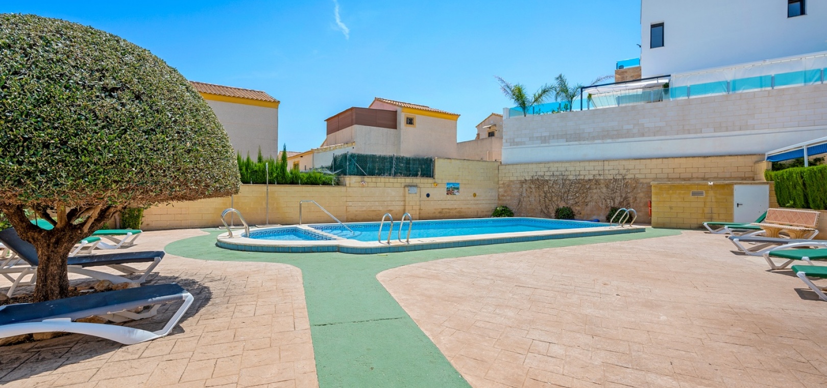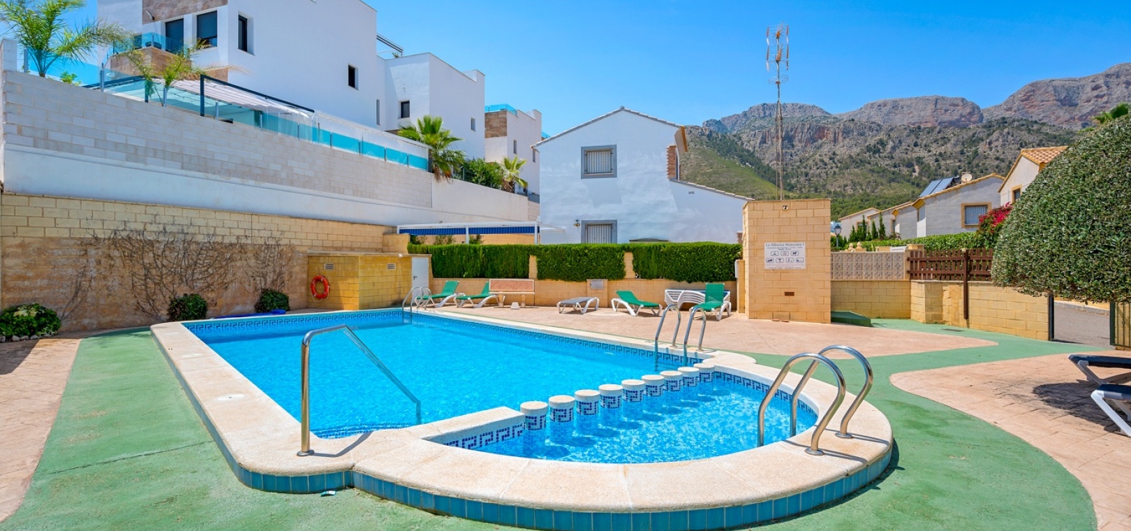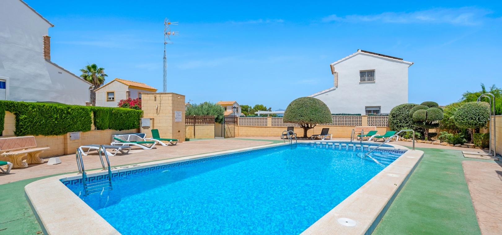 La villa fait partie d’une communauté, et juste à côté de la maison se trouve une belle piscine commune avec espace de détente.