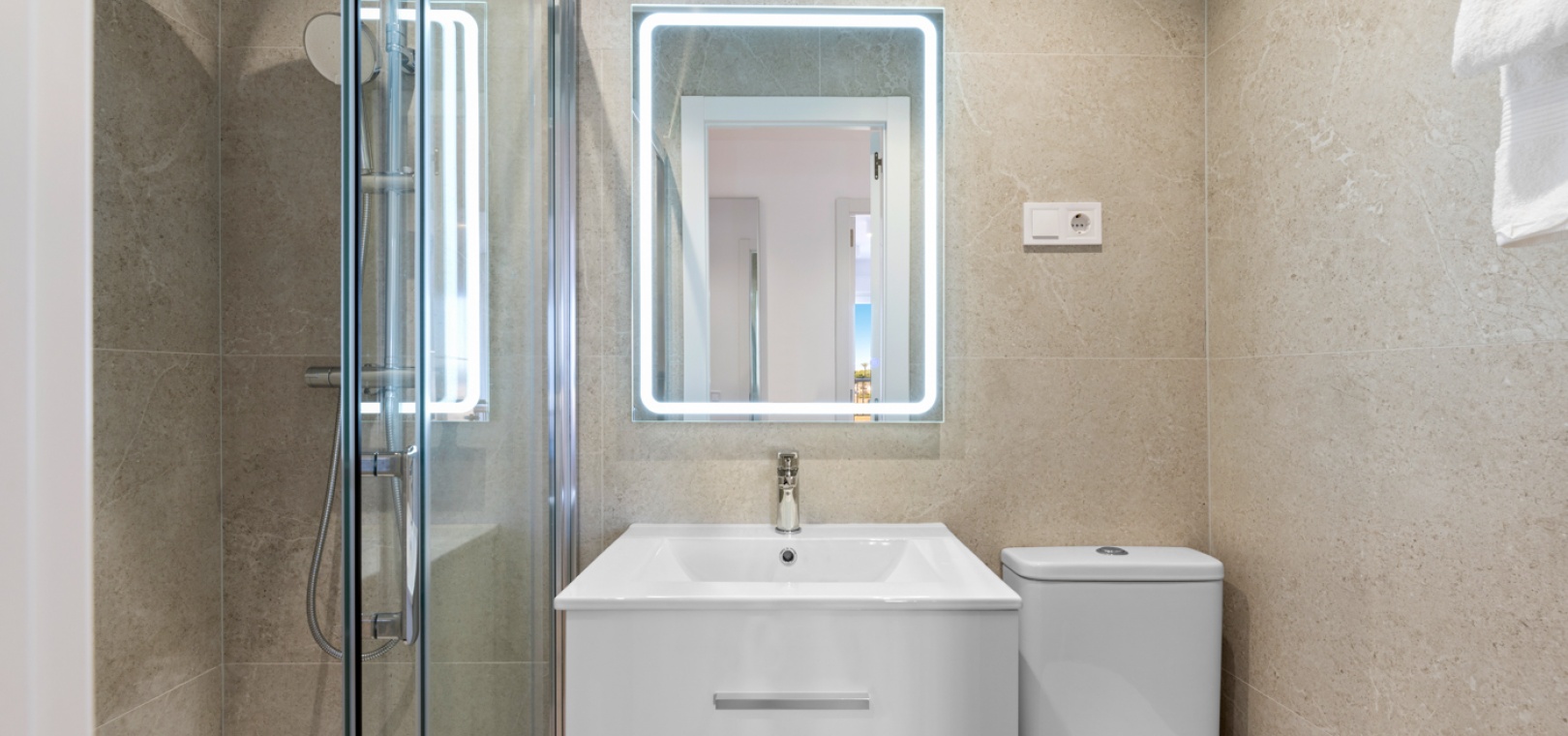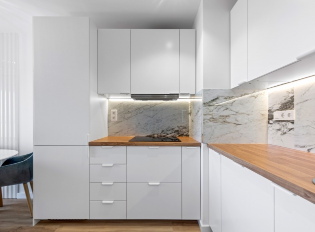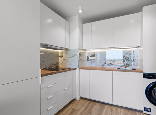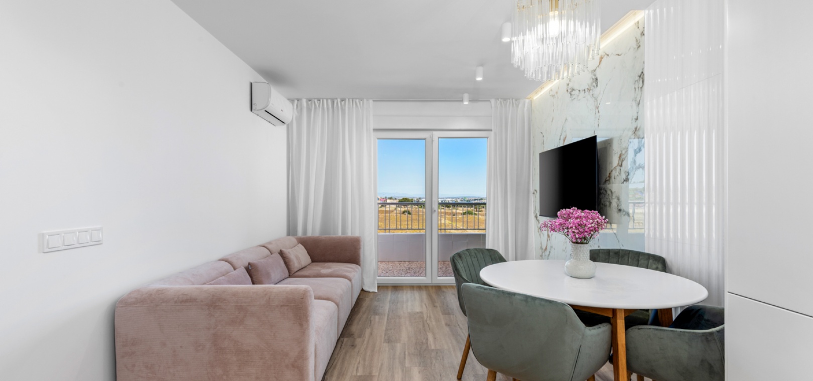 Salon moderne et ouvert Pénétrez dans un intérieur lumineux et spacieux, ouvert sur l'extérieur, maximisant la lumière naturelle. L'appartement comprend une entrée, un confortable salon-salle à manger et une cuisine élégante, tous parfaitement reliés entre eux pour une vie en toute simplicité. Depuis le salon, des portes-fenêtres coulissantes s'ouvrent sur un balcon privé offrant une vue imprenable sur la mer, idéal pour un café matinal ou un moment de détente en soirée.