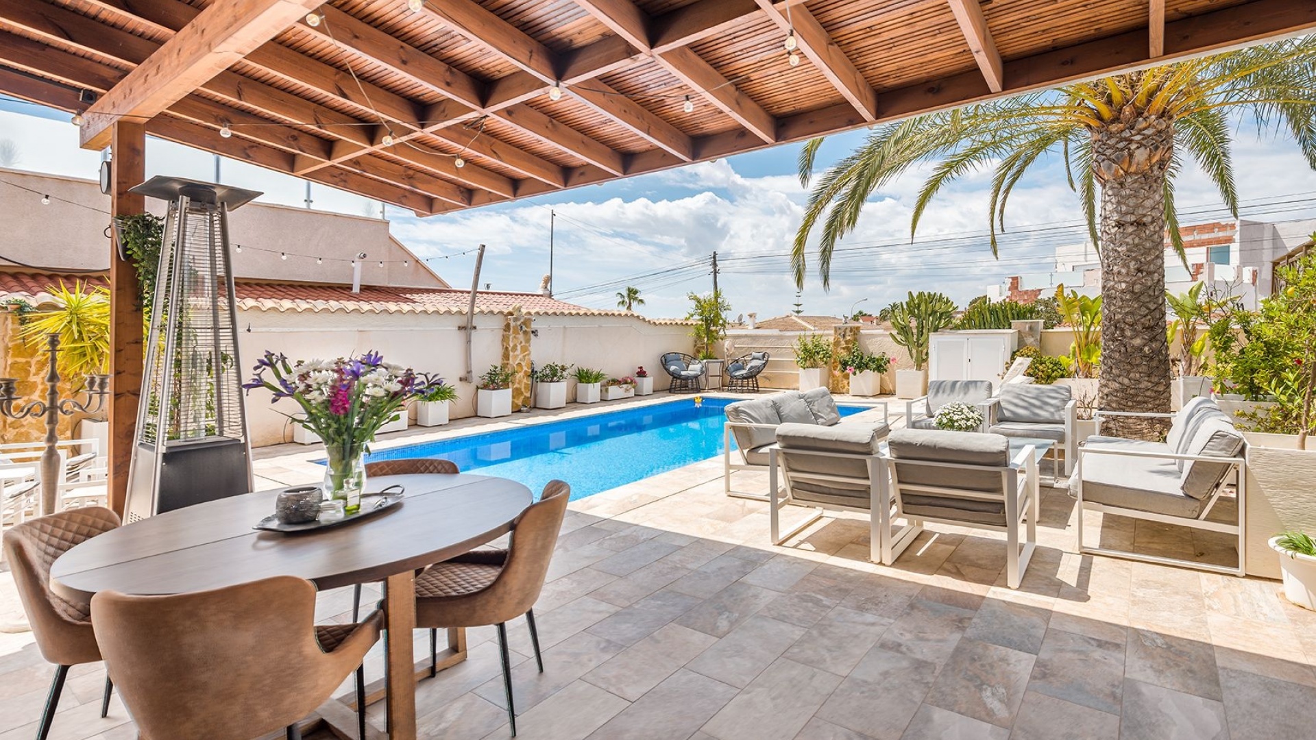 Découvrez la maison de vos rêves au cœur de Ciudad Quesada avec cette superbe villa de luxe entièrement rénovée, alliant à la perfection élégance moderne, confort et vie en plein air. Soigneusement rénovée en 2023, cette spacieuse propriété offre un cadre de vie exceptionnel à deux pas du golf, des commodités et de la magnifique côte espagnole. D'une superficie d'environ 139 m², cette villa, parfaitement agencée et construite sur un généreux terrain de 540 m², comprend 4 chambres, dont une suite parentale avec dressing et salle de bain attenante avec chauffage au sol, ainsi qu'une chambre séparée à l'étage avec balcon privé offrant une vue panoramique sur les lacs salés et la mer. La maison comprend 3 salles de bain, une cuisine moderne avec de grandes portes coulissantes s'ouvrant harmonieusement sur la terrasse couverte, un salon TV lumineux et un bureau dédié, parfait pour le style de vie actuel. Profitez de votre havre de paix privé avec un grand jardin exposé sud-ouest, une piscine d'eau salée de 4 x 8 m et une cuisine d'été équipée d'un réfrigérateur, d'un congélateur et d'un lave-vaisselle, idéale pour recevoir. Les vastes espaces extérieurs comprennent un bar au bord de la piscine, un coin repas, des chaises longues et une douche extérieure, le tout niché dans un magnifique jardin paysager agrémenté d'arbres fruitiers matures tels que des mandariniers, des orangers, des kiwis, des citrons verts, des fruits de la passion et des manguiers. L'arrosage automatique facilite l'entretien. La villa est équipée de la climatisation centrale, de climatiseurs split supplémentaires pour une climatisation optimale et du chauffage au sol dans les salles de bains et la cuisine. Un parking sécurisé pour deux voitures avec portail automatique ajoute à la commodité et à la sécurité. Située à seulement 1,5 km du centre-ville animé de Ciudad Quesada et à environ 2 km du parcours de golf de La Marquesa, cette maison offre un cadre paisible avec un accès facile aux commerces, restaurants, bars, salles de sport et à une bodega renommée. Les superbes plages sont à moins de 8 km et l'aéroport d'Alicante est à 38 km. Cette luxueuse villa entièrement rénovée allie design contemporain, espaces de vie fonctionnels et aménagements extérieurs exceptionnels, ce qui en fait une maison idéale pour les acheteurs exigeants en quête de confort, de style et d'un emplacement privilégié. Bienvenue dans votre nouveau havre de paix : votre parfaite retraite espagnole vous attend !