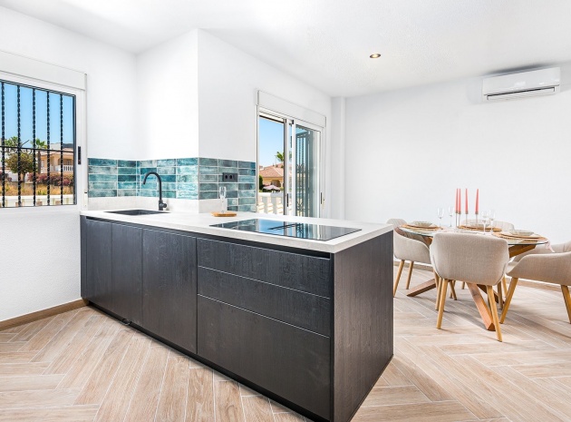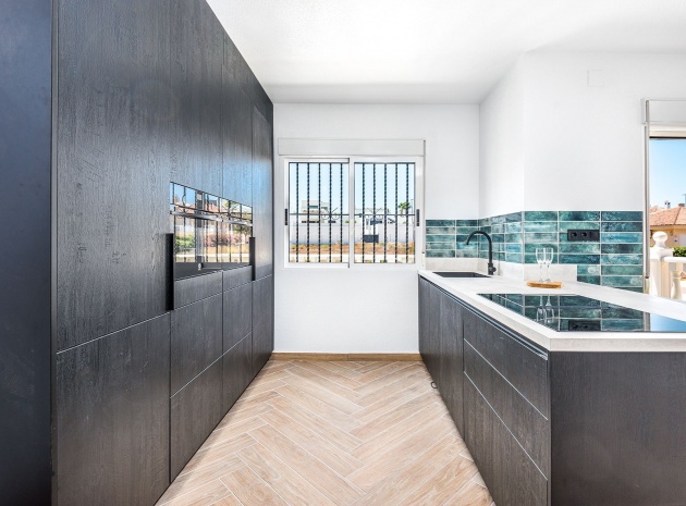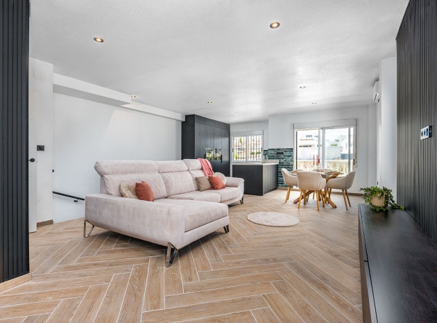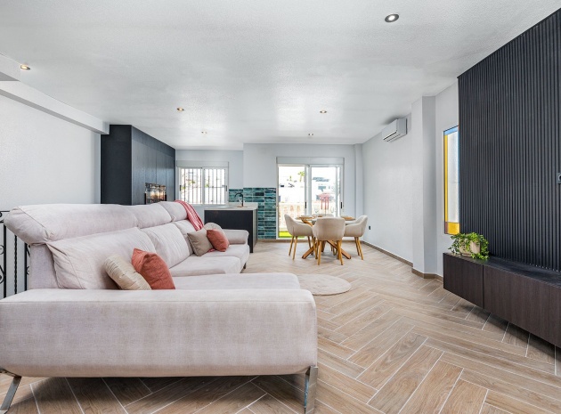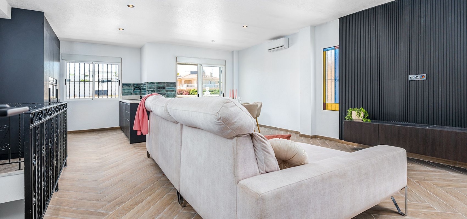 L'étage supérieur comprend un lumineux espace ouvert comprenant salon, salle à manger et cuisine, avec électroménagers intégrés et climatisation. Le balcon exposé sud est idéal pour prendre un café le matin ou dîner en plein air au soleil. Une élégante buanderie complète cet étage.