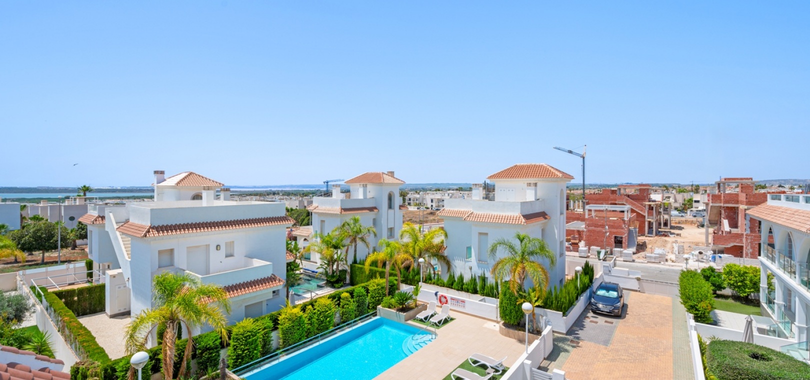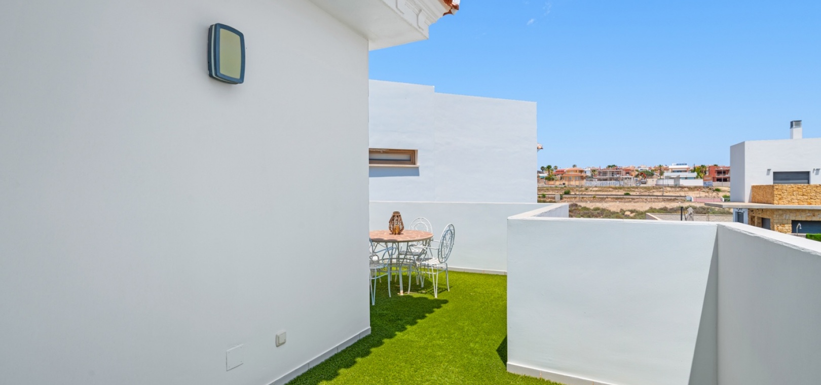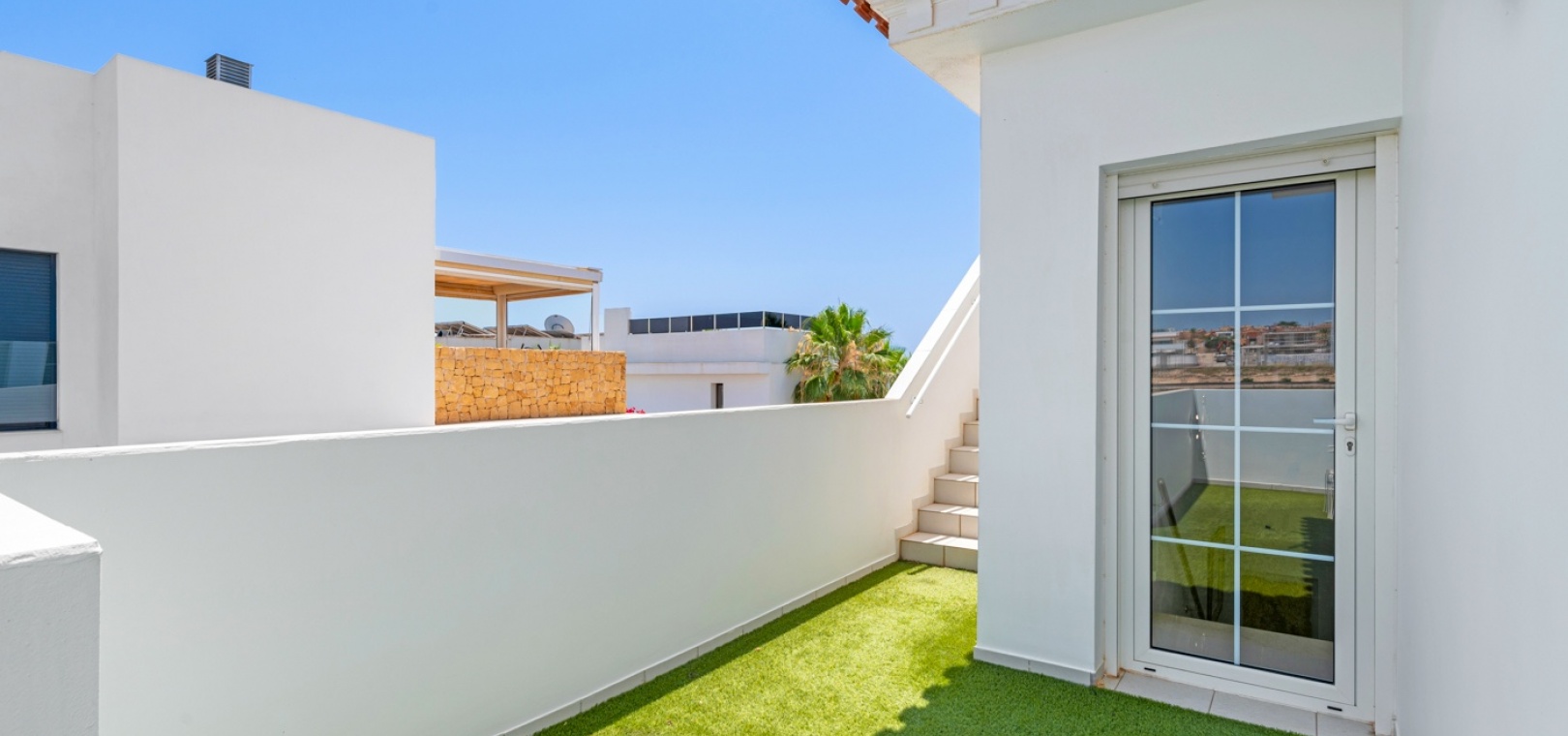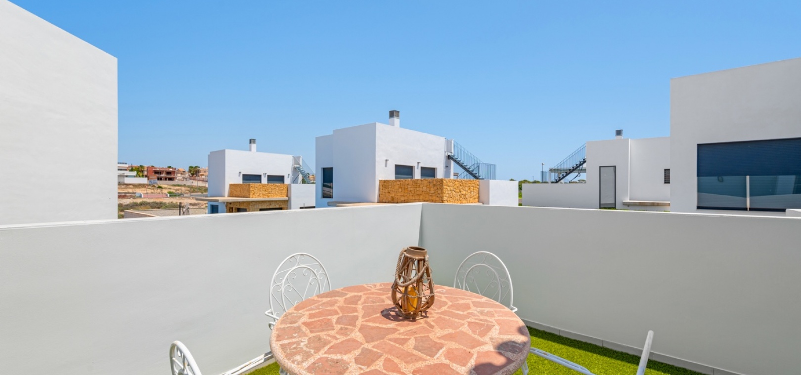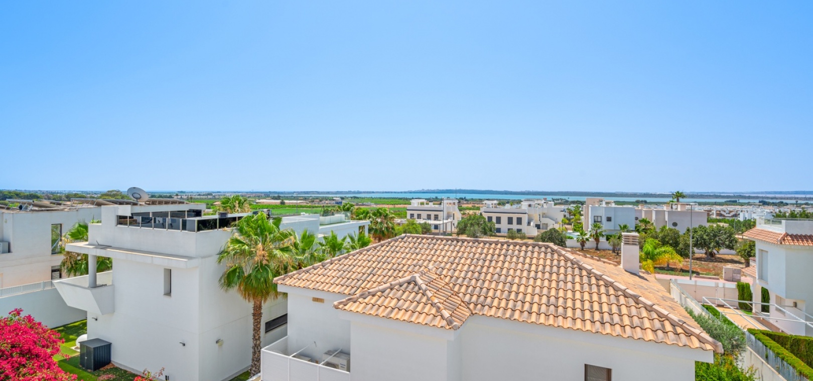 Située sur un terrain privé de 350 m², la villa dispose de 122 m² de surface construite sur deux étages, ainsi que d'un solarium sur le toit de 45 m² accessible indépendamment de la terrasse supérieure, parfait pour bronzer, se détendre ou se divertir.