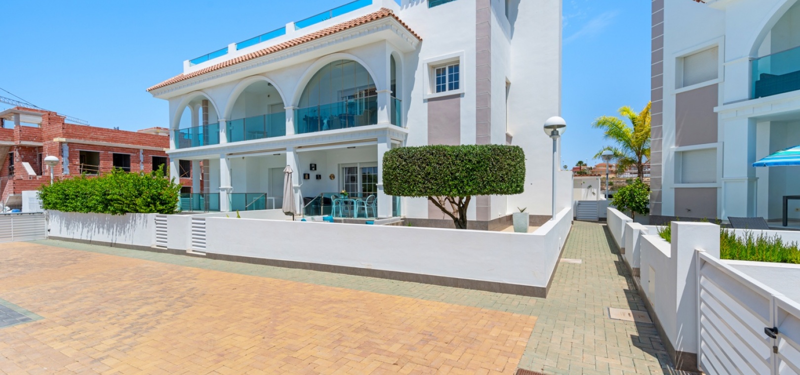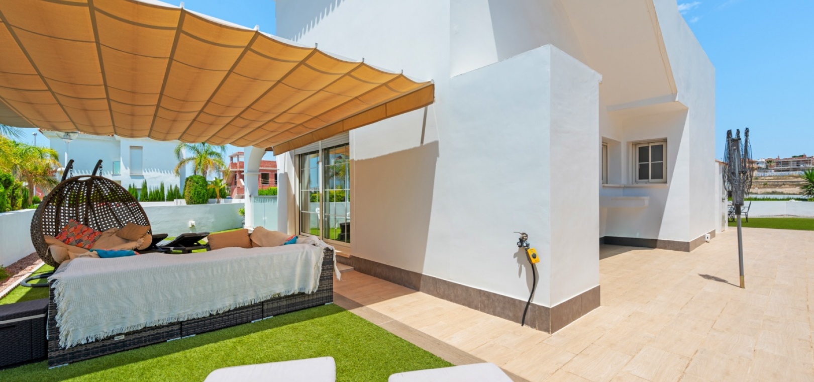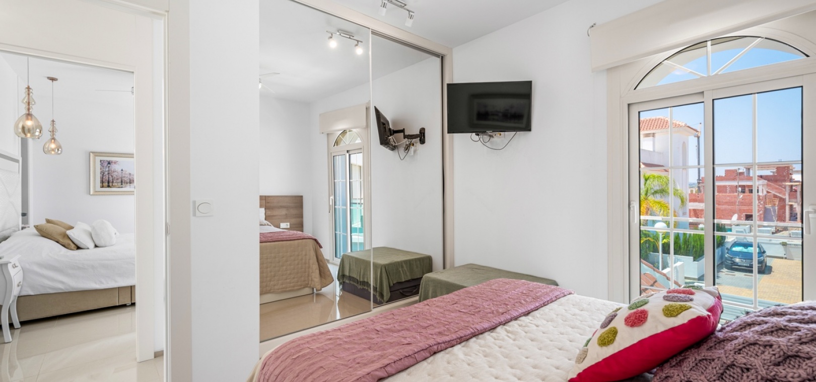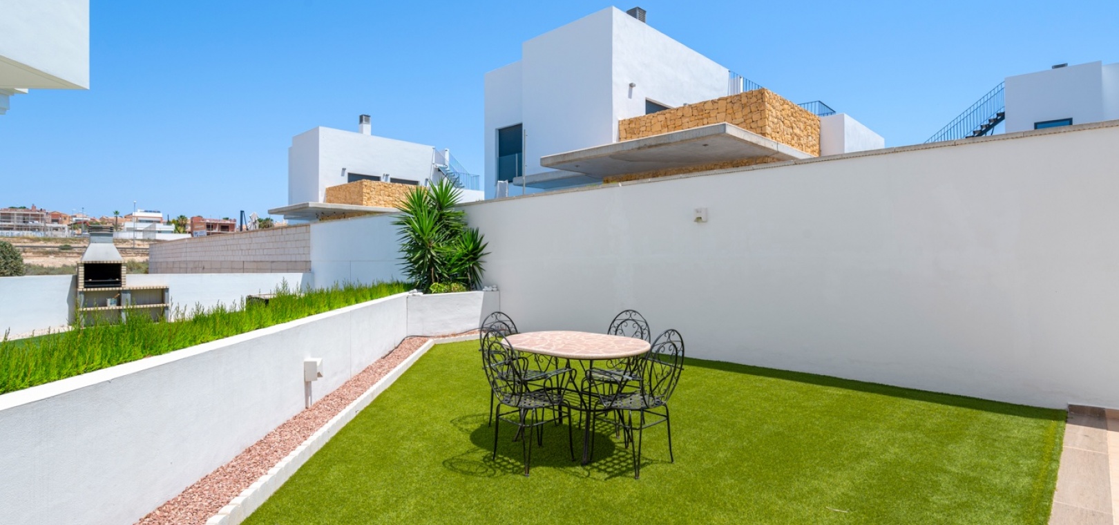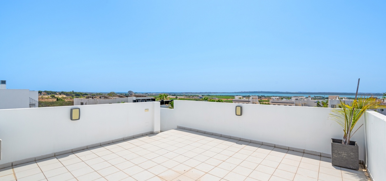 Située sur un terrain privé de 350 m², la villa dispose de 122 m² de surface construite sur deux étages, ainsi que d'un solarium sur le toit de 45 m² accessible indépendamment de la terrasse supérieure, parfait pour bronzer, se détendre ou se divertir.