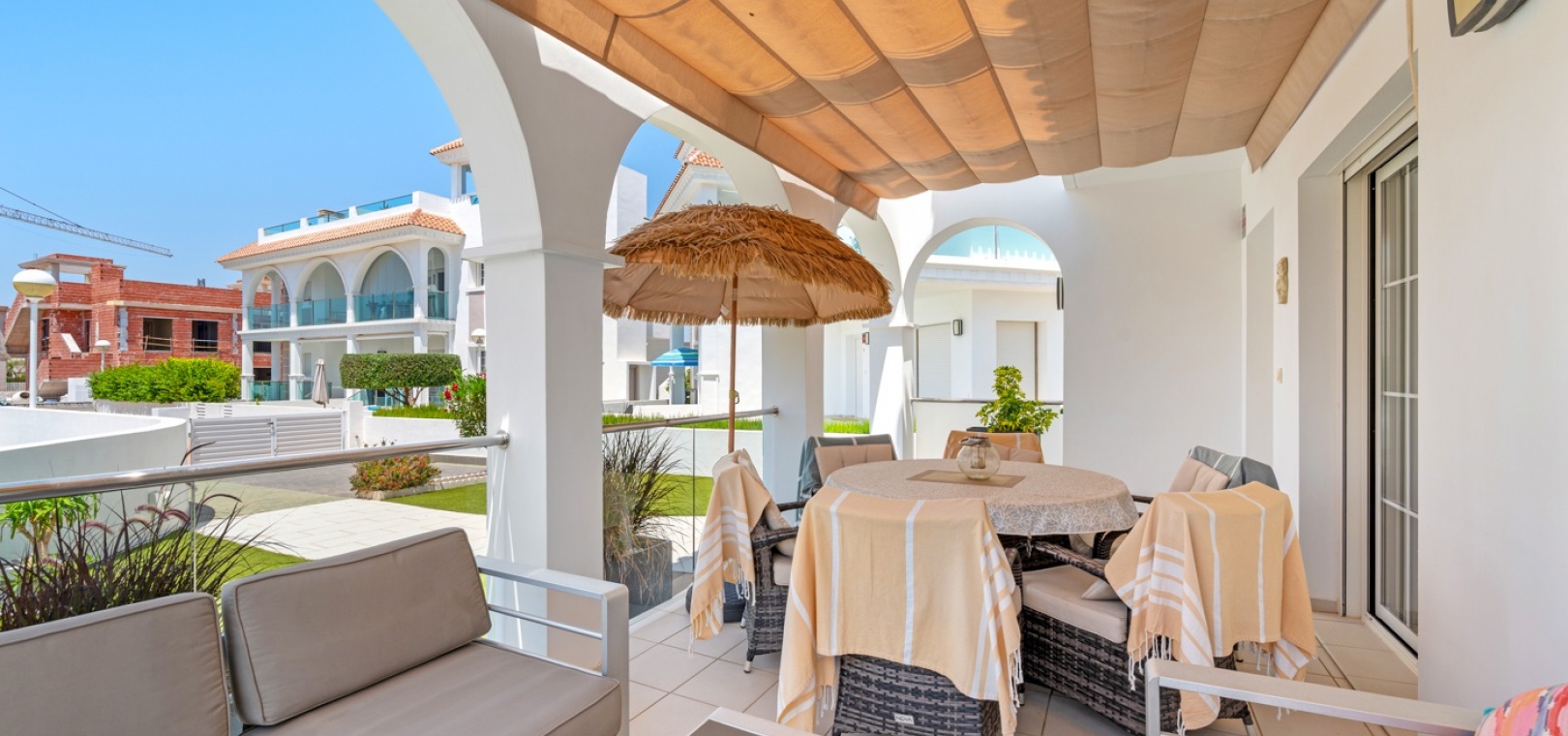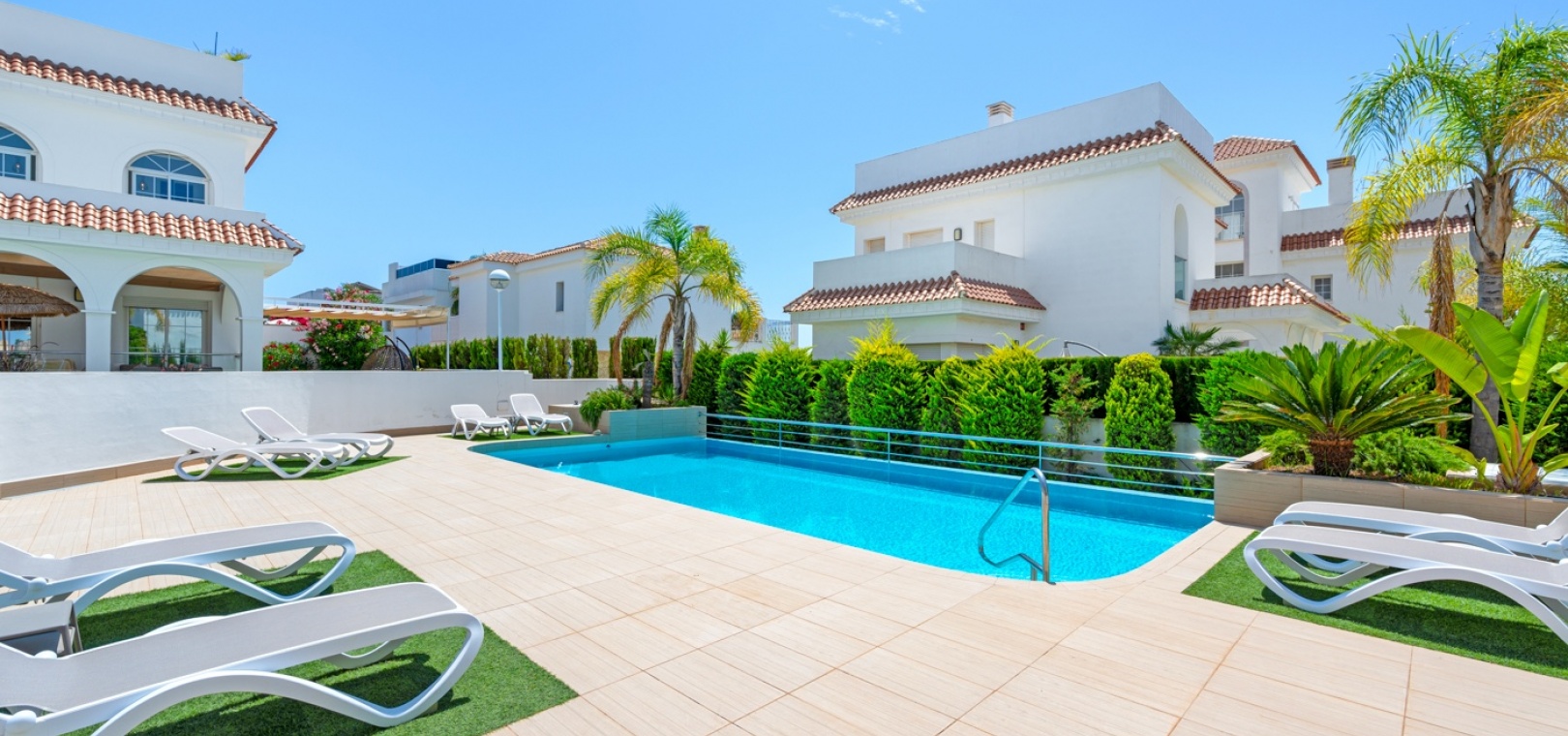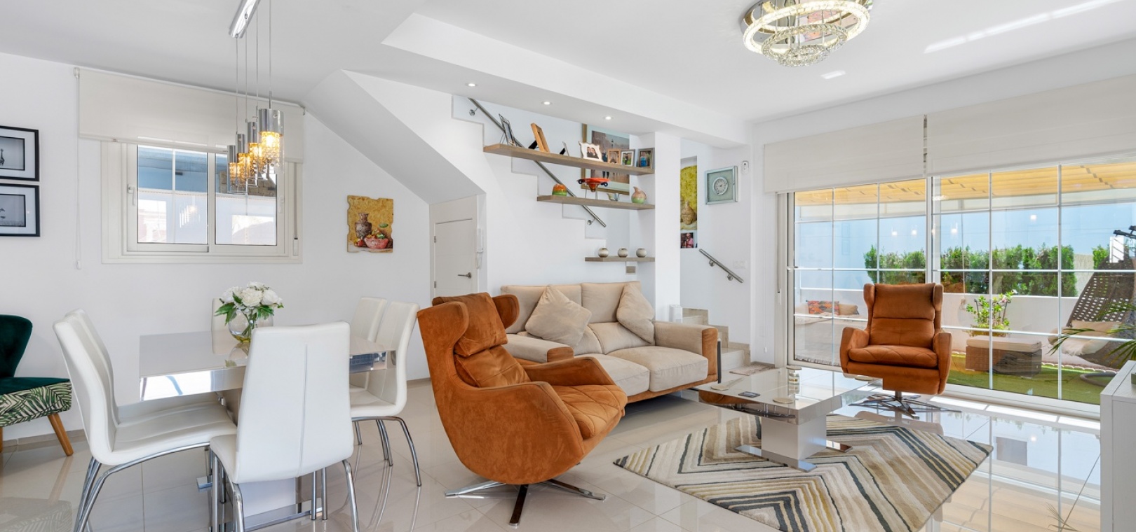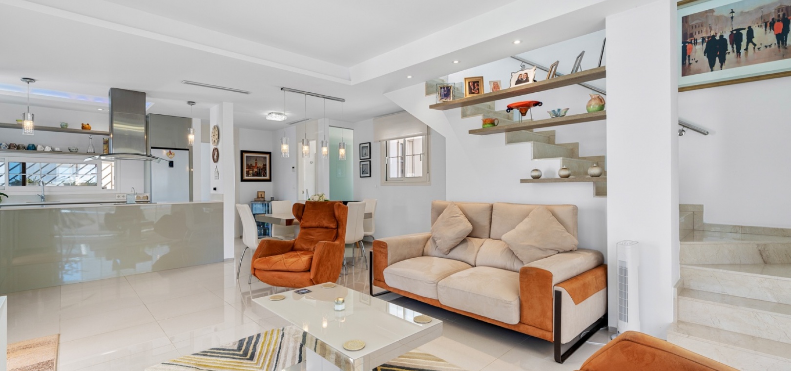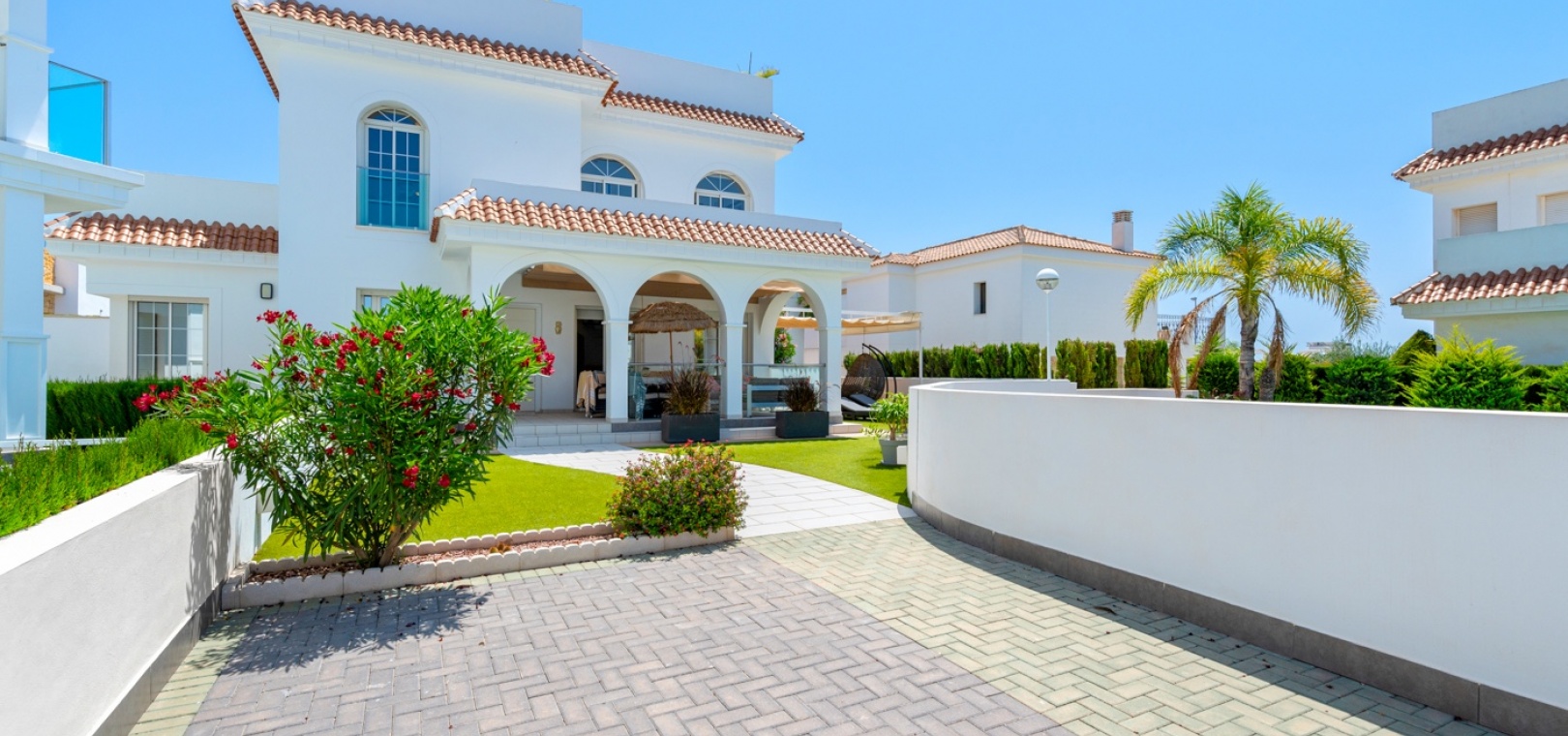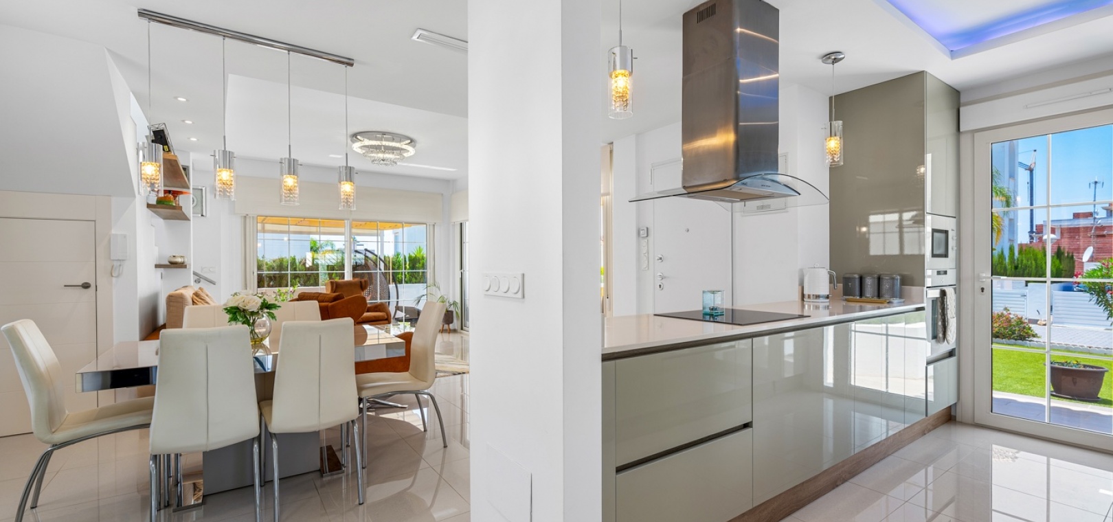 Située sur un terrain privé de 350 m², la villa dispose de 122 m² de surface construite sur deux étages, ainsi que d'un solarium sur le toit de 45 m² accessible indépendamment de la terrasse supérieure, parfait pour bronzer, se détendre ou se divertir.