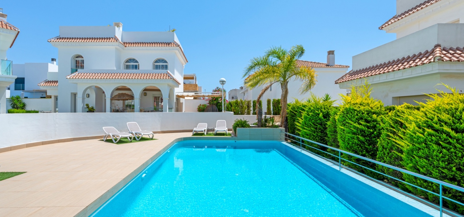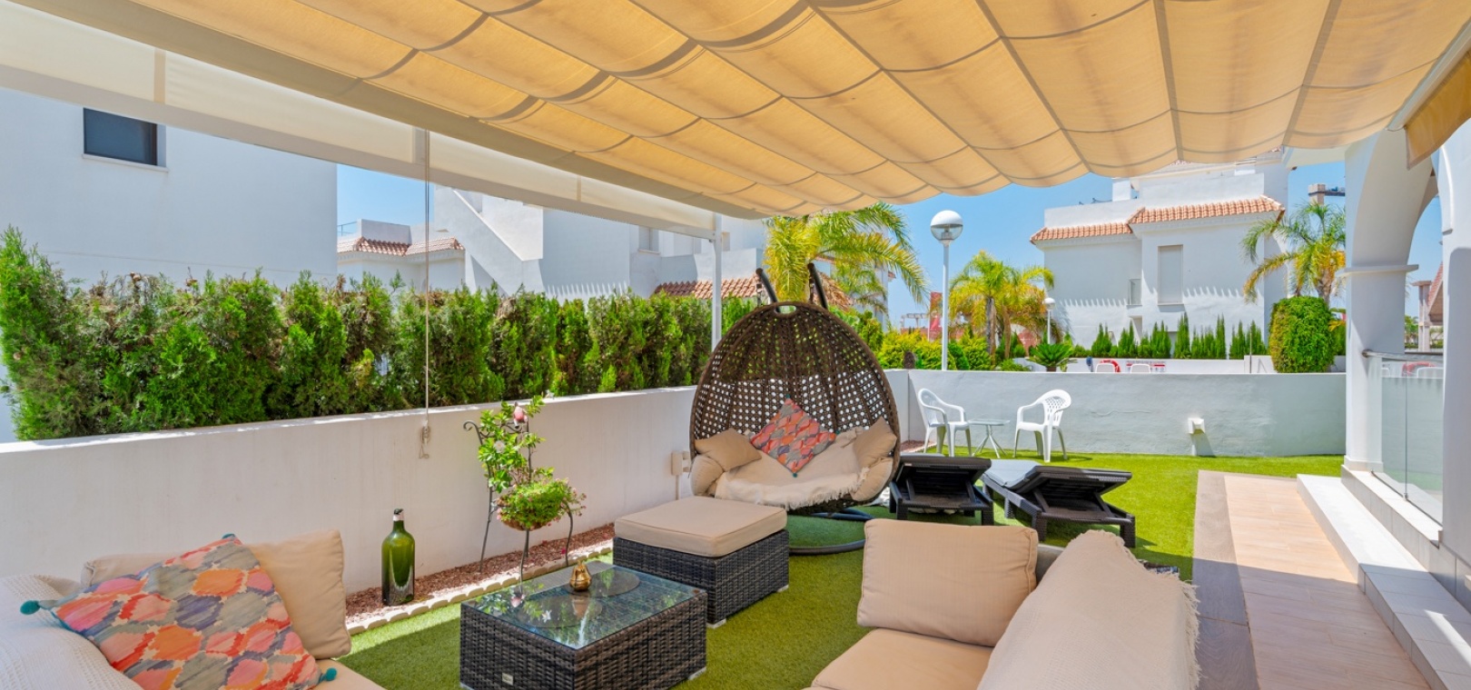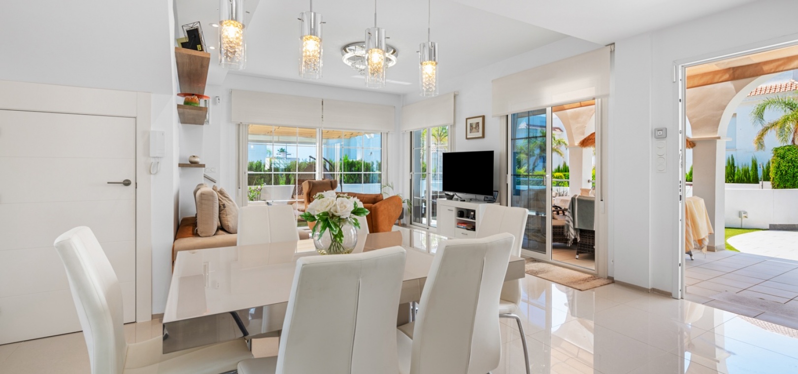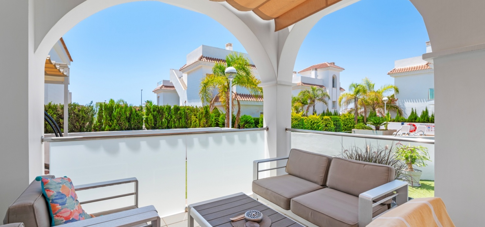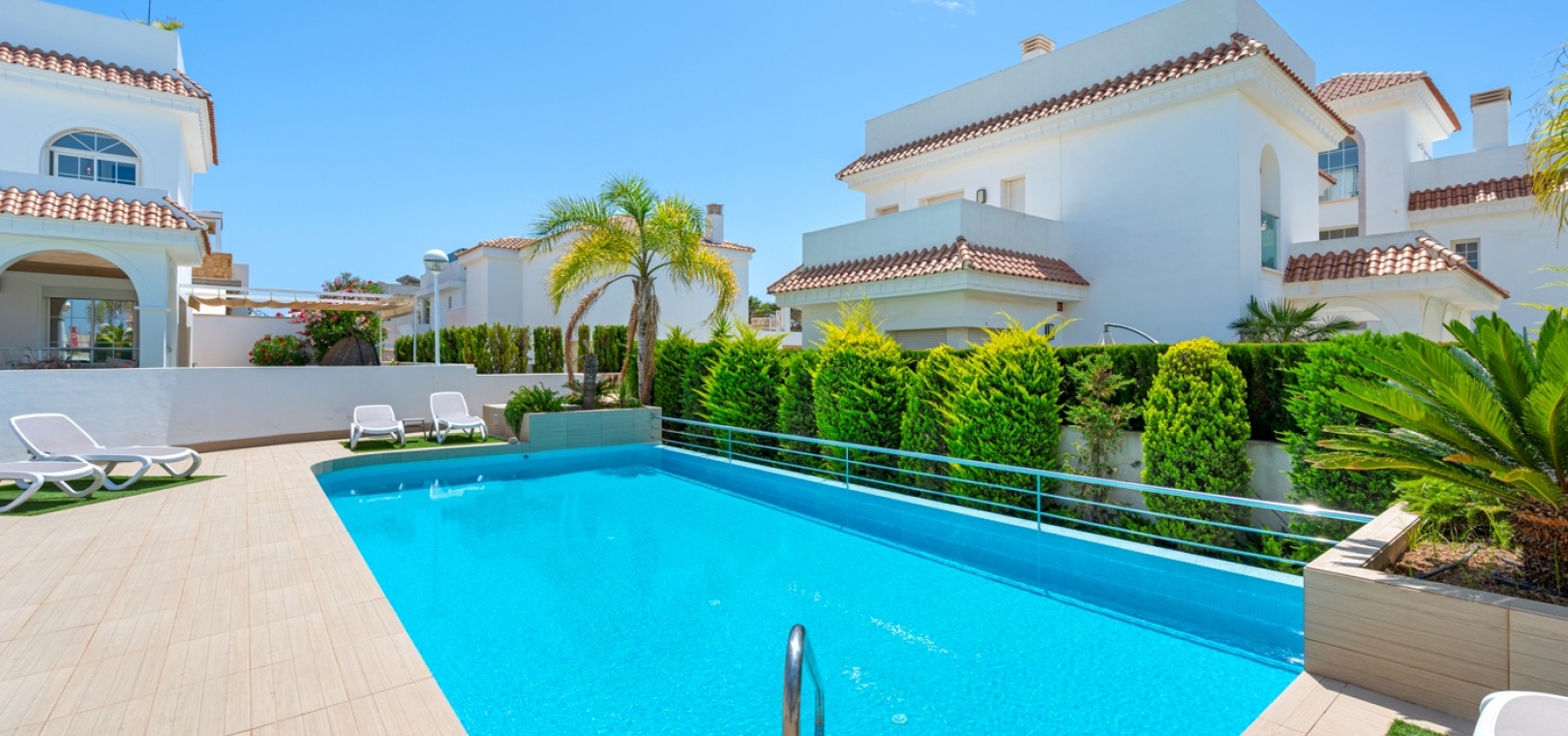 Située sur un terrain privé de 350 m², la villa dispose de 122 m² de surface construite sur deux étages, ainsi que d'un solarium sur le toit de 45 m² accessible indépendamment de la terrasse supérieure, parfait pour bronzer, se détendre ou se divertir.