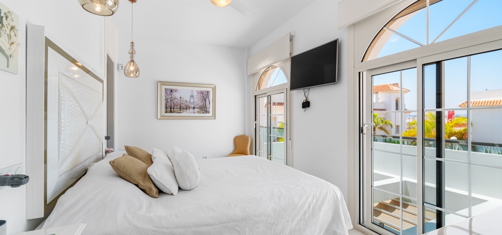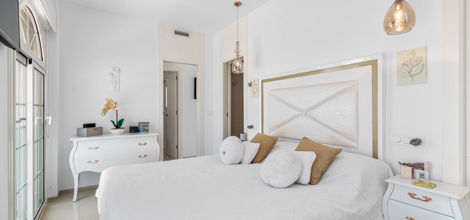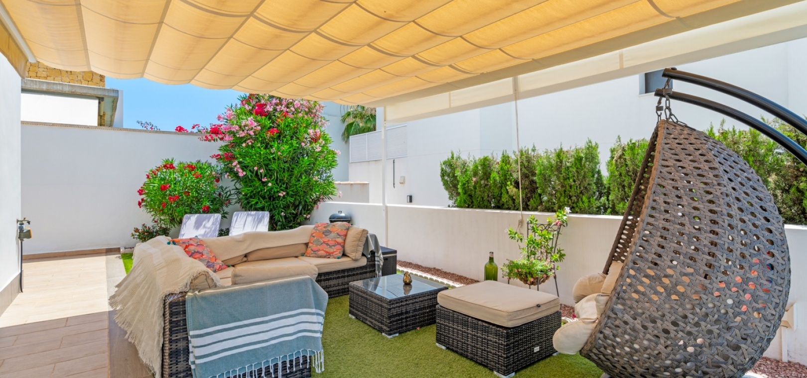 Rez-de-chaussée: Salon et salle à manger lumineux et ouvert avec une cuisine entièrement équipée Chambre double avec placard intégré Salle de bain élégante avec douche Buanderie et grand espace de rangement Accès direct à un jardin privé qui entoure la maison, comprenant une terrasse couverte idéale pour manger ou se détendre en plein air Étage supérieur : Deux chambres doubles spacieuses, toutes deux avec salle de bains privative Suite parentale avec dressing et terrasse privée menant au solarium Accès indépendant au solarium sur le toit offrant une vue panoramique et du soleil toute la journée Points forts supplémentaires : Climatisation gainable avec commandes au sol indépendantes Parking privé hors route Vendu entièrement meublé et prêt à emménager