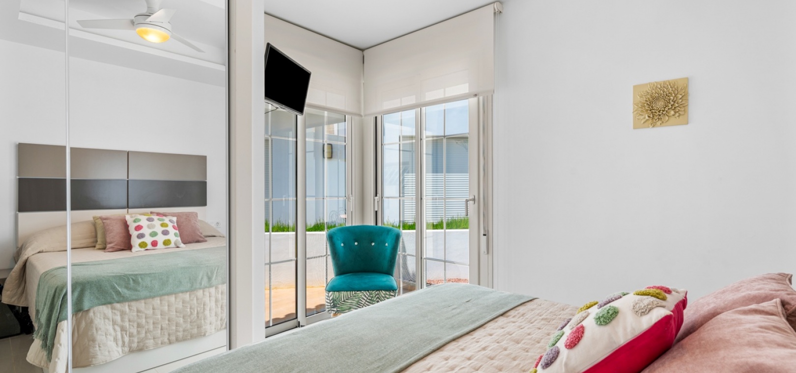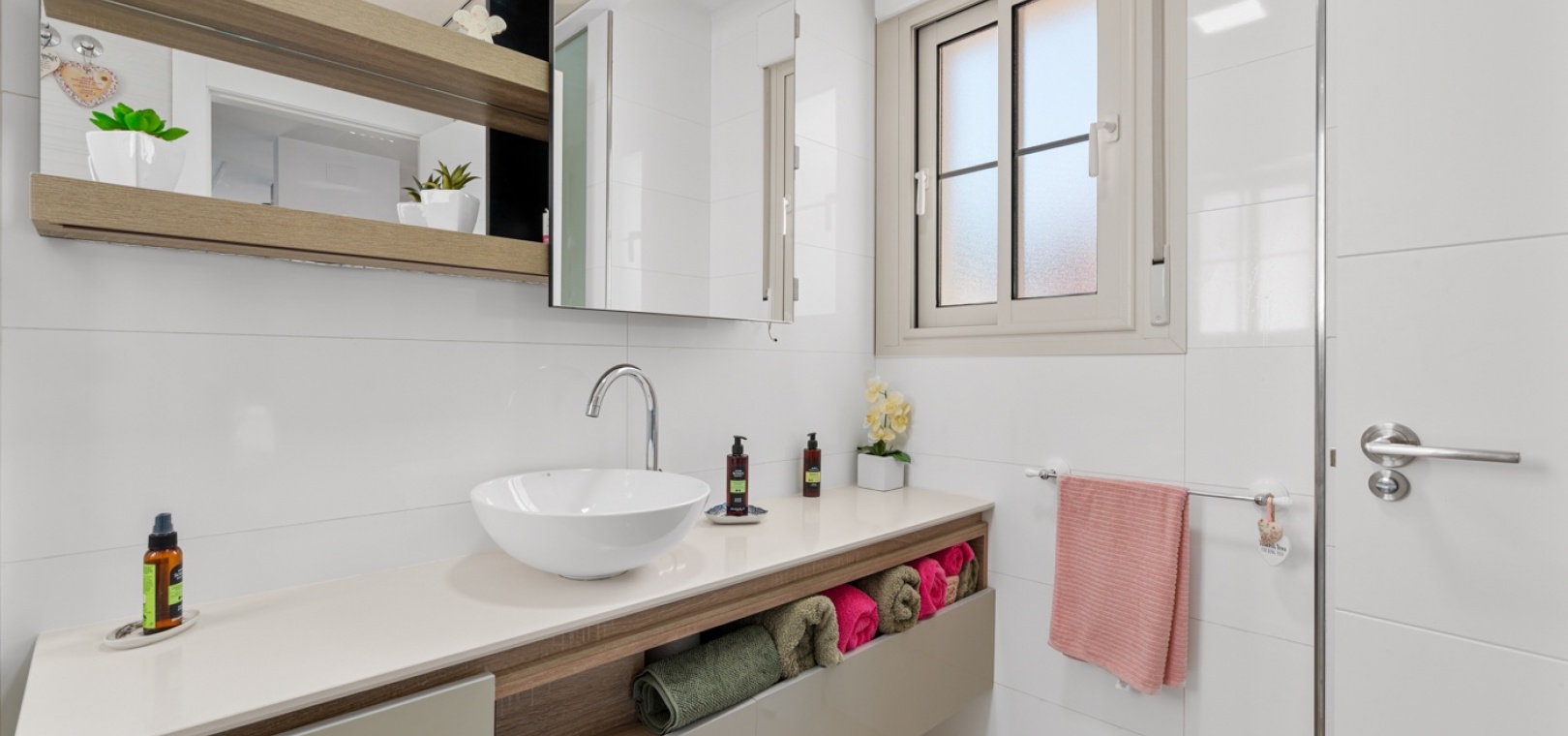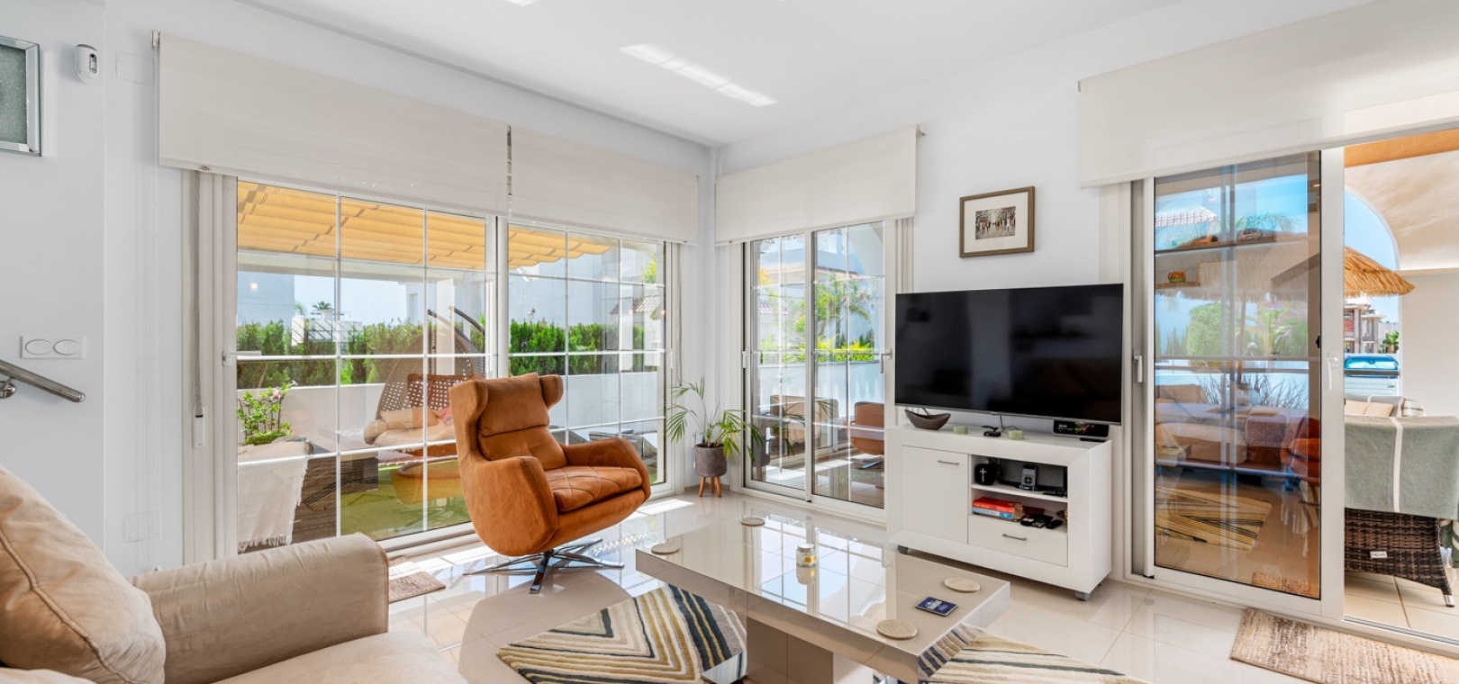 Rez-de-chaussée: Salon et salle à manger lumineux et ouvert avec une cuisine entièrement équipée Chambre double avec placard intégré Salle de bain élégante avec douche Buanderie et grand espace de rangement Accès direct à un jardin privé qui entoure la maison, comprenant une terrasse couverte idéale pour manger ou se détendre en plein air Étage supérieur : Deux chambres doubles spacieuses, toutes deux avec salle de bains privative Suite parentale avec dressing et terrasse privée menant au solarium Accès indépendant au solarium sur le toit offrant une vue panoramique et du soleil toute la journée Points forts supplémentaires : Climatisation gainable avec commandes au sol indépendantes Parking privé hors route Vendu entièrement meublé et prêt à emménager