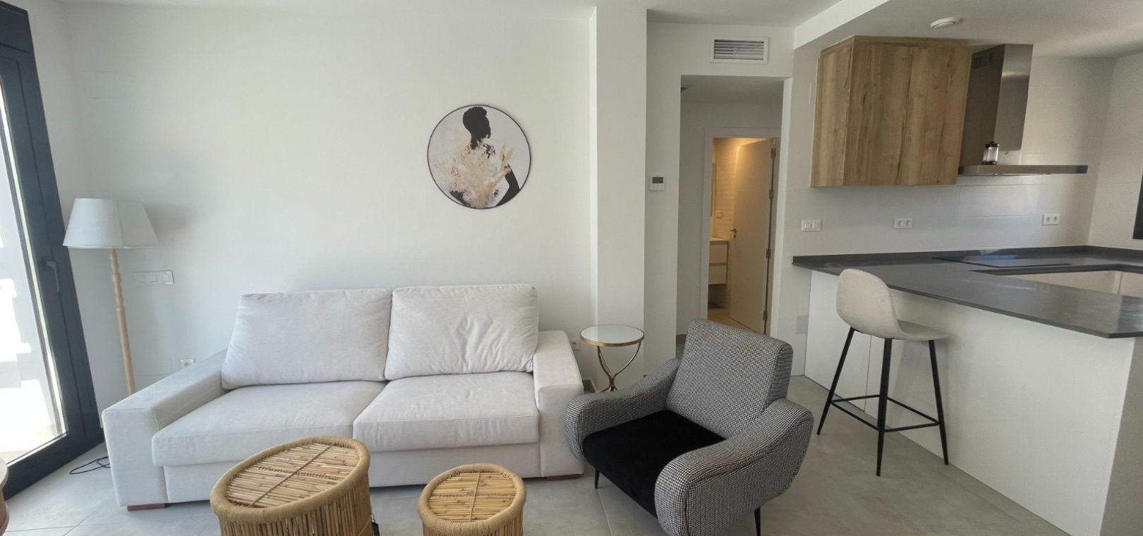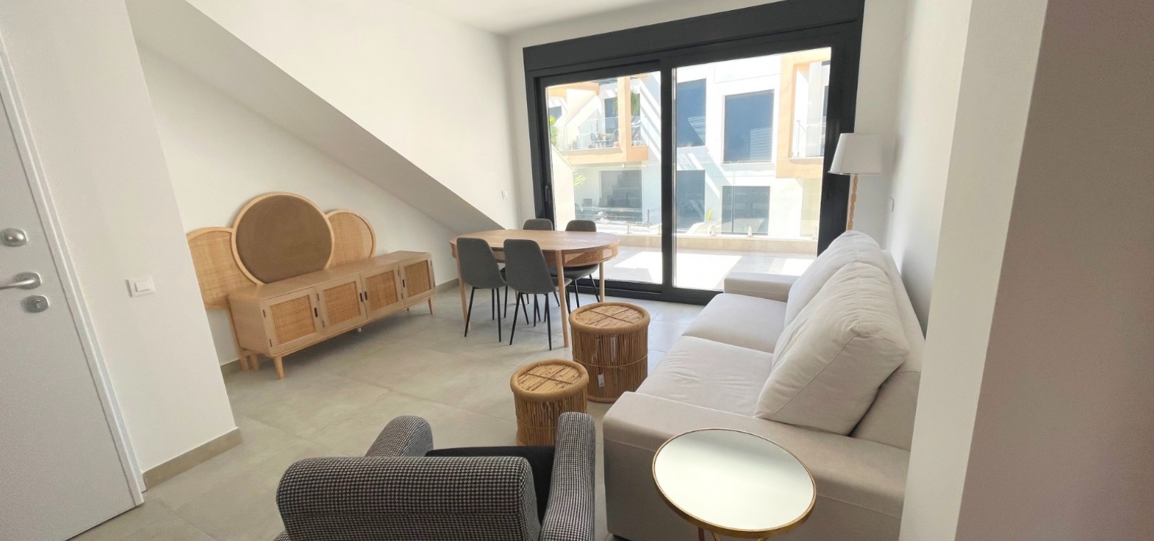 Cet appartement d'angle de deux chambres, exposé plein sud et situé au dernier étage, est situé à 15 minutes à pied d'une grande chaîne de supermarchés, du magasin de meubles JYSK et de nombreux cafés, bars et restaurants. Le parcours de golf de Villamartin est à seulement 5 minutes en voiture, tandis que le célèbre centre commercial La Zenia Boulevard et les magnifiques plages d'Orihuela Costa sont à seulement 10 minutes. Construit en 2023, cet élégant appartement au premier étage bénéficie d'un design moderne et d'un intérieur lumineux. Le séjour ouvert est doté de doubles portes coulissantes donnant sur une terrasse partiellement couverte avec vue sur la piscine commune magnifiquement aménagée. La spacieuse cuisine équipée offre un grand espace de travail et de rangement, ainsi qu'un bar à petit-déjeuner. L'appartement comprend deux chambres doubles, toutes deux avec placards intégrés, et deux élégantes salles de douche avec chauffage au sol, dont une attenante. L'impressionnant solarium privé de 60 m², accessible par la terrasse, offre un espace généreux pour bronzer, recevoir ou profiter de la vue. Les avantages supplémentaires comprennent la climatisation, un parking hors route et l'accès à une superbe piscine commune, le tout situé au cœur de la Costa Blanca Sud.